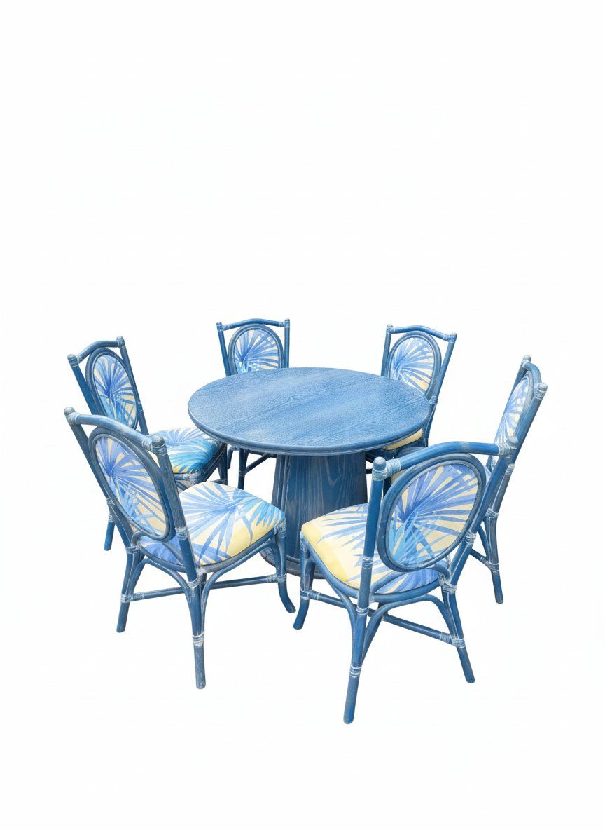Conjunto de mesa redonda de madera y bambú (110 cm diámetro) con sillas a juego y cojines tropicales. Estilo mediterráneo, ideal para exteriores y espacios con encanto natural.