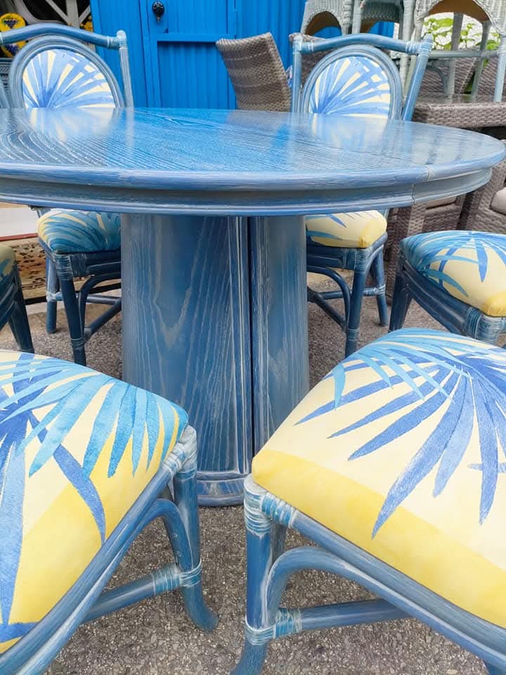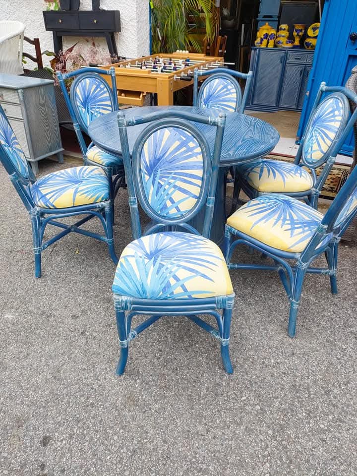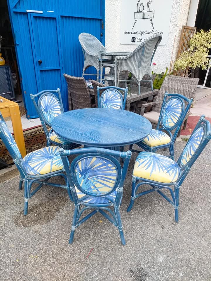 El acabado en azul lavado de la madera, combinado con el bambú natural, crea una estética mediterránea y boho chic, ideal para terrazas, patios, porches o comedores con estilo relajado. El conjunto está pensado para resistir el uso diario, con materiales duraderos y fáciles de mantener.