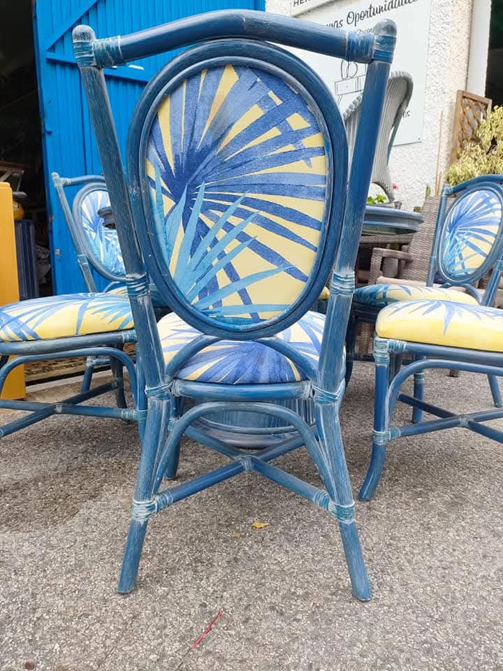 Este conjunto de mesa redonda y sillas está fabricado en madera y bambú, con un diseño fresco y tropical que aporta personalidad a cualquier espacio exterior o interior. La mesa de 110 cm de diámetro ofrece una superficie amplia y cómoda para comidas, reuniones o decoración, mientras que las sillas con respaldo curvo y cojines estampados de hojas de palmera en tonos azules y amarillos aportan un toque vibrante y veraniego.