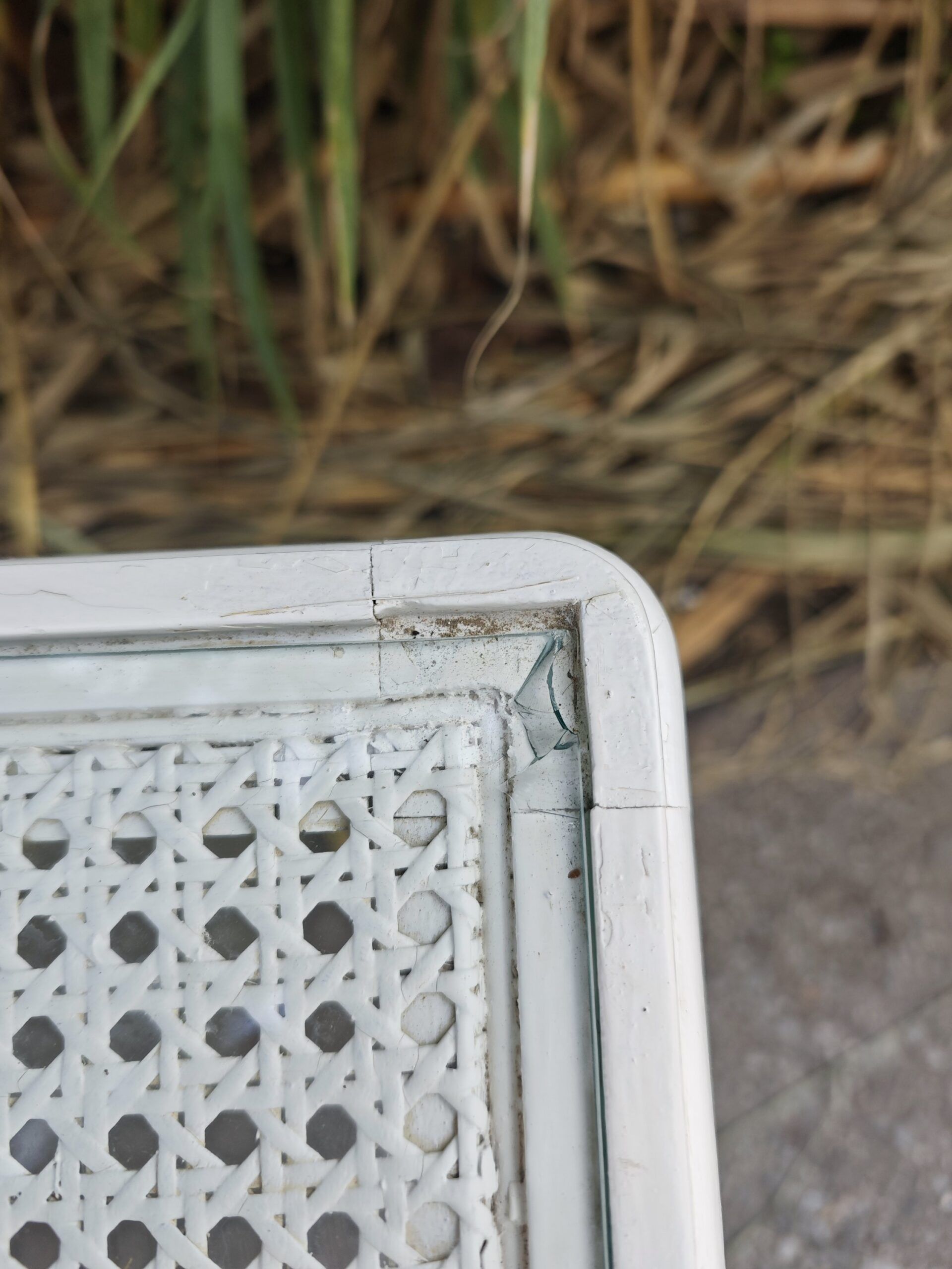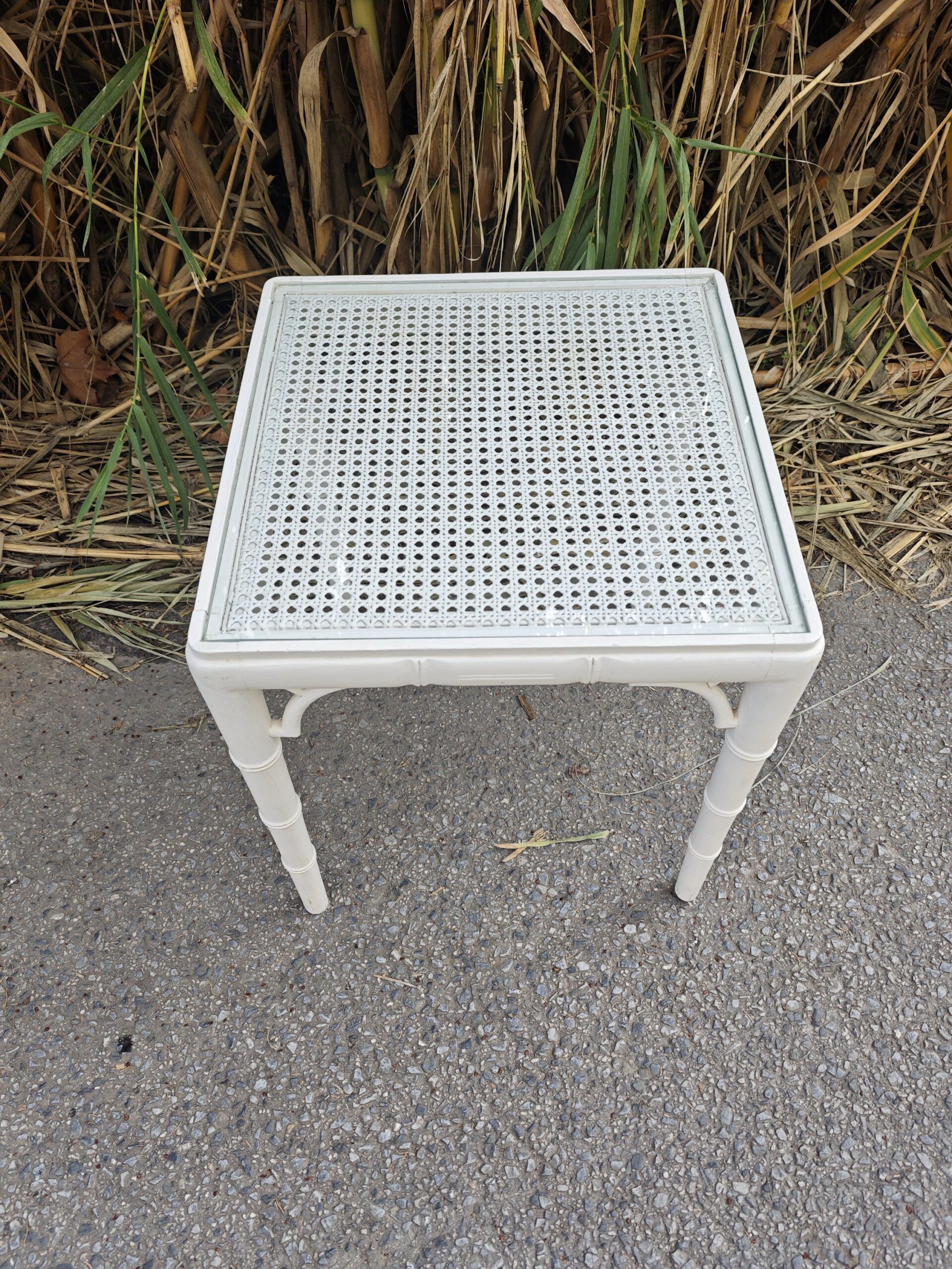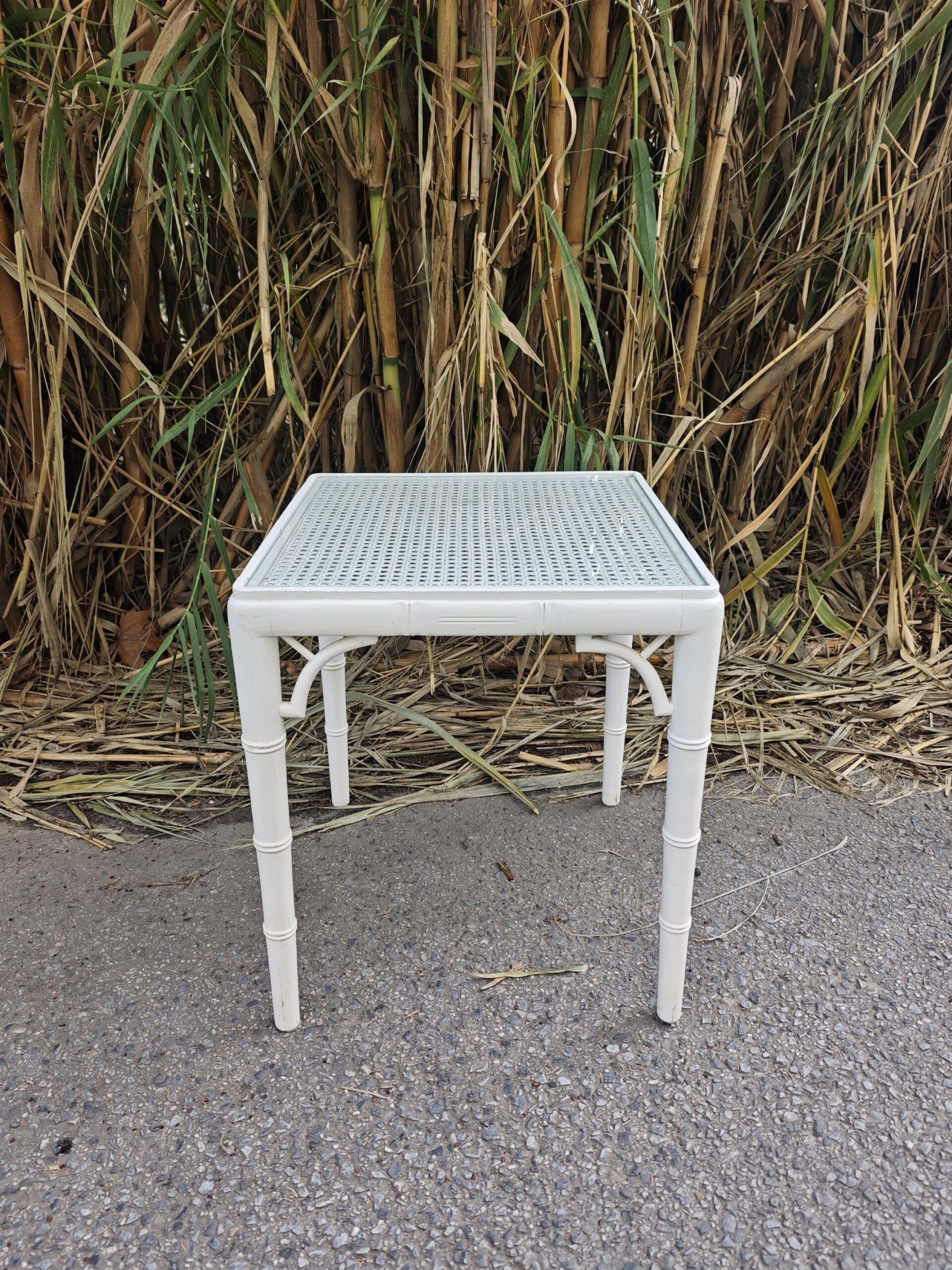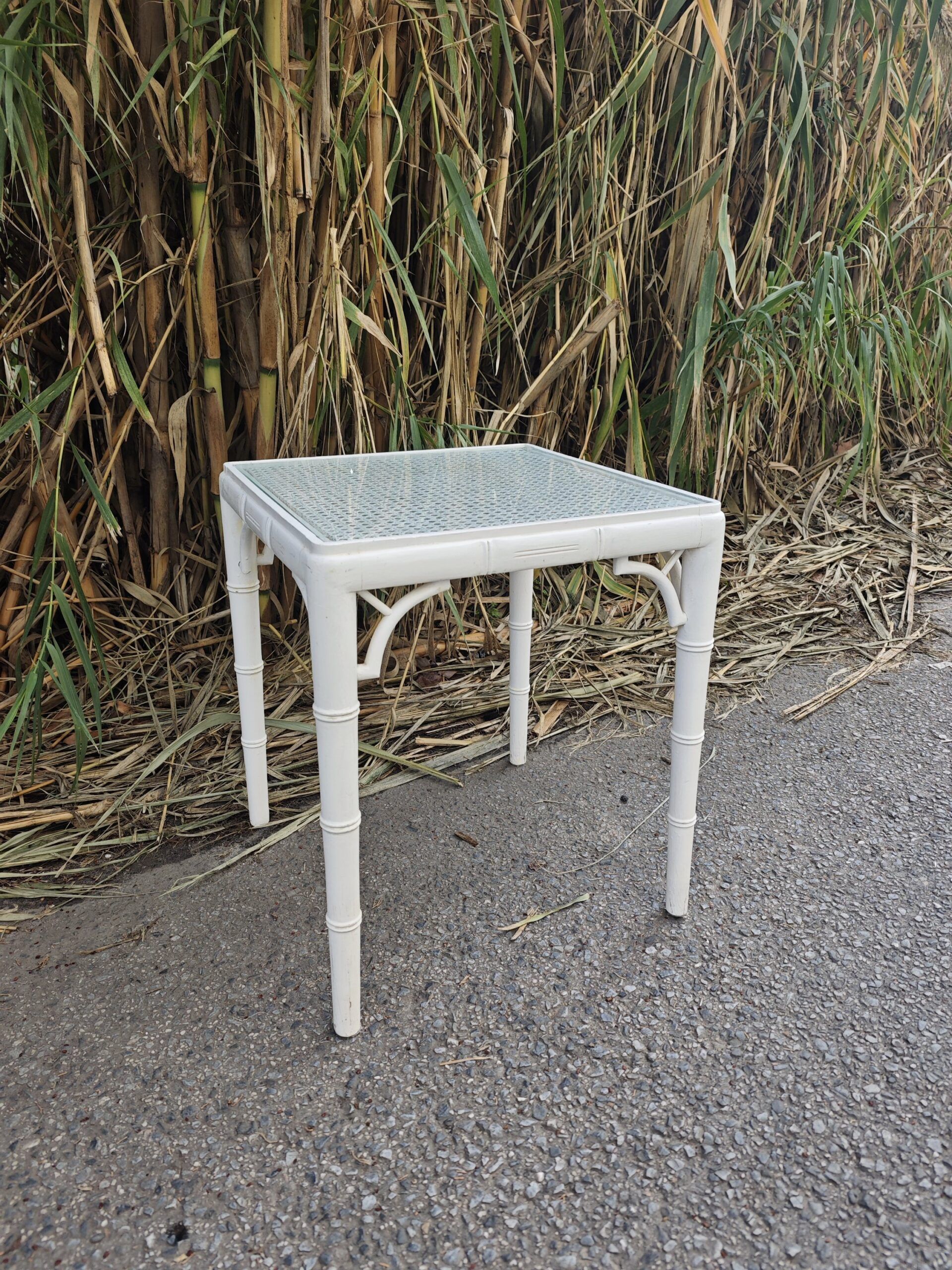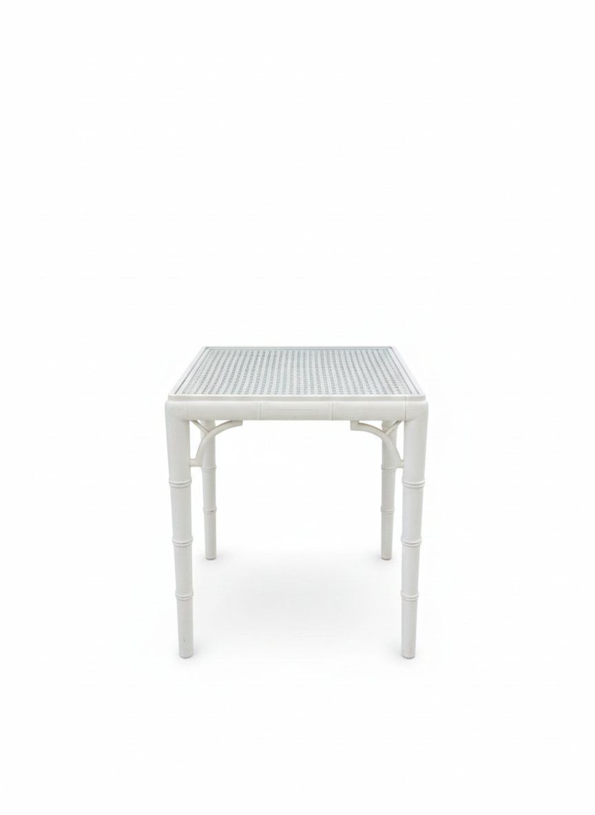 Mesita auxiliar estilo Chippendale blanca en color blanco con detalles de imitación bambú y sobre de rejilla con cristal. Una pieza versátil y ligera para cualquier estancia.