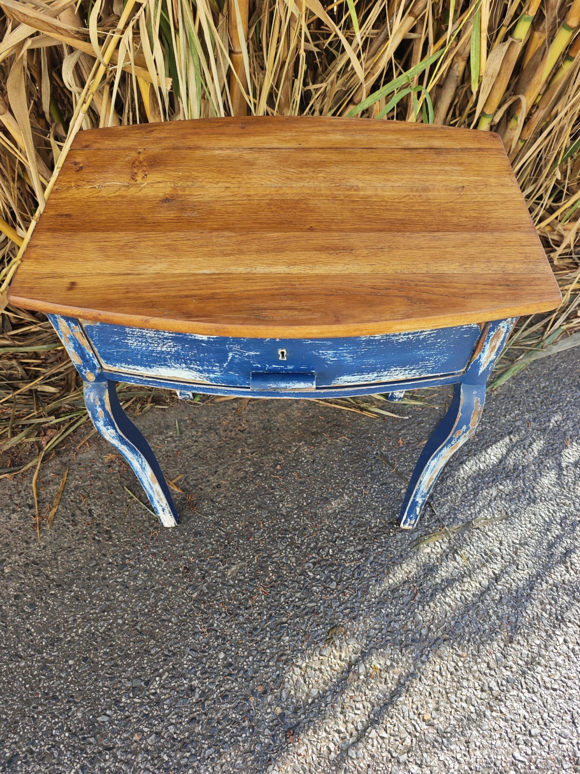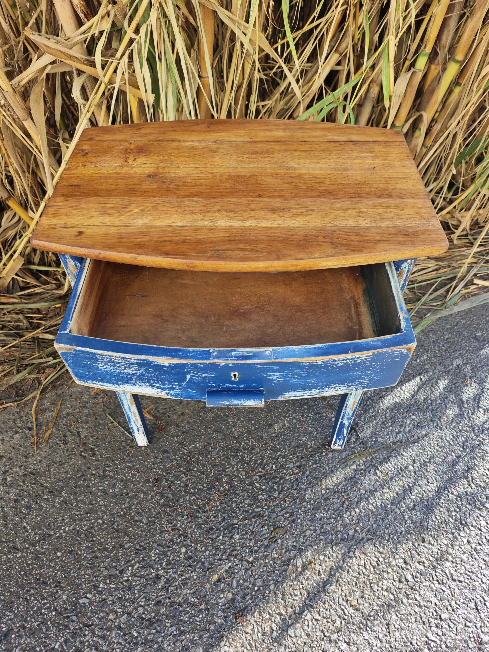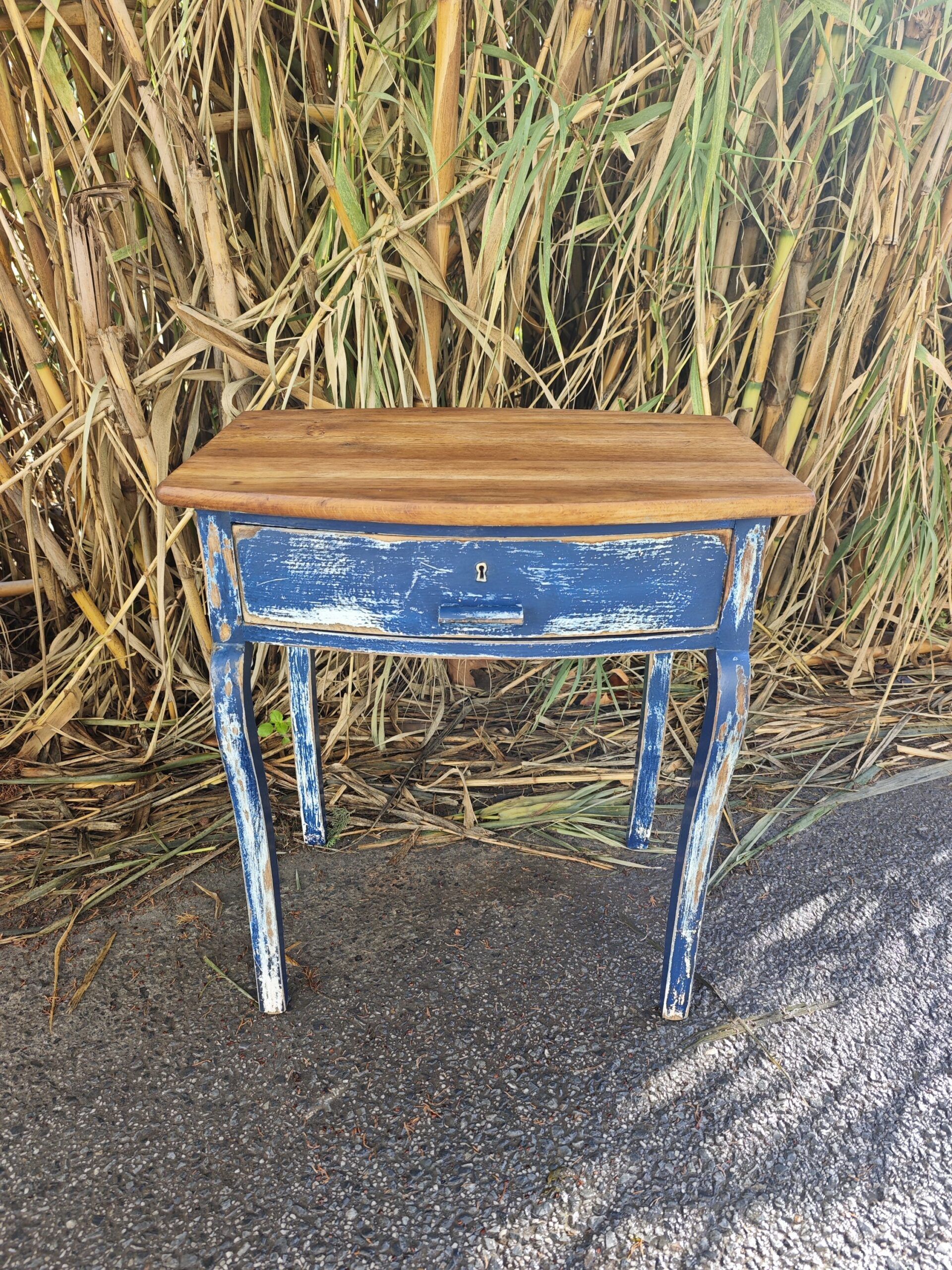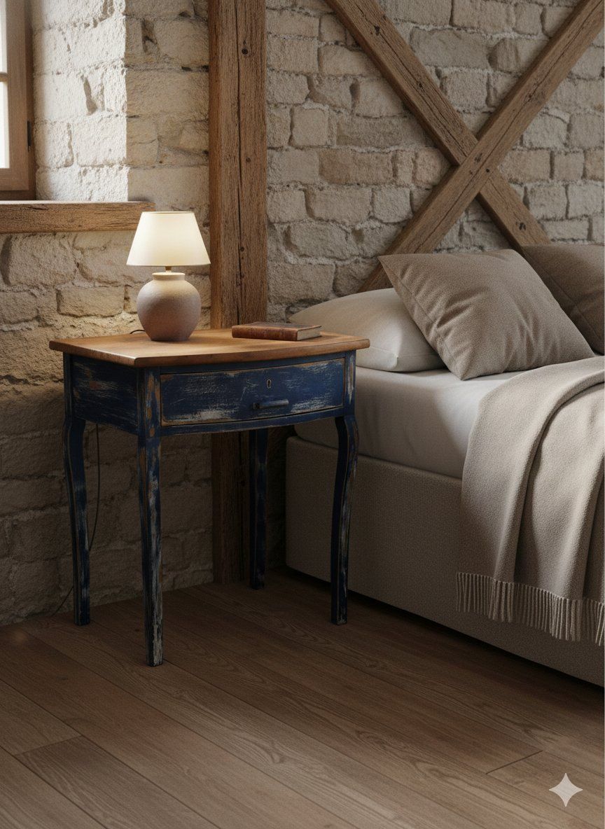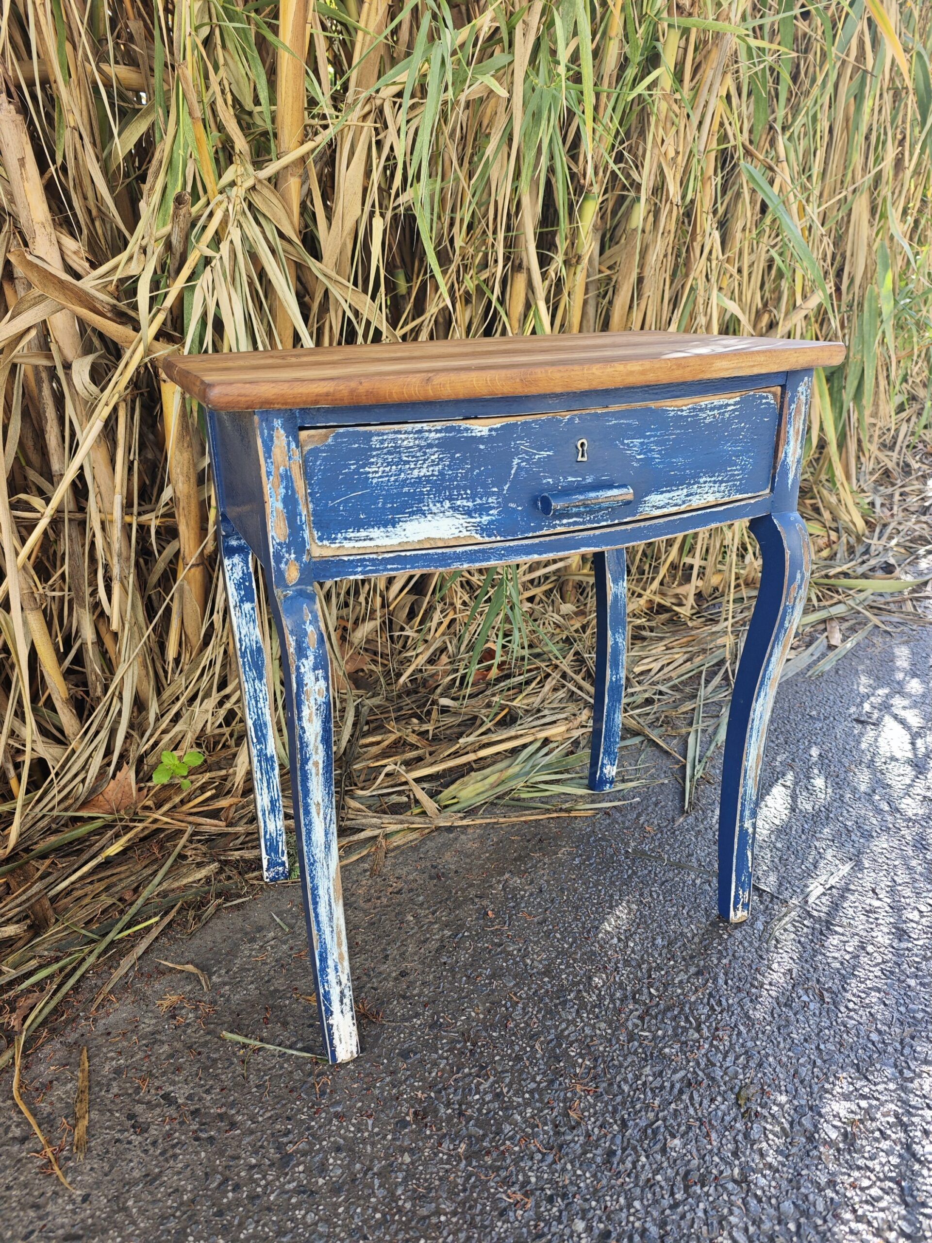 Esta pieza única combina la nobleza del nogal con el encanto del desgaste. Su estructura firme y proporciones equilibradas la convierten en una compañera versátil: perfecta como mesita auxiliar, recibidor o rincón de lectura. El frente azul del cajón, con su pintura desgastada y cerradura central, evoca historias pasadas y añade un toque poético a cualquier espacio.