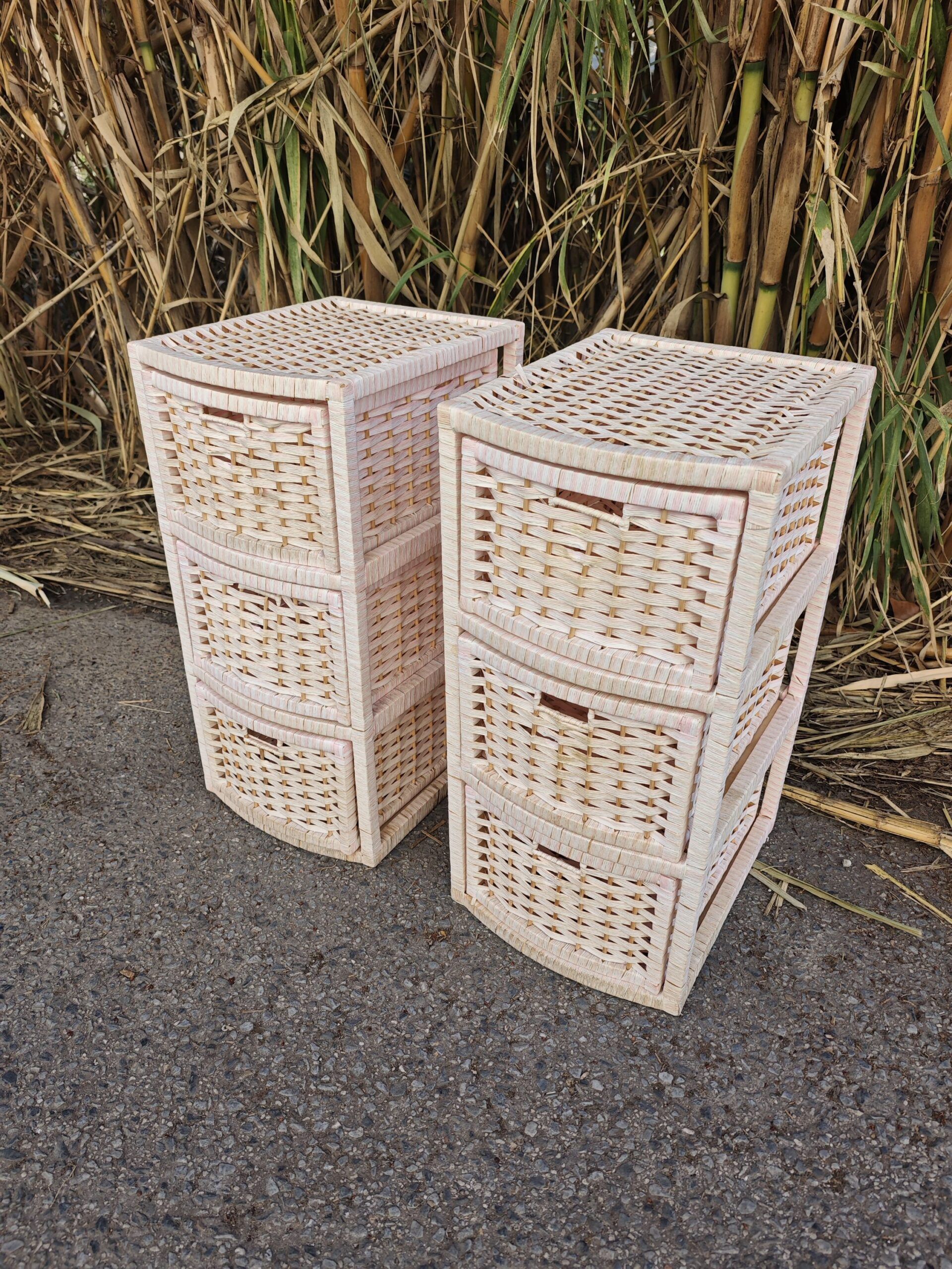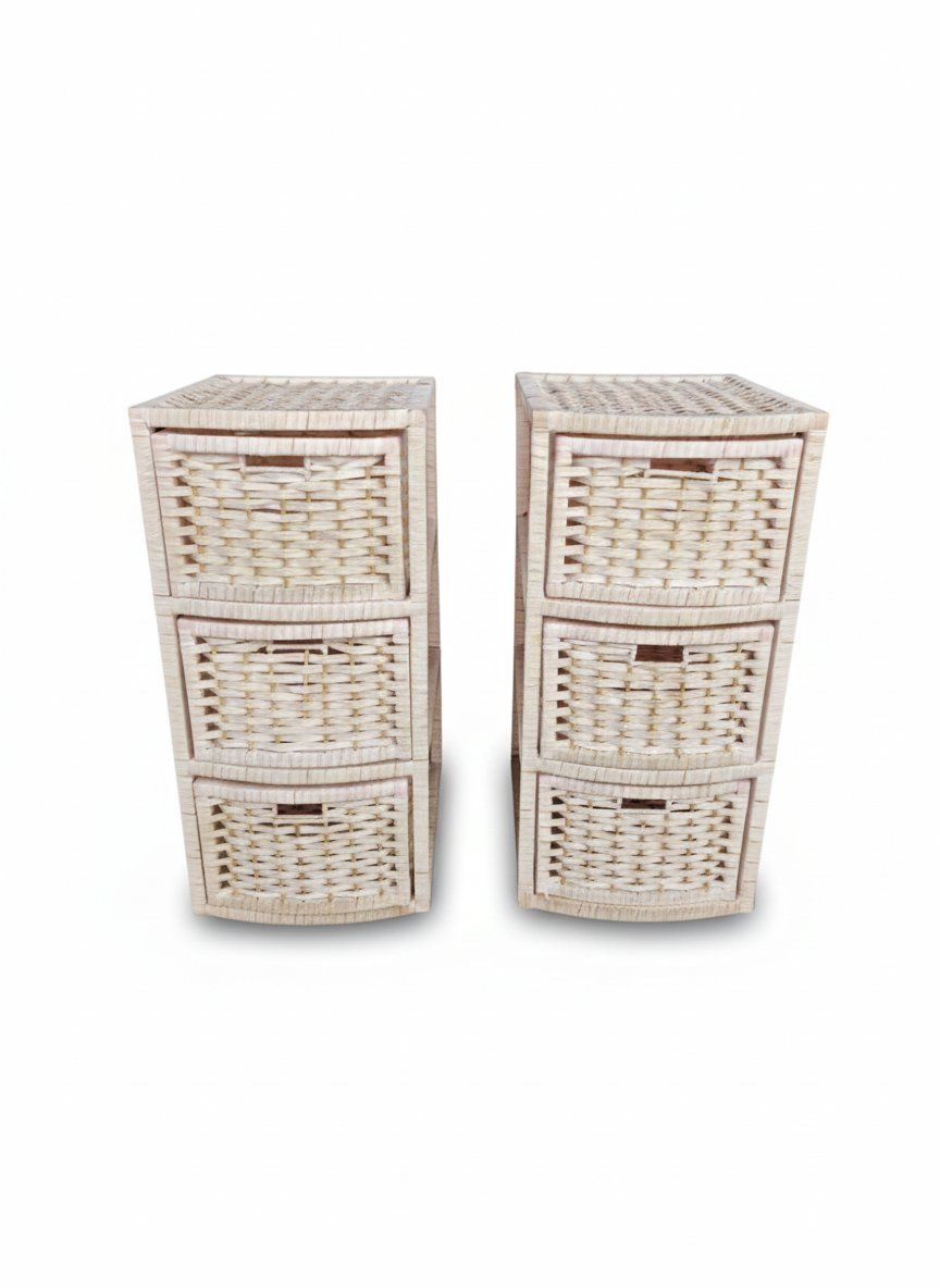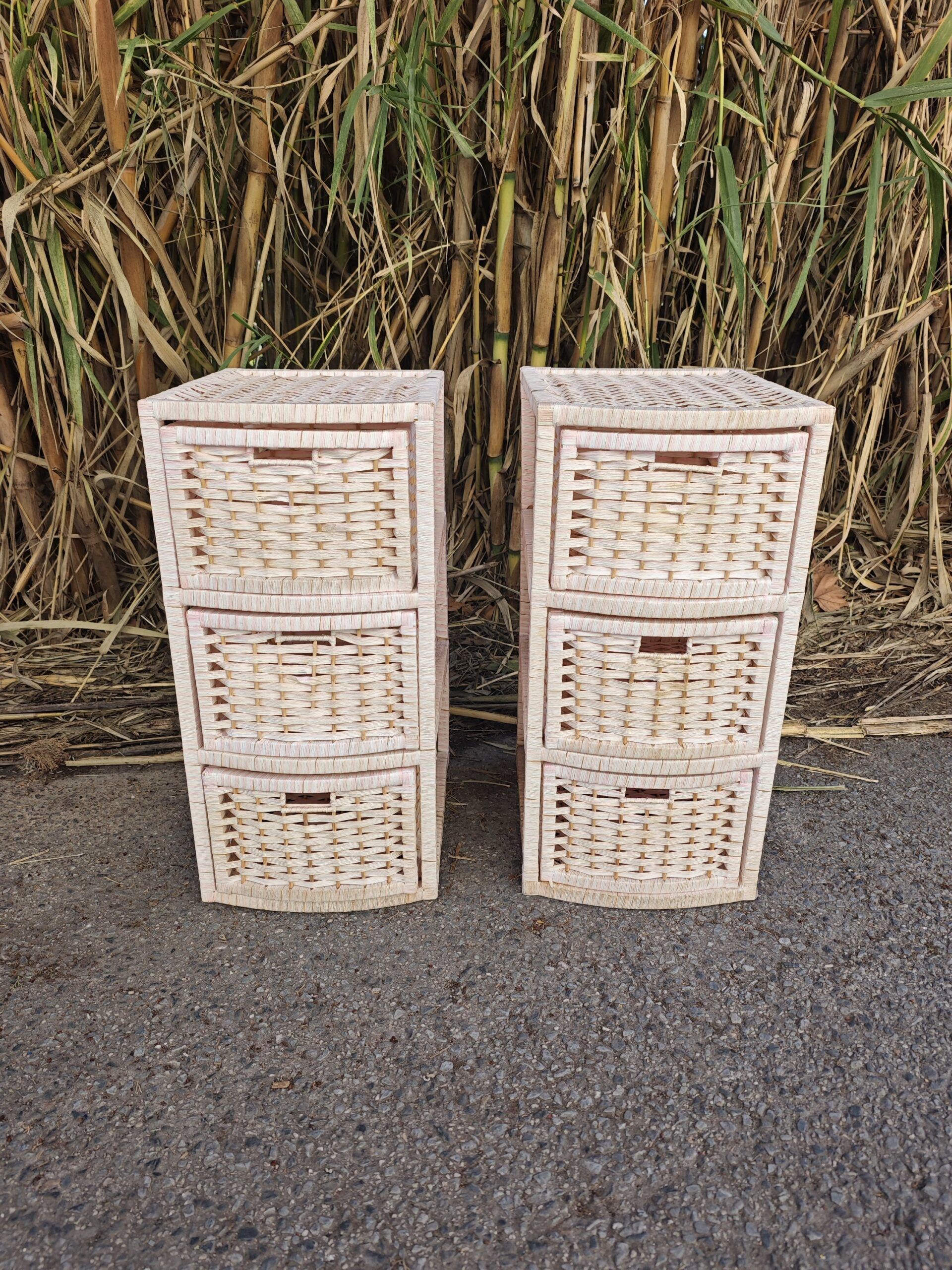 Cada mesita cuenta con una estructura robusta que alberga tres cajones extraíbles, fabricados con un trenzado detallado que permite la ventilación de los objetos en su interior. Su acabado en color rosa suave proporciona una estética luminosa y acogedora, convirtiéndolas en el complemento perfecto para organizar accesorios, ropa de cama o artículos personales. Estas cajoneras de mimbre no solo son prácticas, sino que también destacan como elementos decorativos versátiles que pueden utilizarse como cómodas auxiliares en baños o salones.