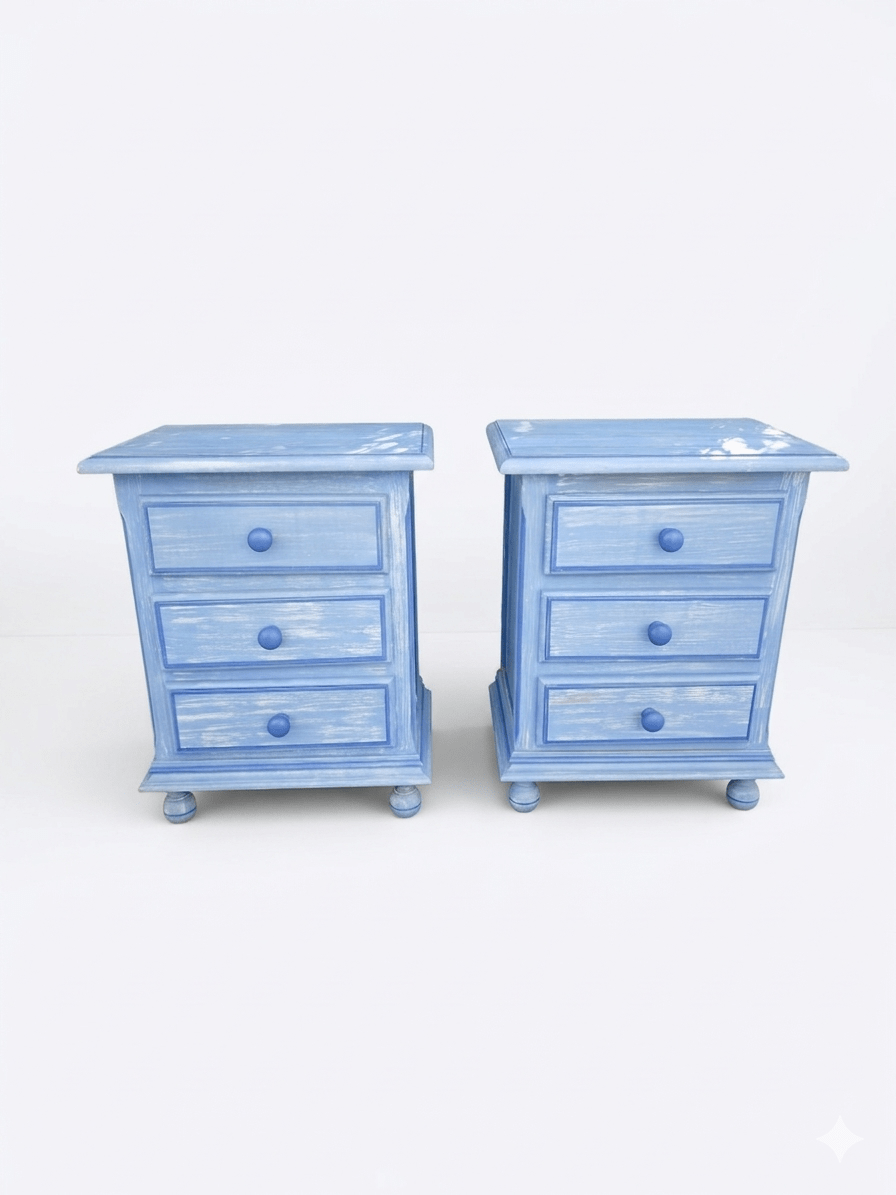 Estas mesitas presentan un acabado artesanal en azul pastel con técnica de decapado (distressed). El sutil desgaste en las aristas revela la madera bajo la pintura, creando una pátina de envejecimiento que encaja perfectamente en ambientes: