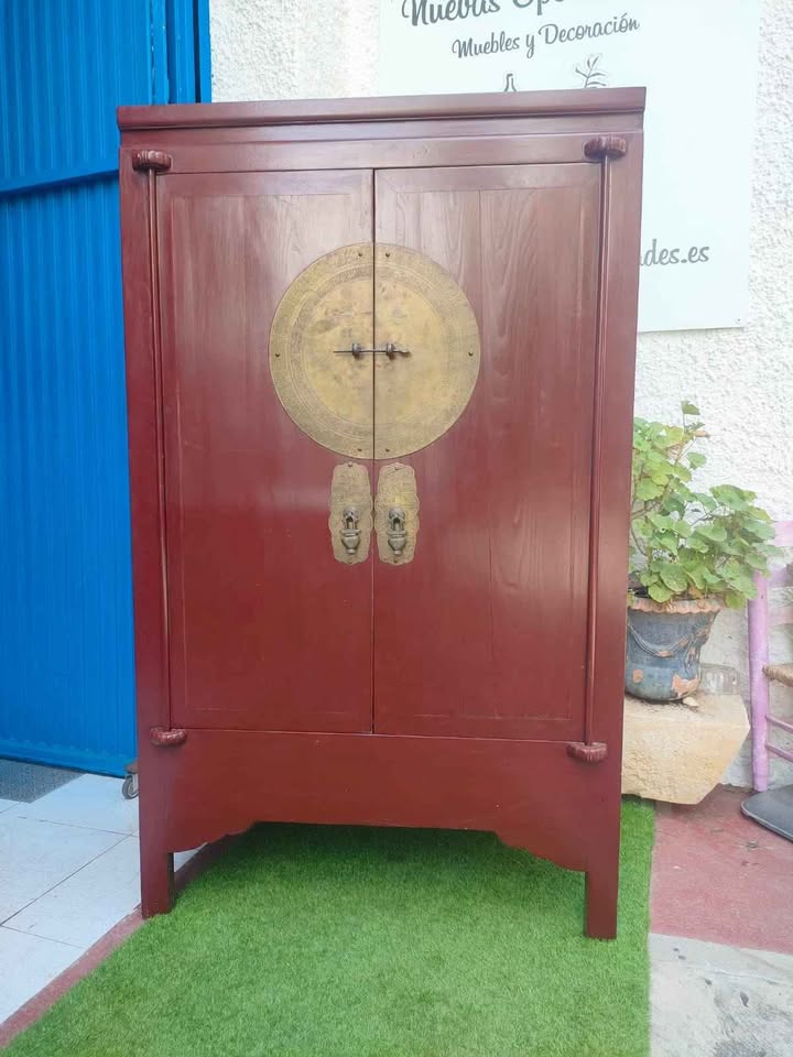 Descripción: Este mueble oriental de boda es una pieza cargada de simbolismo y elegancia. Inspirado en el mobiliario ceremonial tradicional chino, destaca por su estructura vertical en madera rojiza, sus puertas con gran medallón central en latón y detalles decorativos que evocan la riqueza cultural del Lejano Oriente. Originalmente utilizado para guardar el ajuar nupcial, hoy es una pieza decorativa única que aporta carácter y distinción a cualquier espacio.