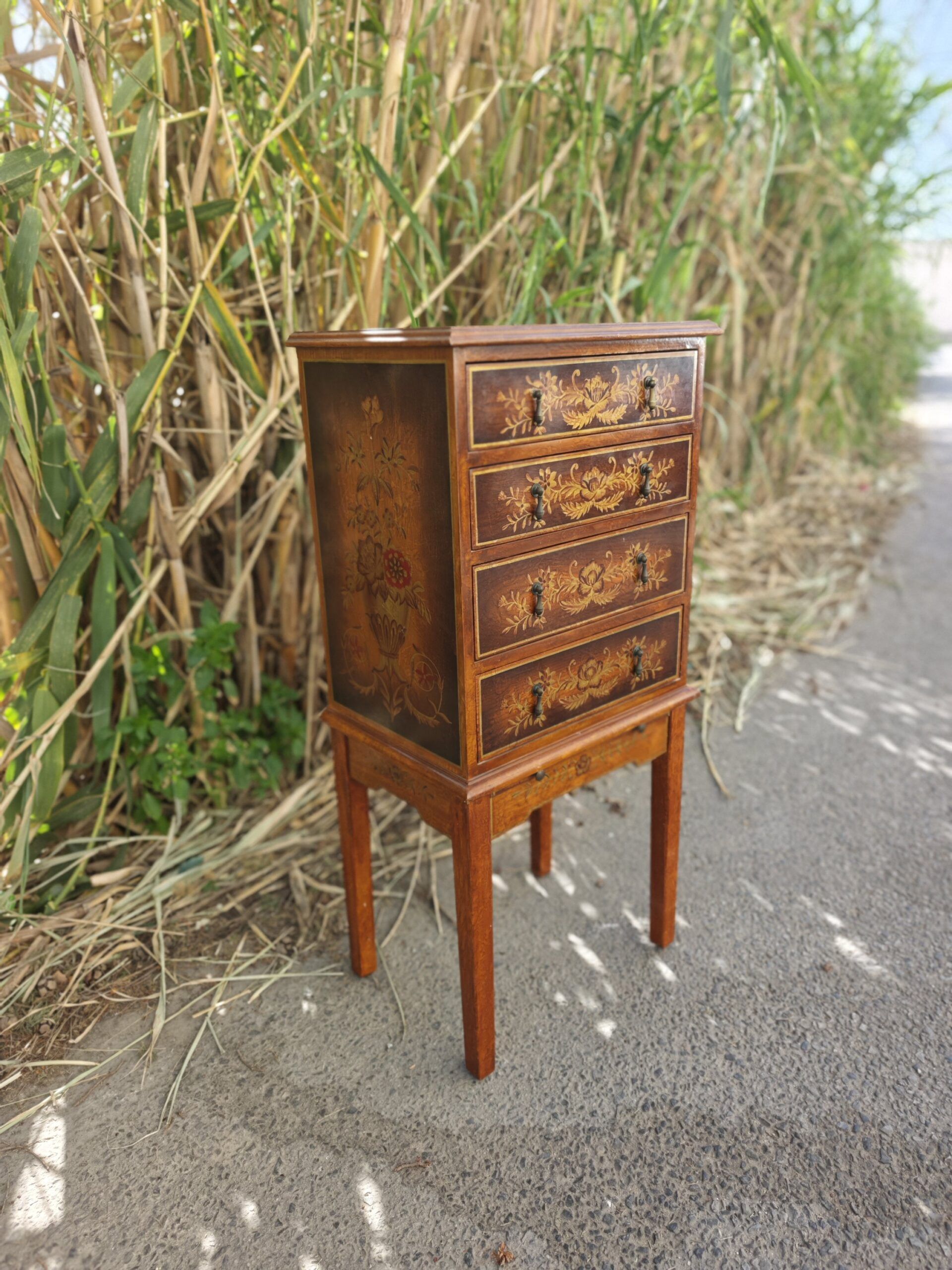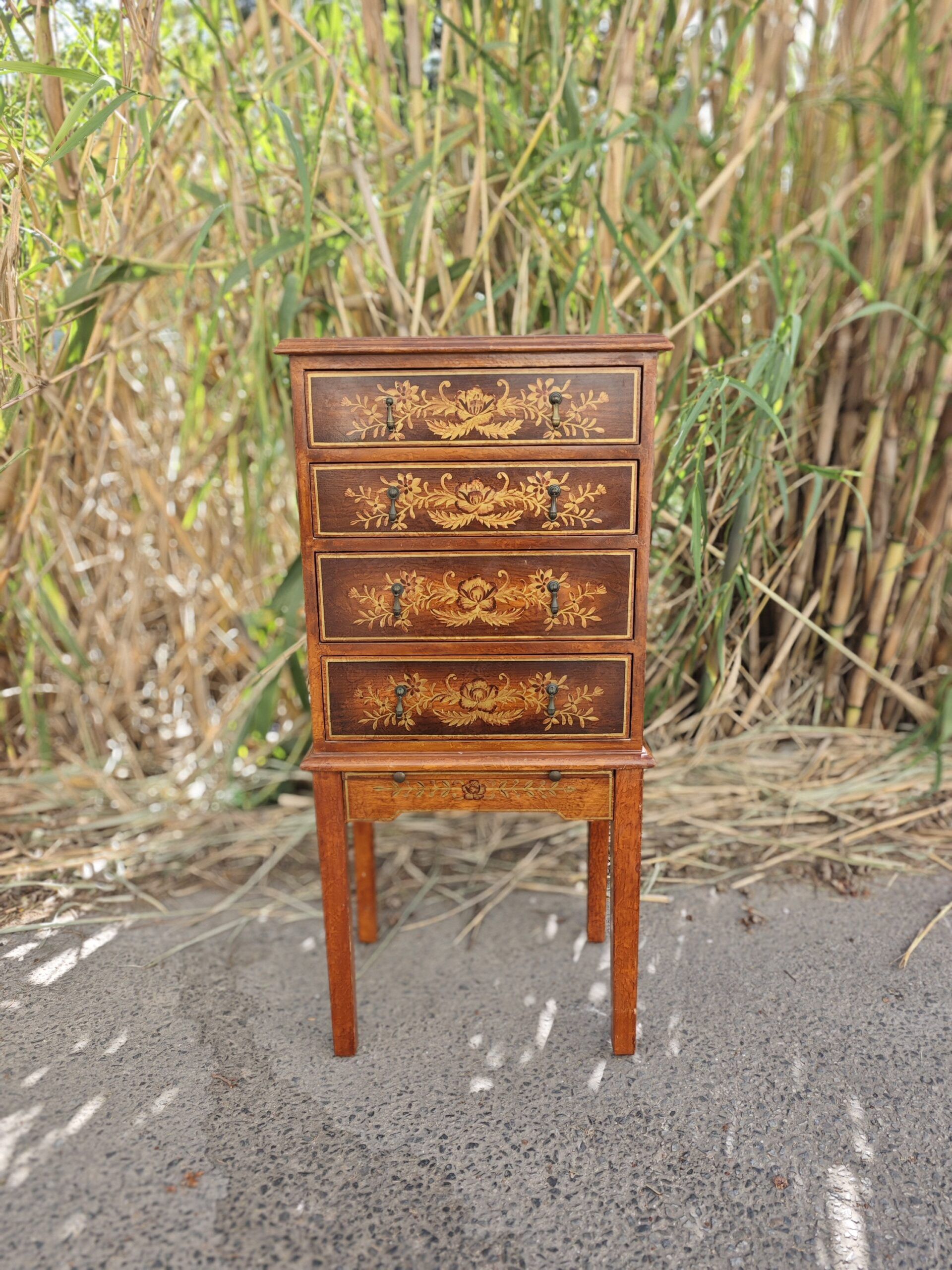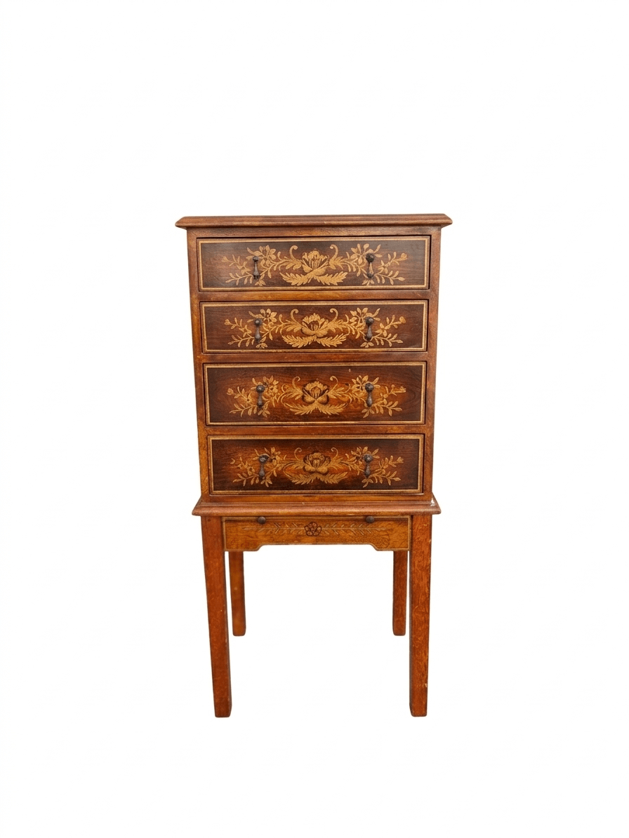 Exquisito mueble joyero de pie con cuatro cajones frontales y bandeja de apoyo extraíble. Destaca por su rica marquetería floral, laterales decorados a mano con motivos de jarrones y perfiles fileteados en dorado.