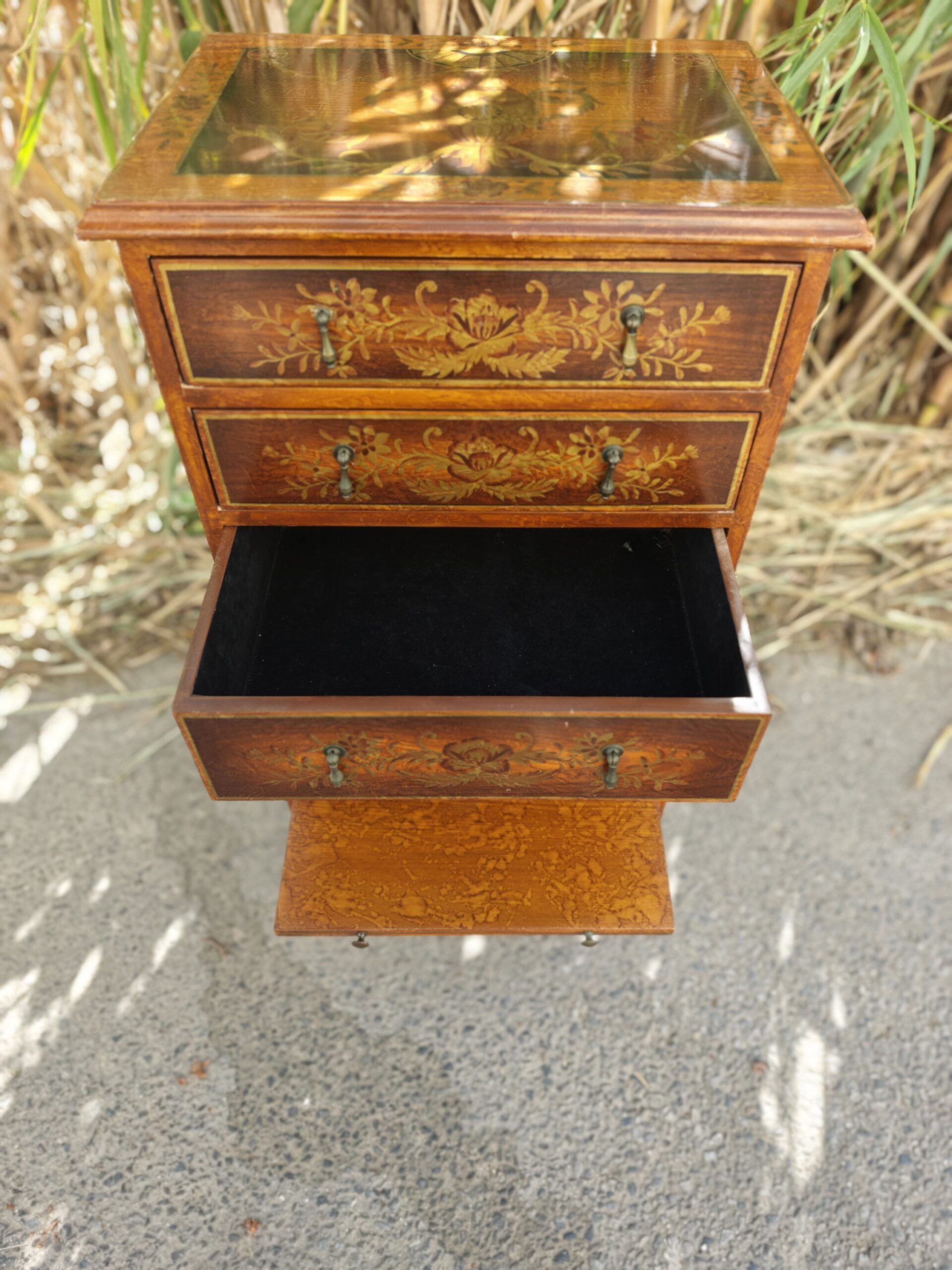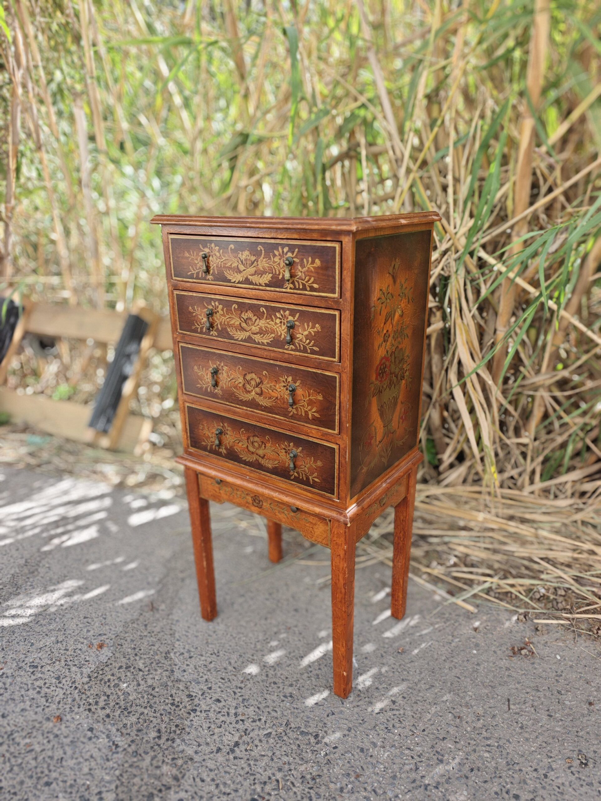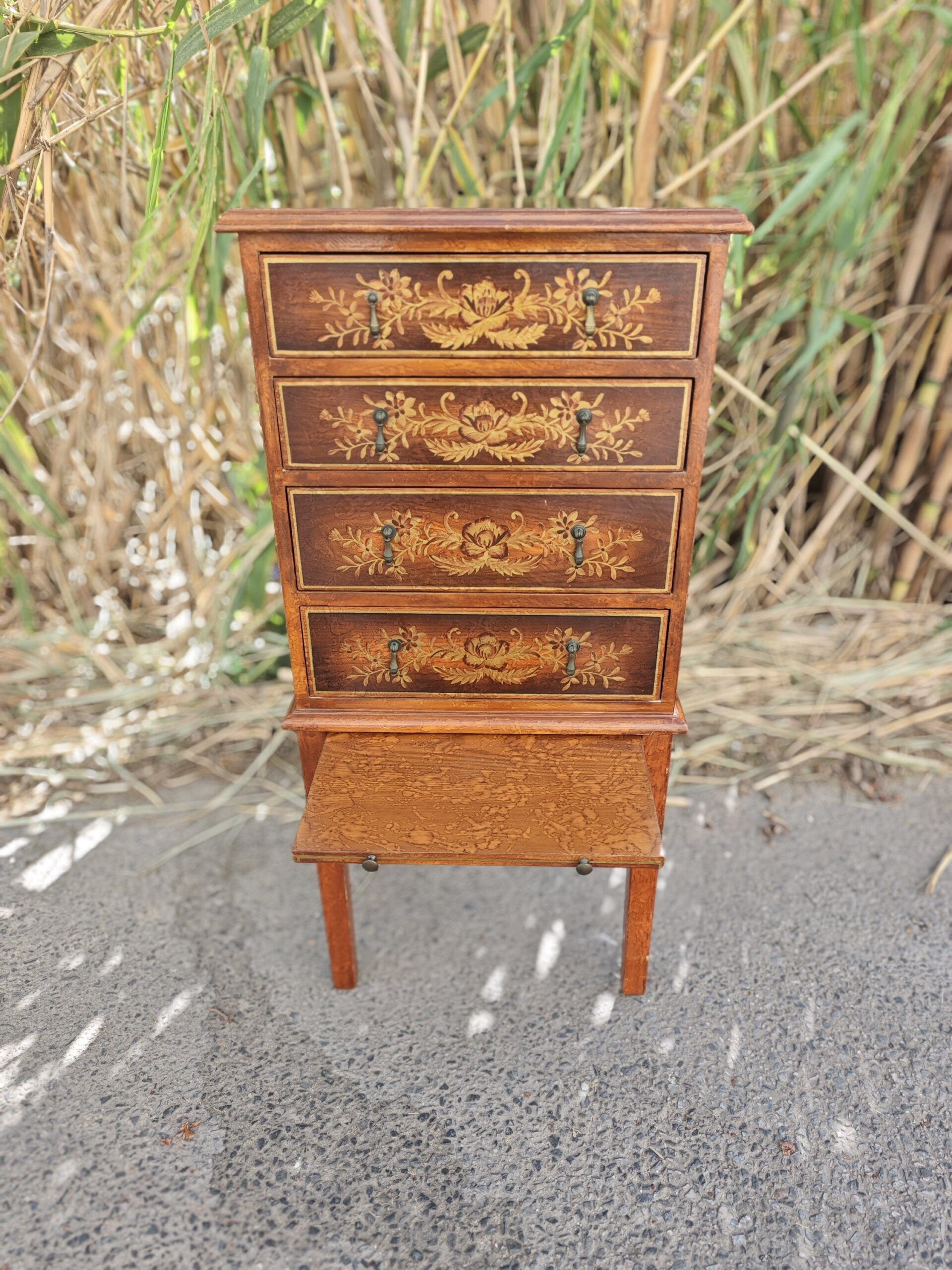 Exquisito mueble joyero de pie con cuatro cajones frontales y bandeja de apoyo extraíble. Destaca por su rica marquetería floral, laterales decorados a mano con motivos de jarrones y perfiles fileteados en dorado.