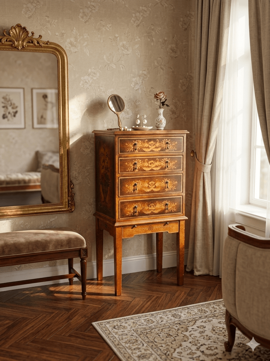 Mueble Joyero Estilo Luis XV con Marquetería Floral
