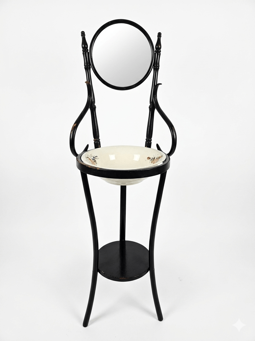 La firma Thonet transformó el mobiliario mundial a mediados del 1800. Este palanganero sigue los principios de la famosa «Silla nº 14»: líneas fluidas, estructuras ligeras y una resistencia asombrosa. Originalmente diseñado para la higiene personal en dormitorios de la alta burguesía, su silueta orgánica es hoy un icono del estilo Modernista (Art Nouveau) y de la ebanistería europea. La estructura de madera curvada en color negro ofrece un contraste visual potente y sofisticado que nunca pasa de moda.