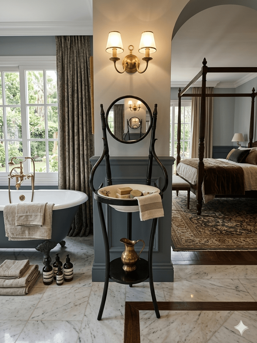 Cuarto de Baño de Cortesía: Sustituye el mueble convencional por esta pieza para crear un baño con aire de hotel boutique.