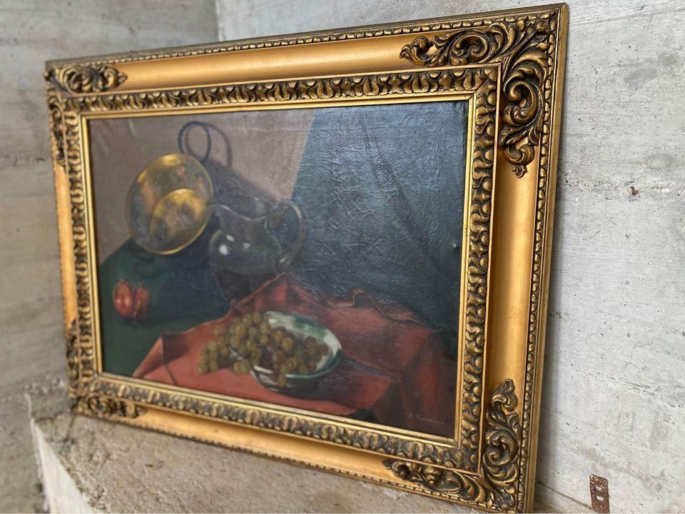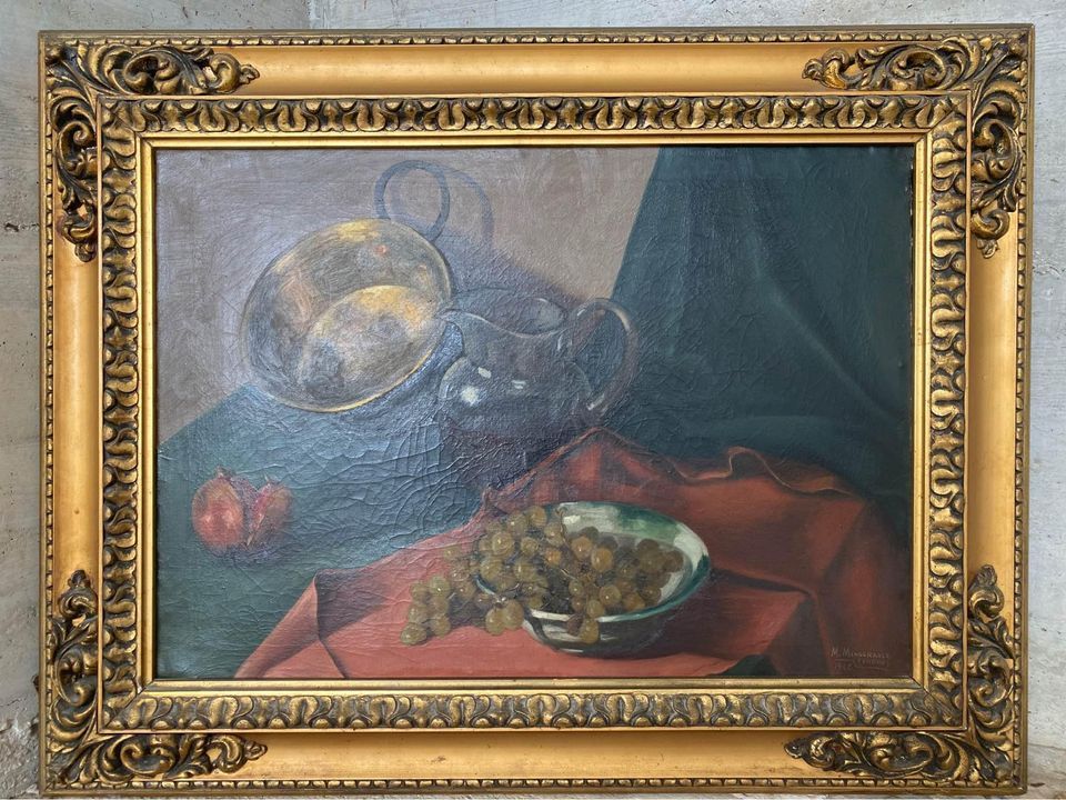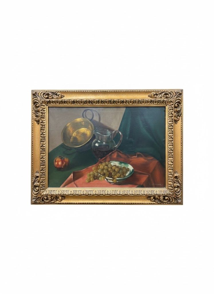 Obra original firmada por Miguel Mingorance, pintor granadino de reconocida trayectoria. Este bodegón fechado en 1946 y refleja la maestría del artista en la composición clásica, con juego de luces, texturas y equilibrio cromático. Enmarcado en moldura dorada, es una pieza de gran valor histórico y estético, ideal para coleccionistas, amantes del arte español o decoración con carácter.