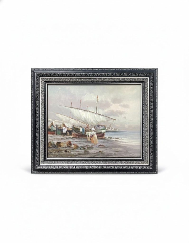 Escena costera con barcas y figuras tradicionales. Elegancia nostálgica y carácter artesanal.