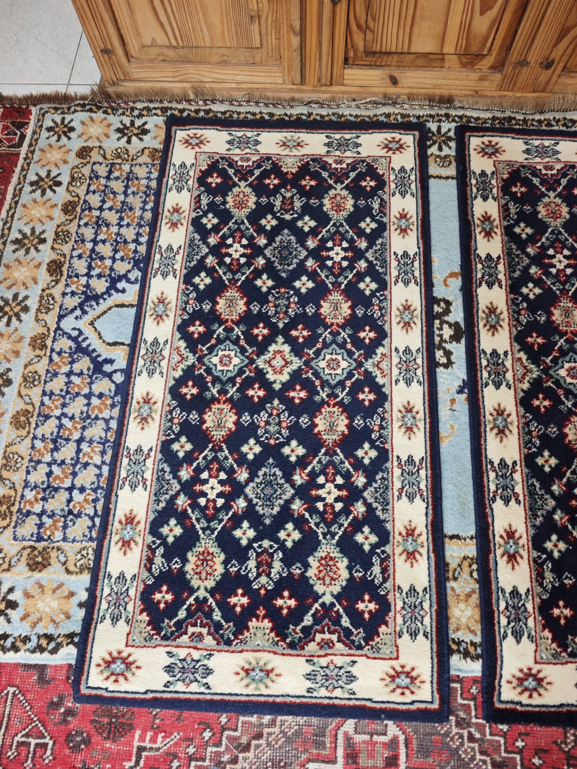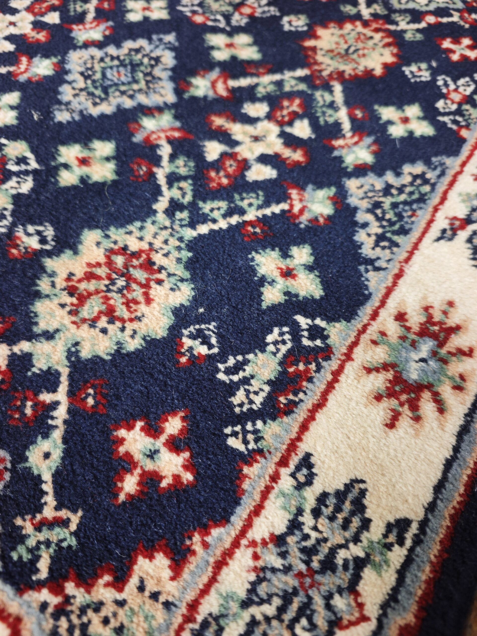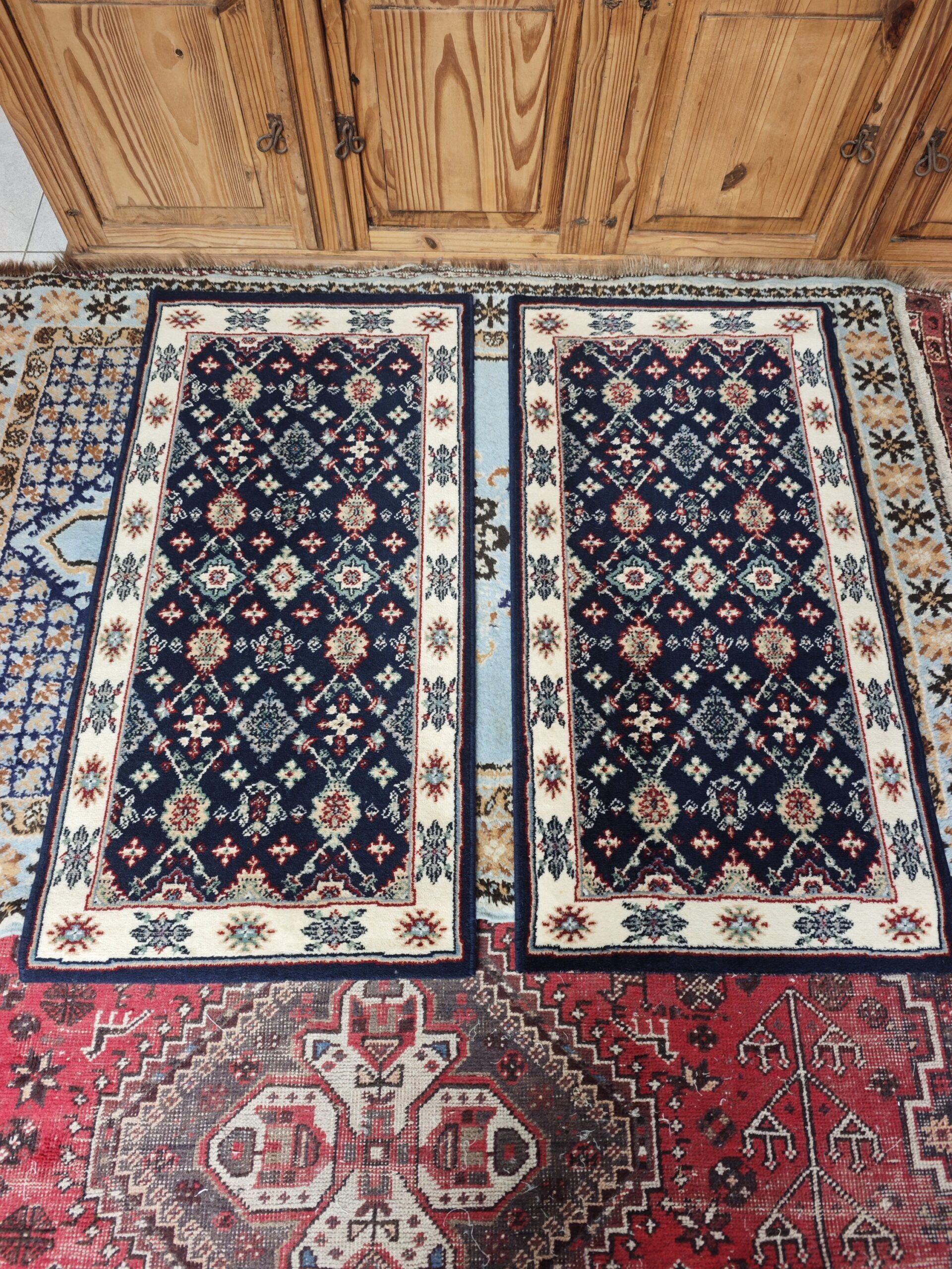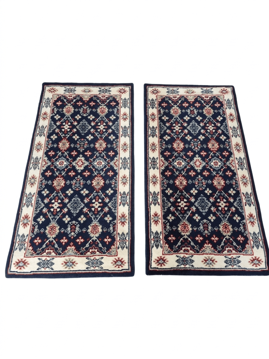 Esta pareja de alfombras vintage representa la cumbre del diseño clásico textil, fusionando la robustez de la lana de alta calidad con una estética refinada que evoca los palacios de Oriente. Con un profundo fondo azul marino (navy) que contrasta magistralmente con bordes en crema y detalles en terracota y verde salvia, estas piezas no son solo accesorios, sino verdaderas declaraciones de estilo.
