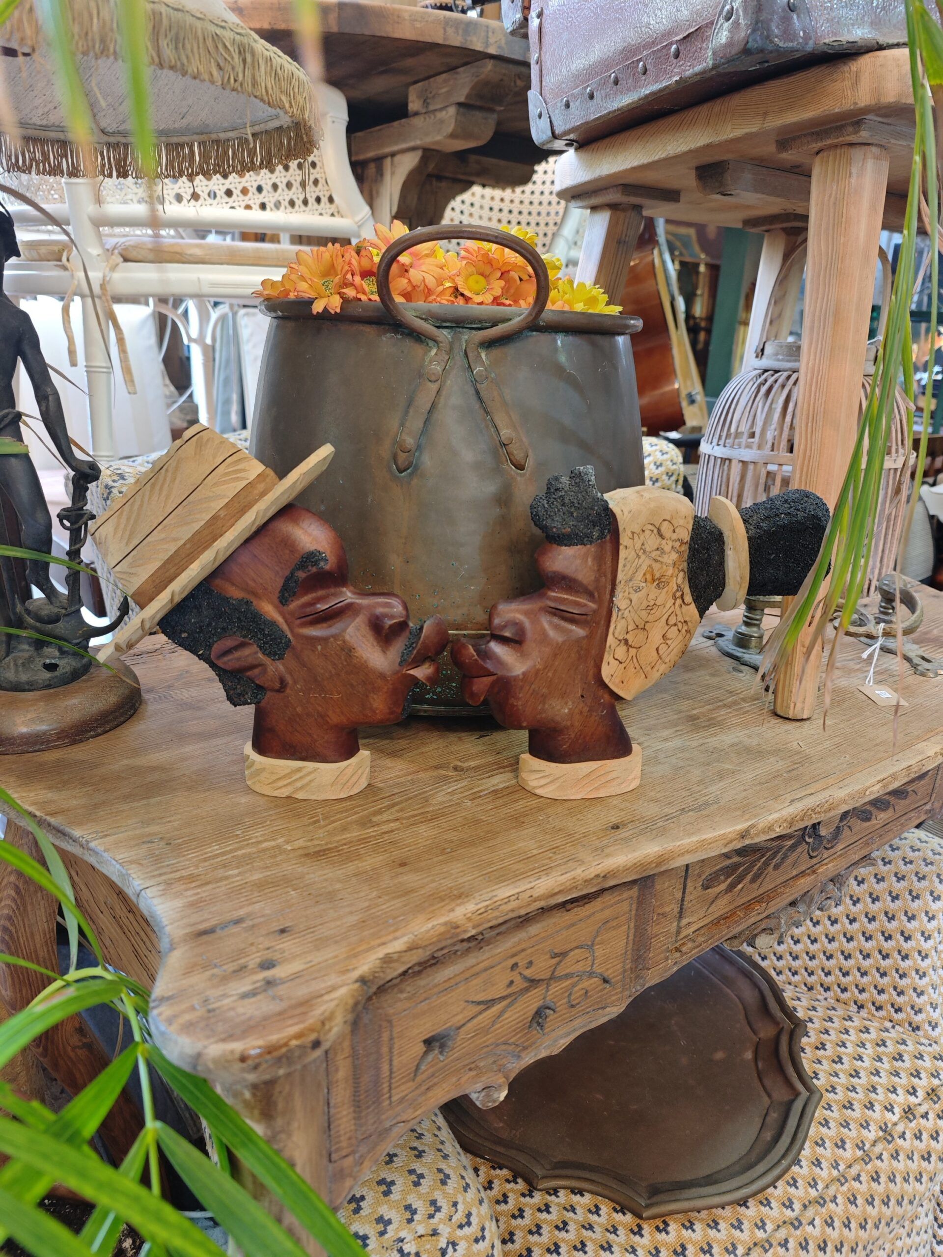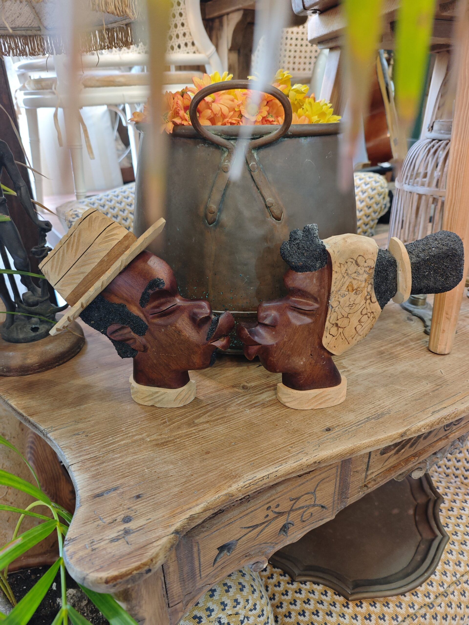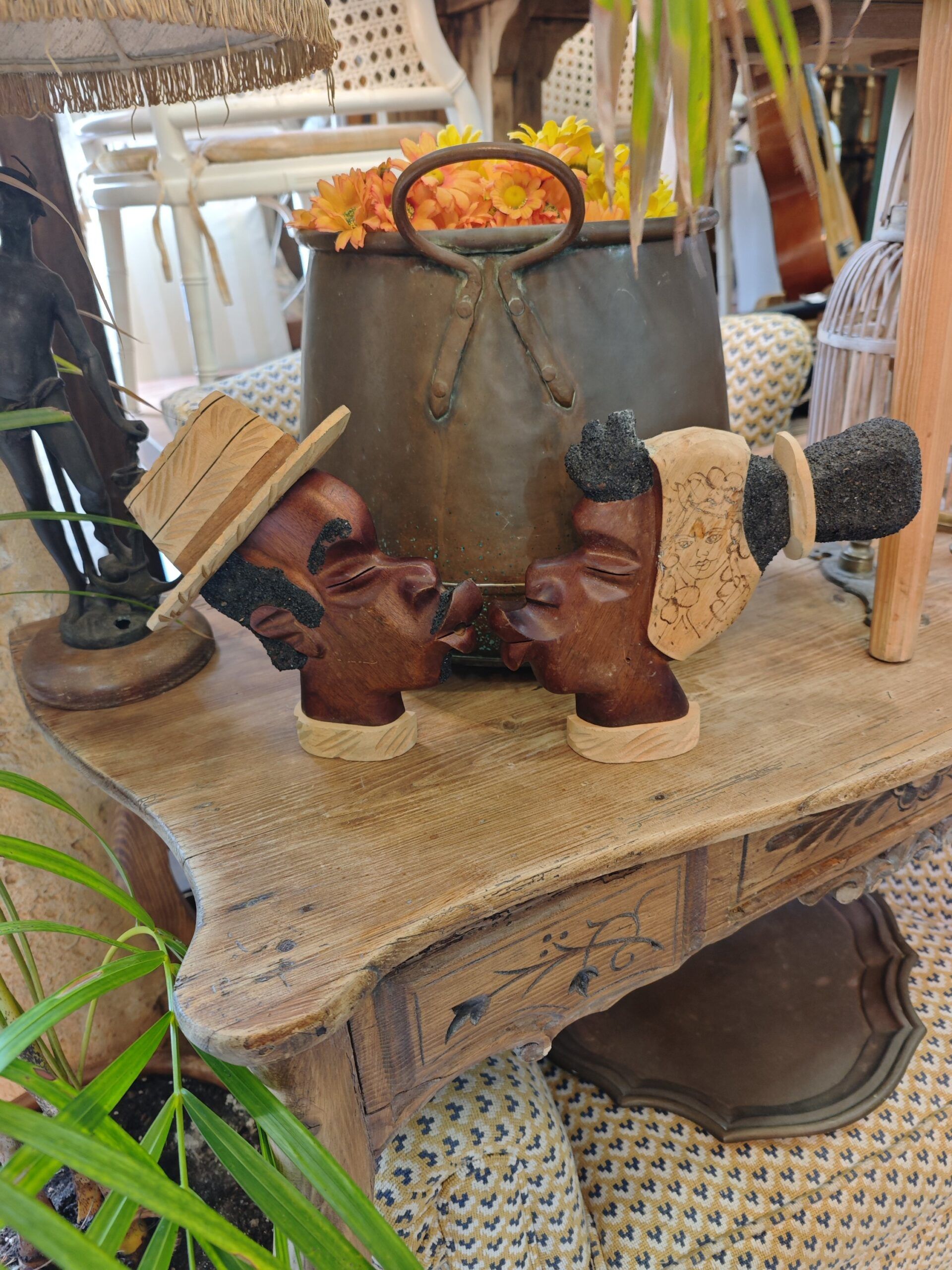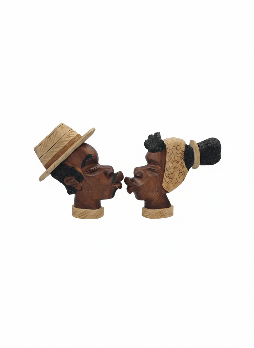 Esta encantadora pareja de bustos cubanos es una pieza de arte étnico que captura la esencia y el romanticismo de la cultura caribeña. Talladas meticulosamente en madera de alta calidad, estas figuras representan a un hombre y una mujer en un gesto de beso, destacando por sus detalles artesanales como el sombrero de paja tallado y los grabados en el pañuelo de la mujer.
