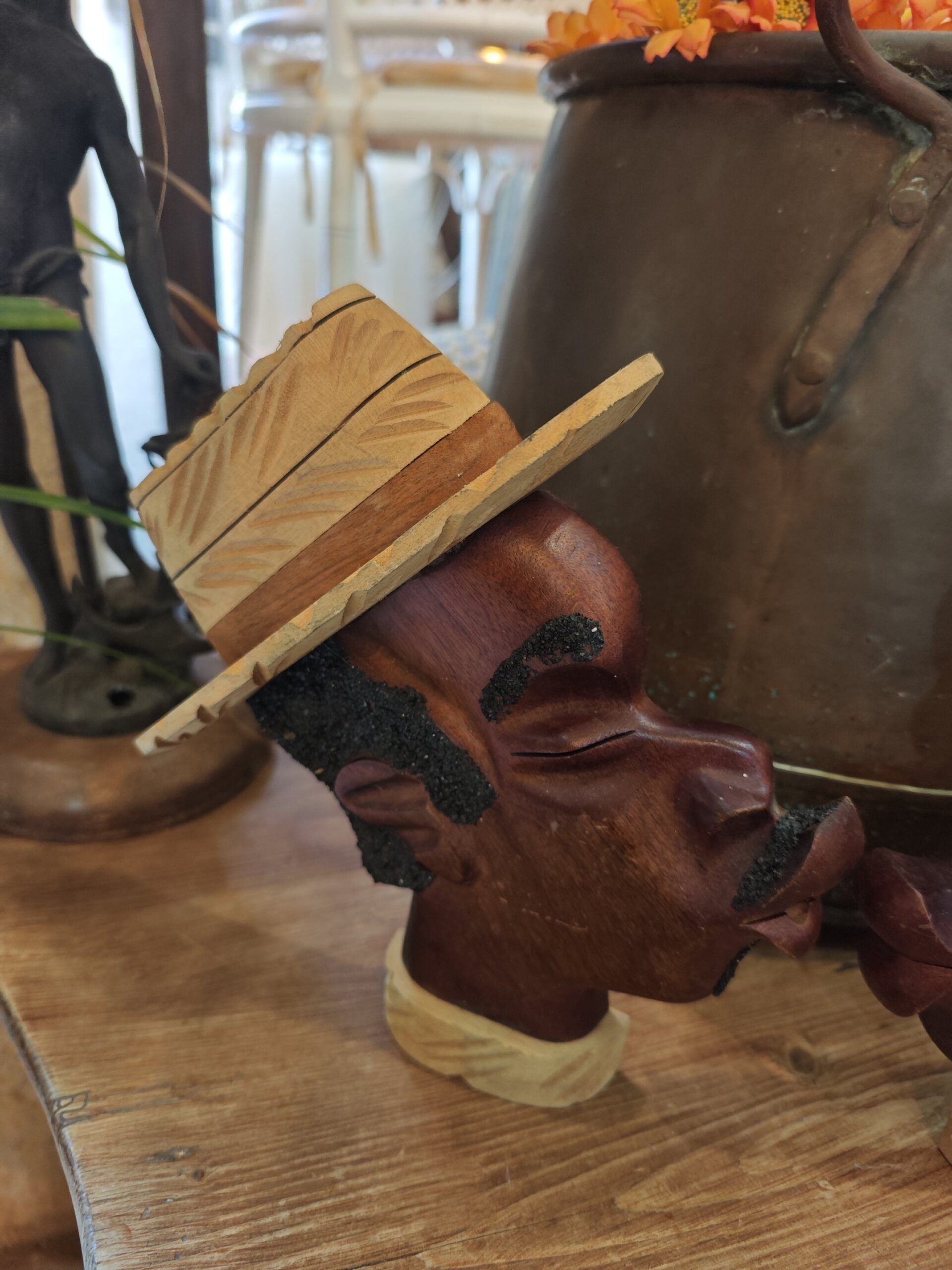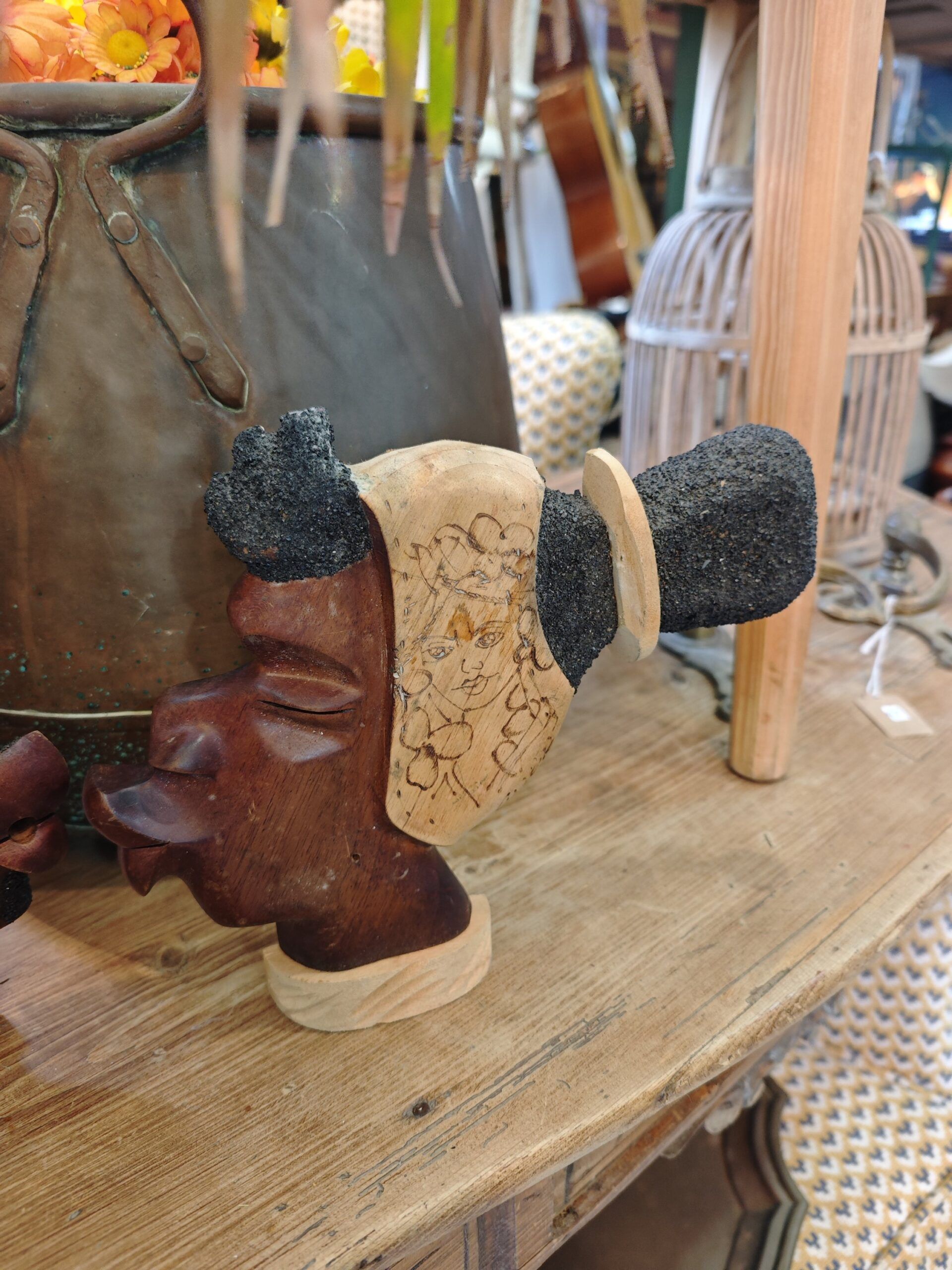 El contraste entre los tonos naturales de la madera y las texturas aplicadas en el cabello y accesorios aporta una profundidad visual única. Es una escultura vintage ideal para estanterías, aparadores o como pieza central en decoraciones de estilo colonial, bohemio o ecléctico. Al ser una pieza artesanal, añade un valor cultural y artístico diferenciador a cualquier colección de arte internacional.