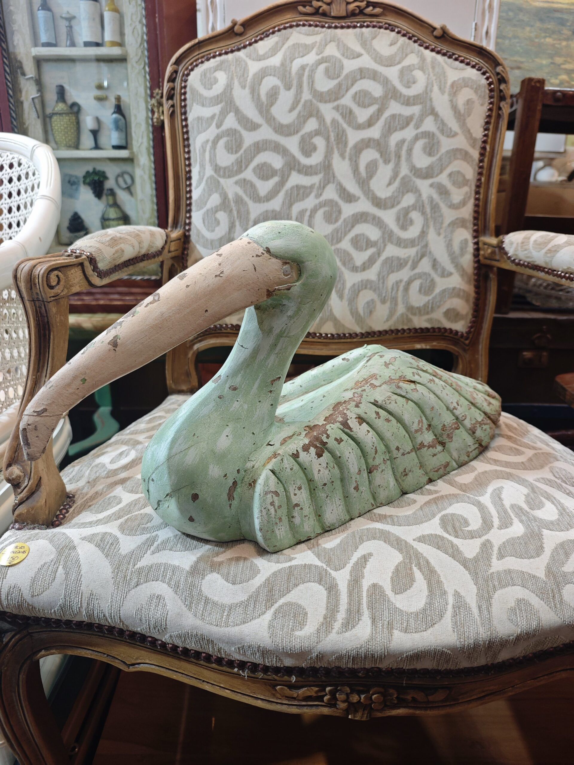 - Esta es una magnífica escultura de un pelícano, tallada a mano en madera sólida. La pieza está acabada con una pátina verde pálido que se ha decapado y desgastado intencionadamente para revelar la madera subyacente, creando un auténtico efecto vintage y rústico. El pico tiene un tono crema o madera natural desgastado. Las tallas de las alas y el plumaje son sencillas pero estilizadas, capturando la forma icónica del ave. Se presenta en un estado «distressed», lo cual es una característica del estilo y no un defecto.