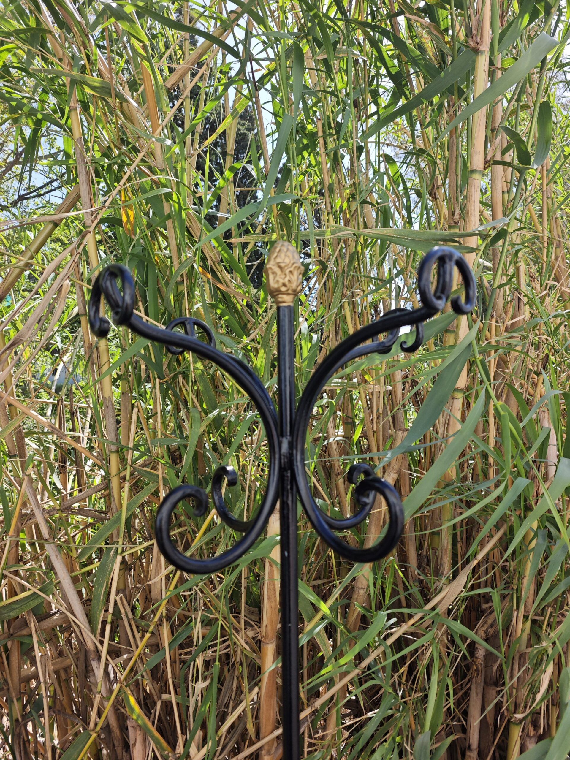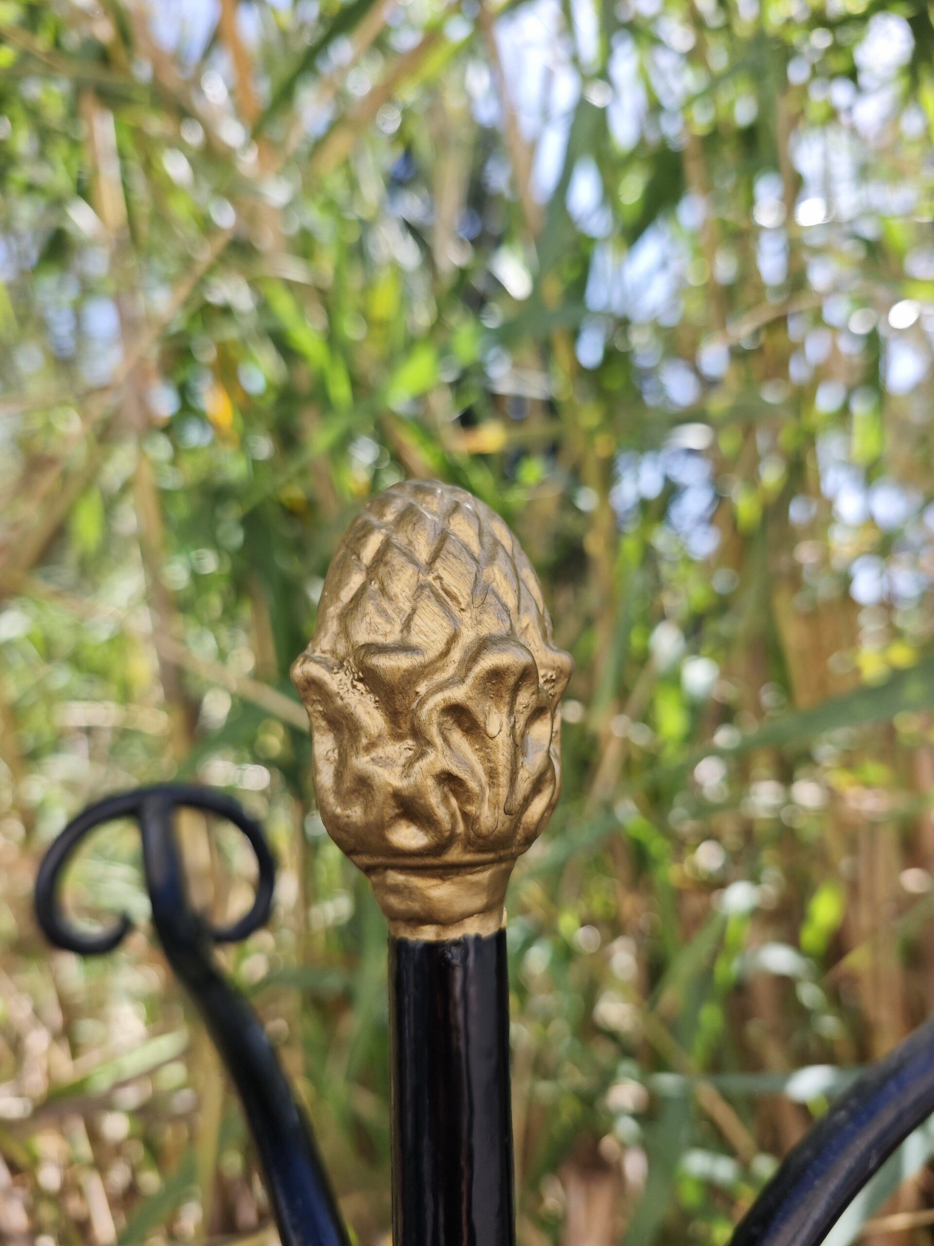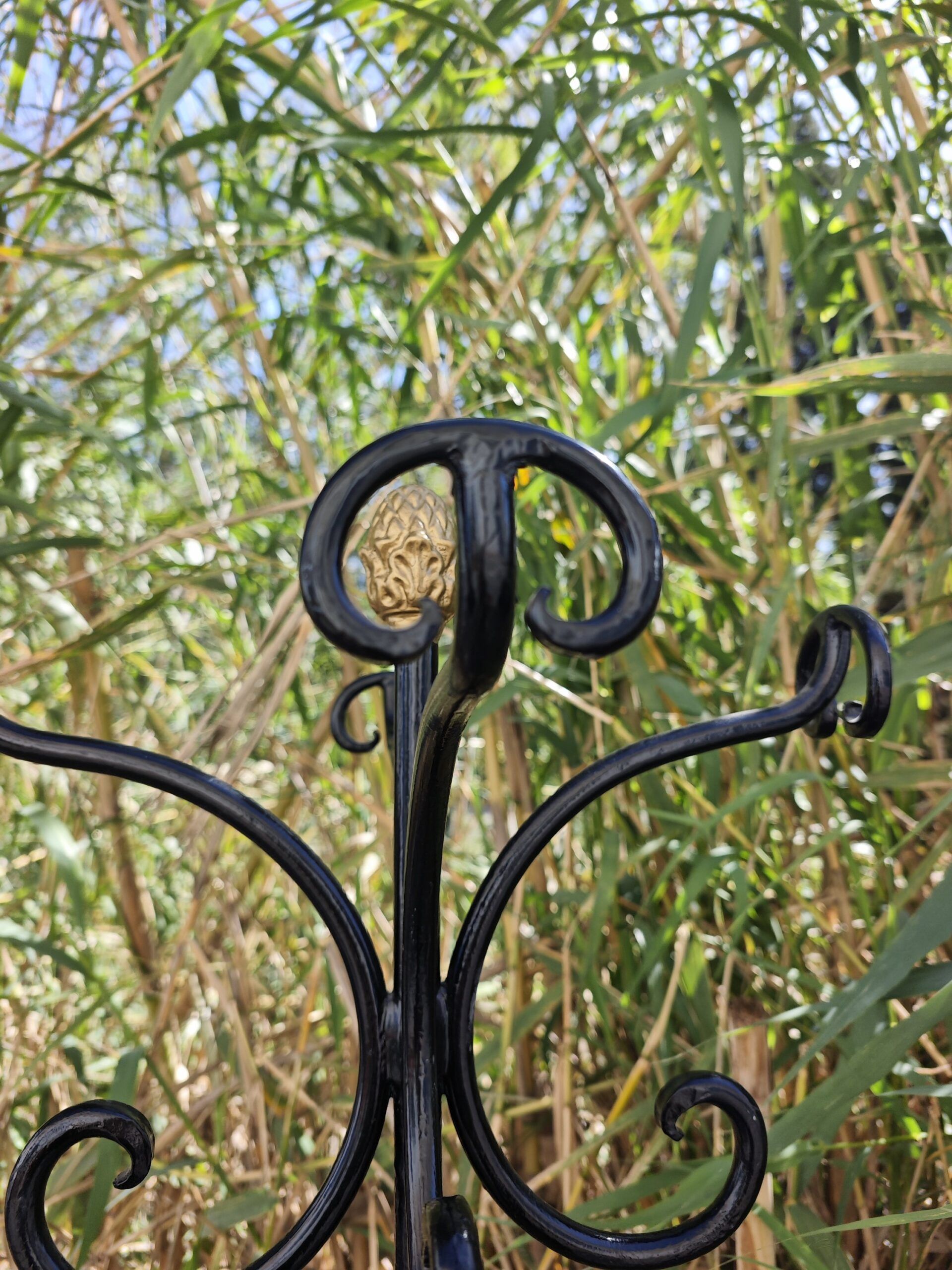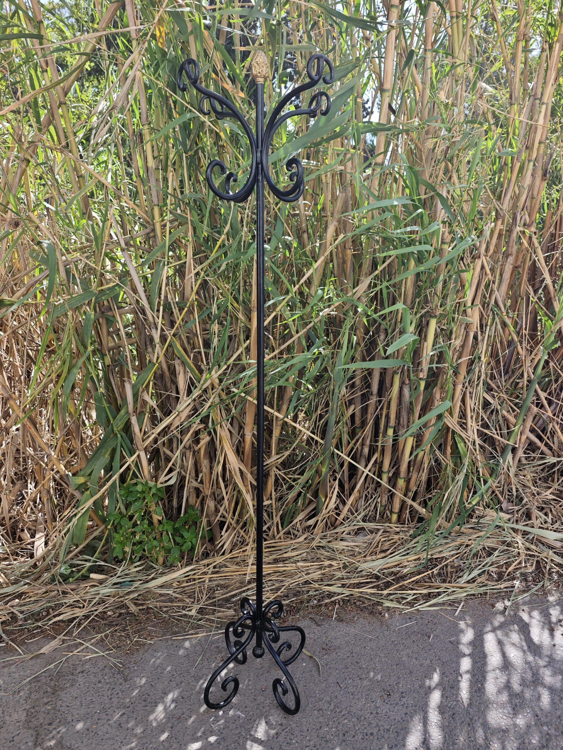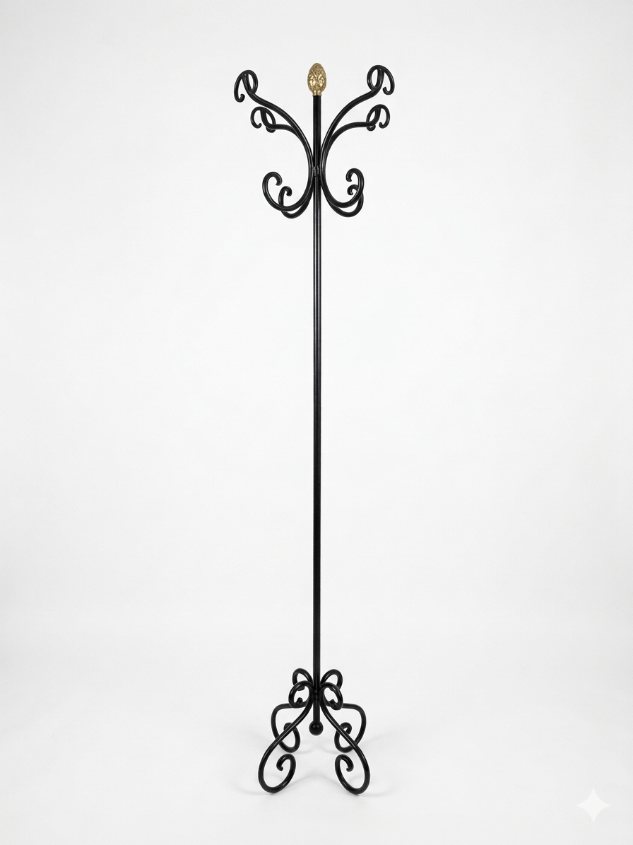 Inspirado en el icónico Perchero N.º 1 de Thonet de finales del siglo XIX, esta versión metálica captura la esencia de las curvas orgánicas y las volutas que definieron el mobiliario de la época. Su estructura se eleva con una elegancia arquitectónica, rematada en la parte superior por un detalle ornamental en forma de piña o pomo de latón, un símbolo clásico de hospitalidad y buen gusto. Las perchas superiores están diseñadas con amplios bucles para no dañar las prendas, mientras que la base de trípode con volutas asegura una estabilidad perfecta a pesar de su gran altura.