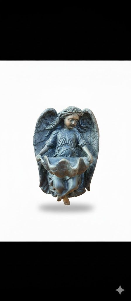 Está decorada con una figura de un ángel alado, que sostiene una pequeña concha o cuenco, donde tradicionalmente se coloca el agua bendita.