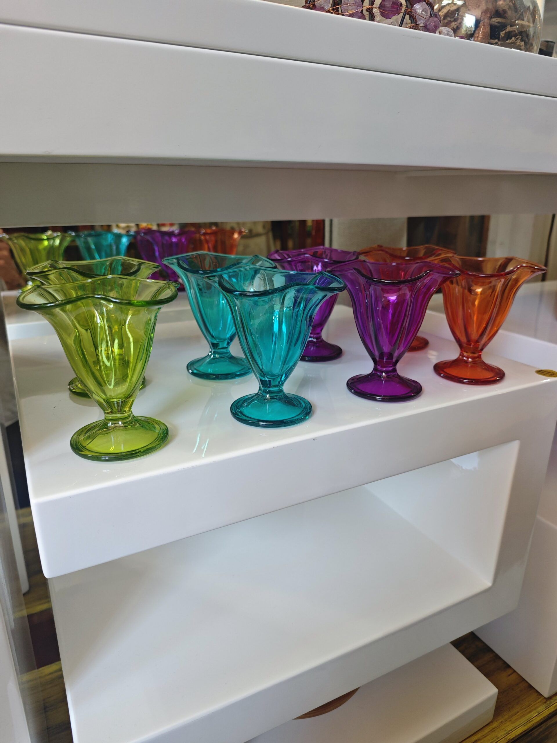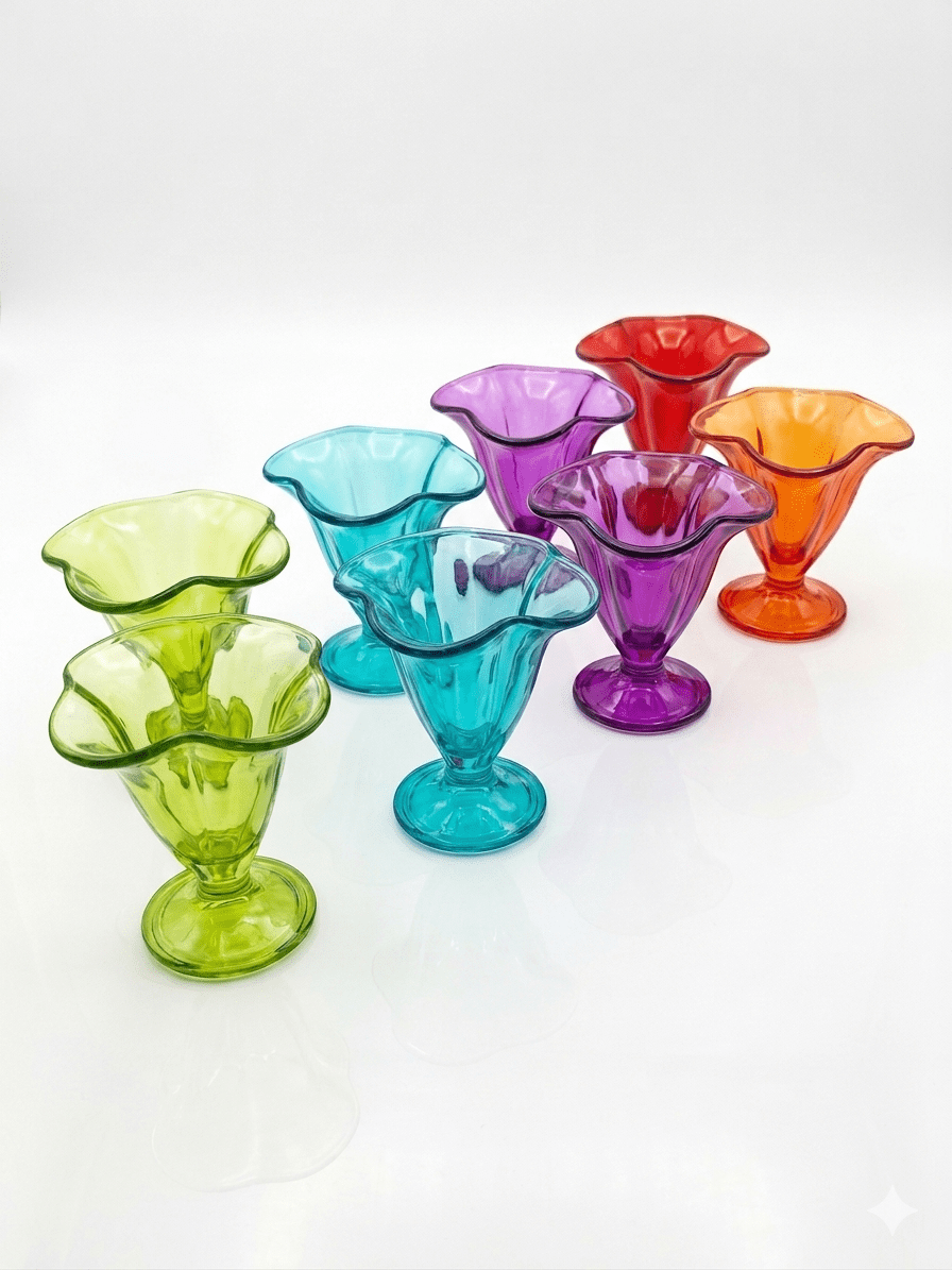 Añada un toque de alegría y sofisticación retro a su mesa con este vibrante set de copas de helado. Este conjunto destaca por su cristal de alta calidad en una paleta de colores joya —verde lima, azul turquesa, púrpura amatista y naranja mandarina— que captura la luz de forma espectacular.