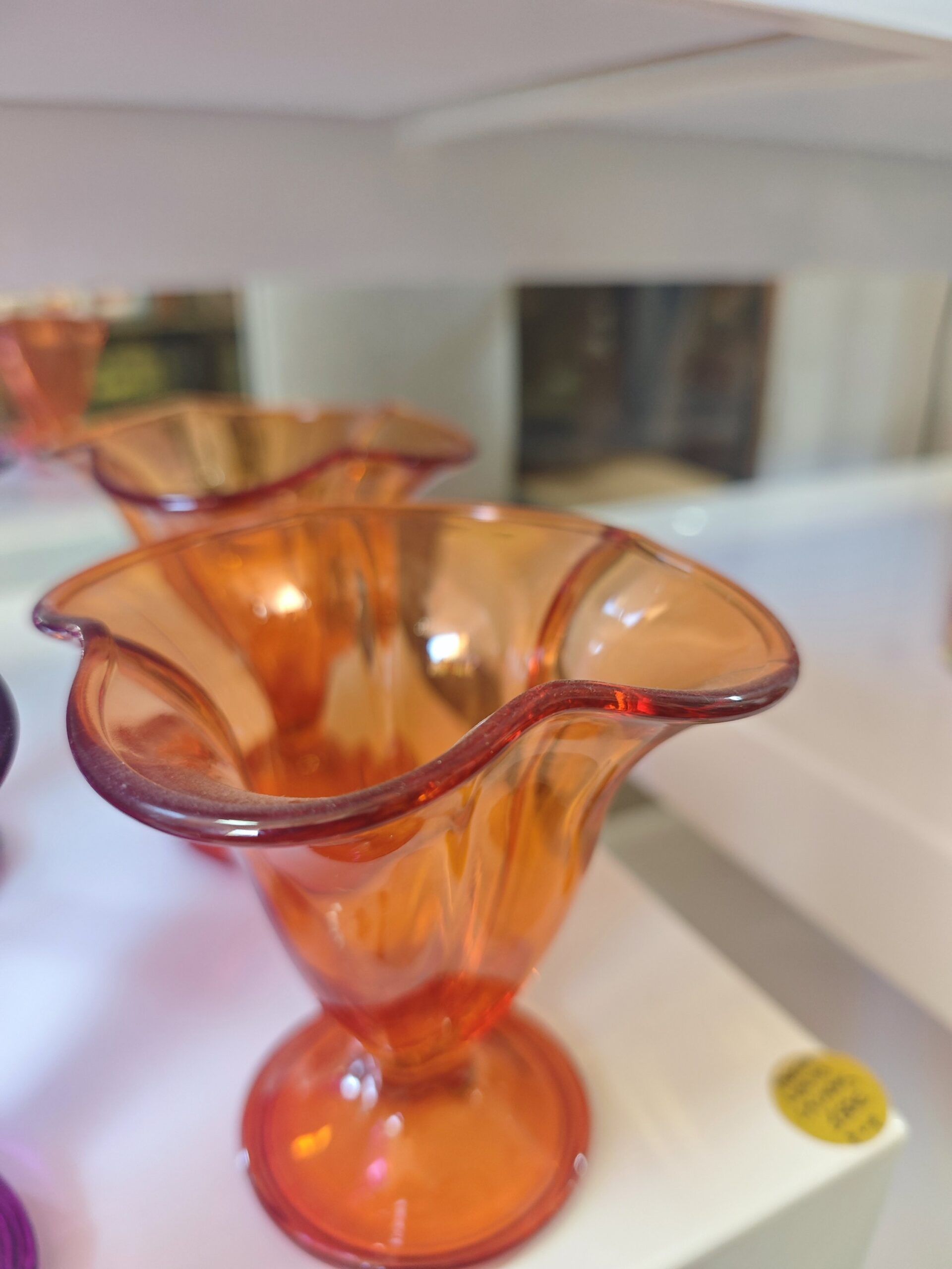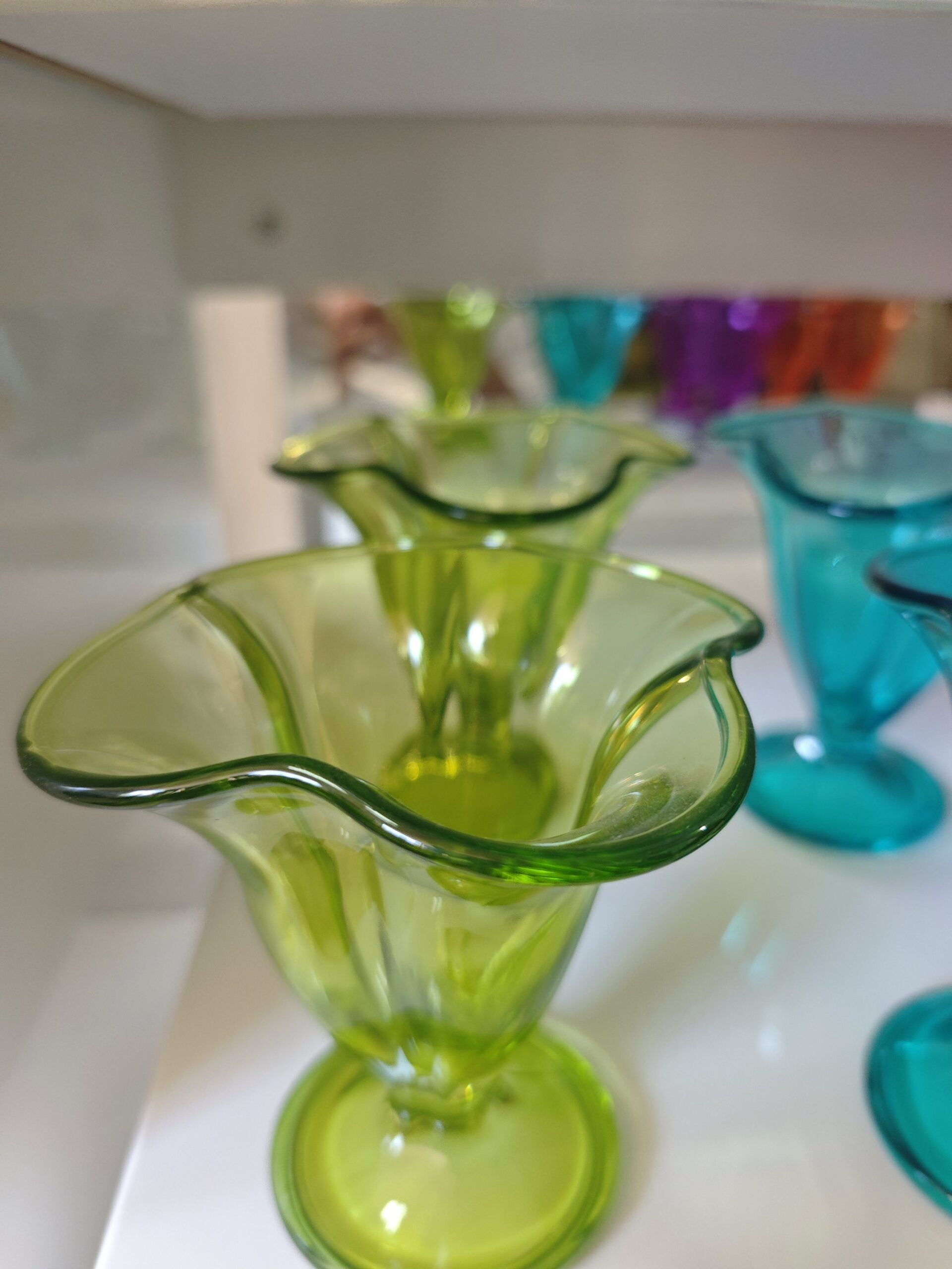 La cristalería de colores vivió su máximo esplendor entre las décadas de 1950 y 1970, cuando los hogares buscaban romper con la sobriedad de la posguerra. Estas copas en particular encajan perfectamente en una decoración Retro-Vintage, Boho Chic o incluso en ambientes contemporáneos que necesiten un «pop» de color focalizado.