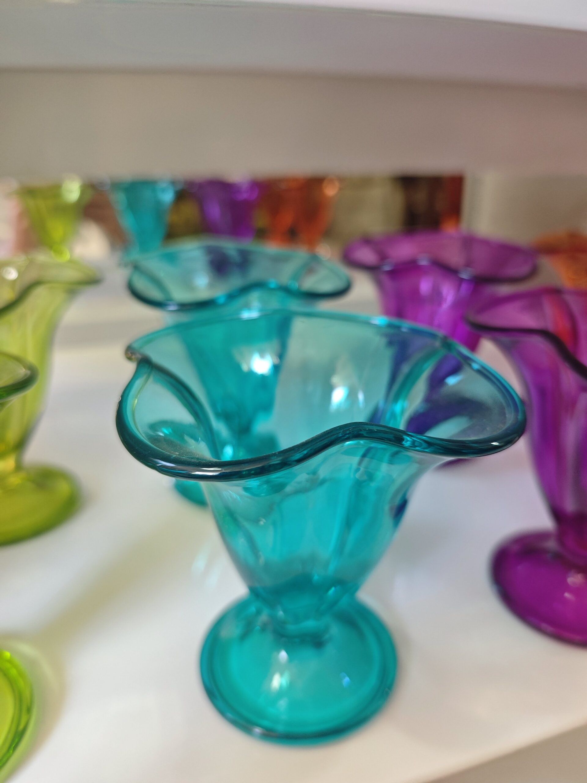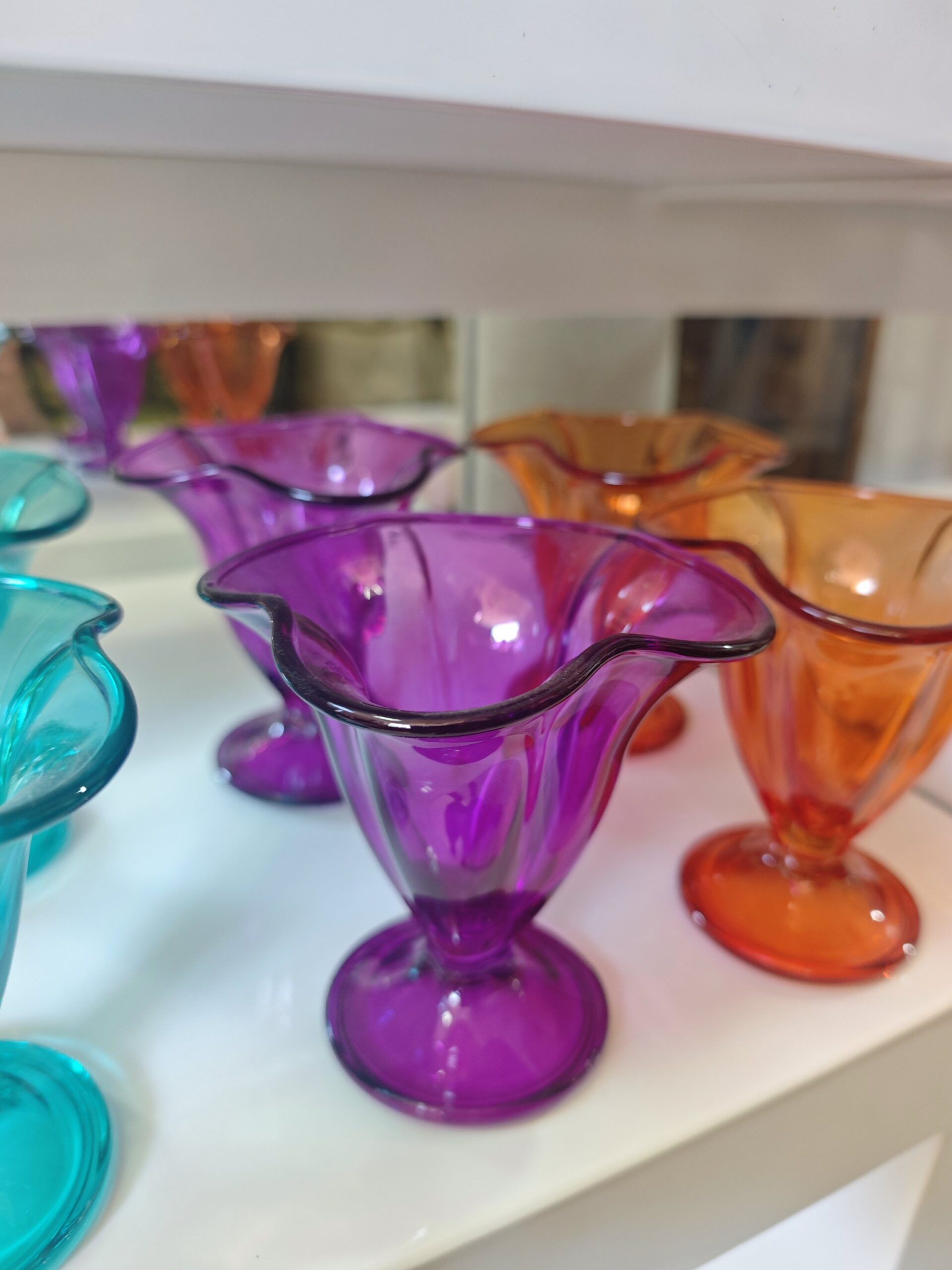 Es una inversión en estilo y durabilidad. A diferencia de la cristalería moderna desechable, estas copas tienen un peso sólido y un acabado artesanal en sus bordes que eleva cualquier postre casero a una experiencia de alta repostería. Además, al ser colores distintos, cada invitado puede identificar fácilmente su copa durante una cena social.