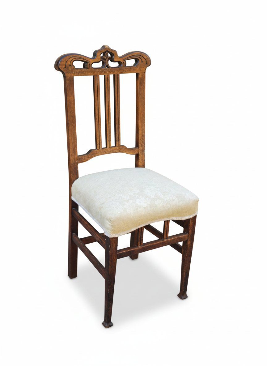 Silla antigua de madera maciza con respaldo tallado y barrotes verticales, que combina elegancia clásica con carácter artesanal. El asiento está tapizado en terciopelo claro, aportando suavidad y contraste al acabado cálido de la madera. Su diseño equilibrado entre lo decorativo y lo funcional la convierte en una pieza versátil, perfecta para comedores, rincones de lectura o ambientes que valoran el encanto de lo auténtico. La presencia de plantas y entorno natural en la escena refuerza su potencial como elemento decorativo en espacios interiores con alma.