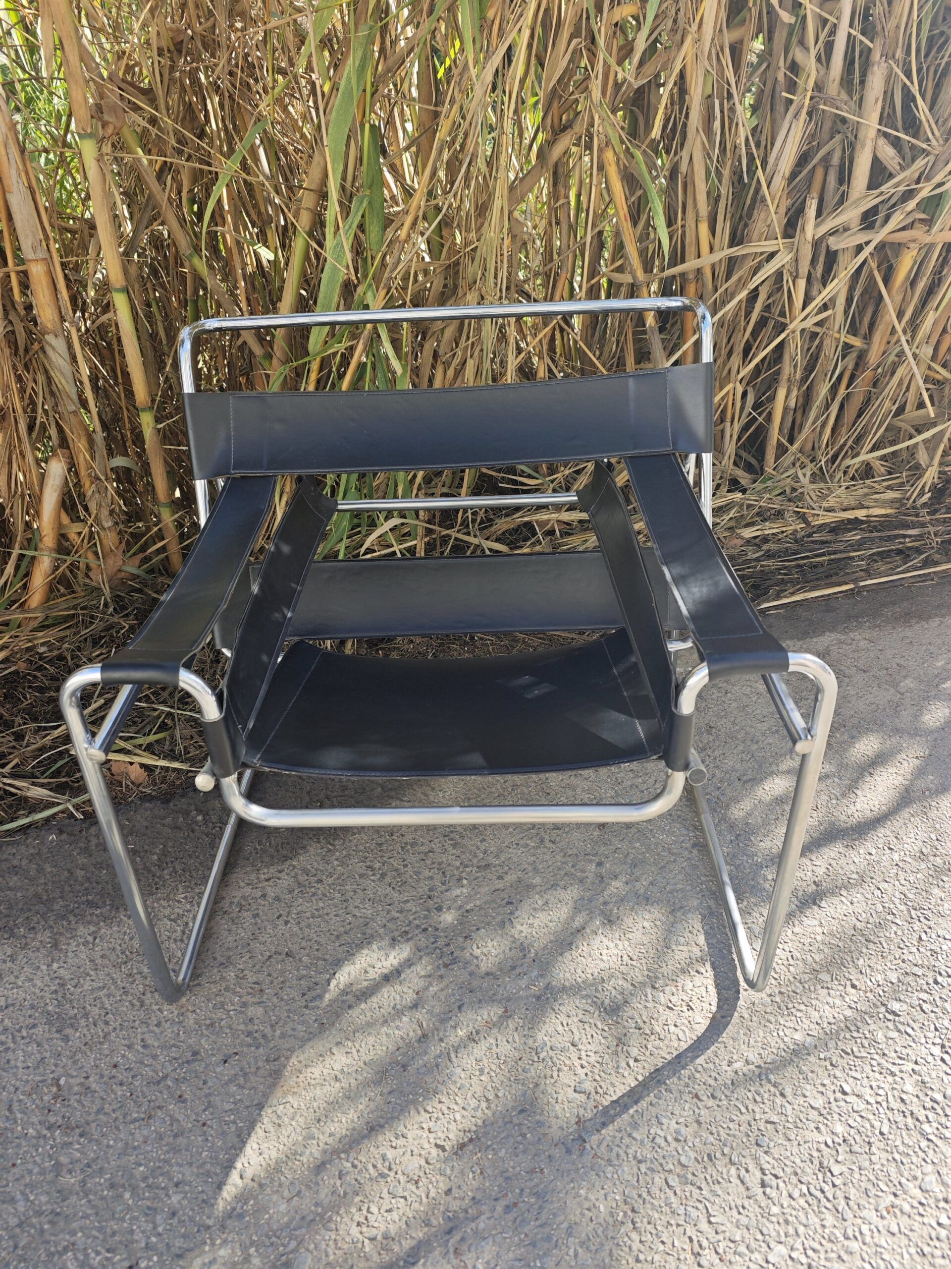 • Elegante silla de inspiración Bauhaus, basada en el diseño original de Marcel Breuer. Estructura de tubo de acero cromado de alta resistencia con bandas de cuero negro de gran calidad. Una pieza atemporal que aporta un aire de sofisticación moderna a cualquier oficina o salón.