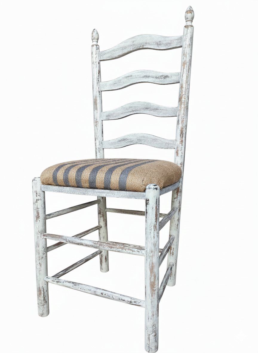 Silla de madera envejecida maciza con acabado blanco  y asiento decorativo tejido. Diseño rústico y artesanal, ideal para interiores con carácter.