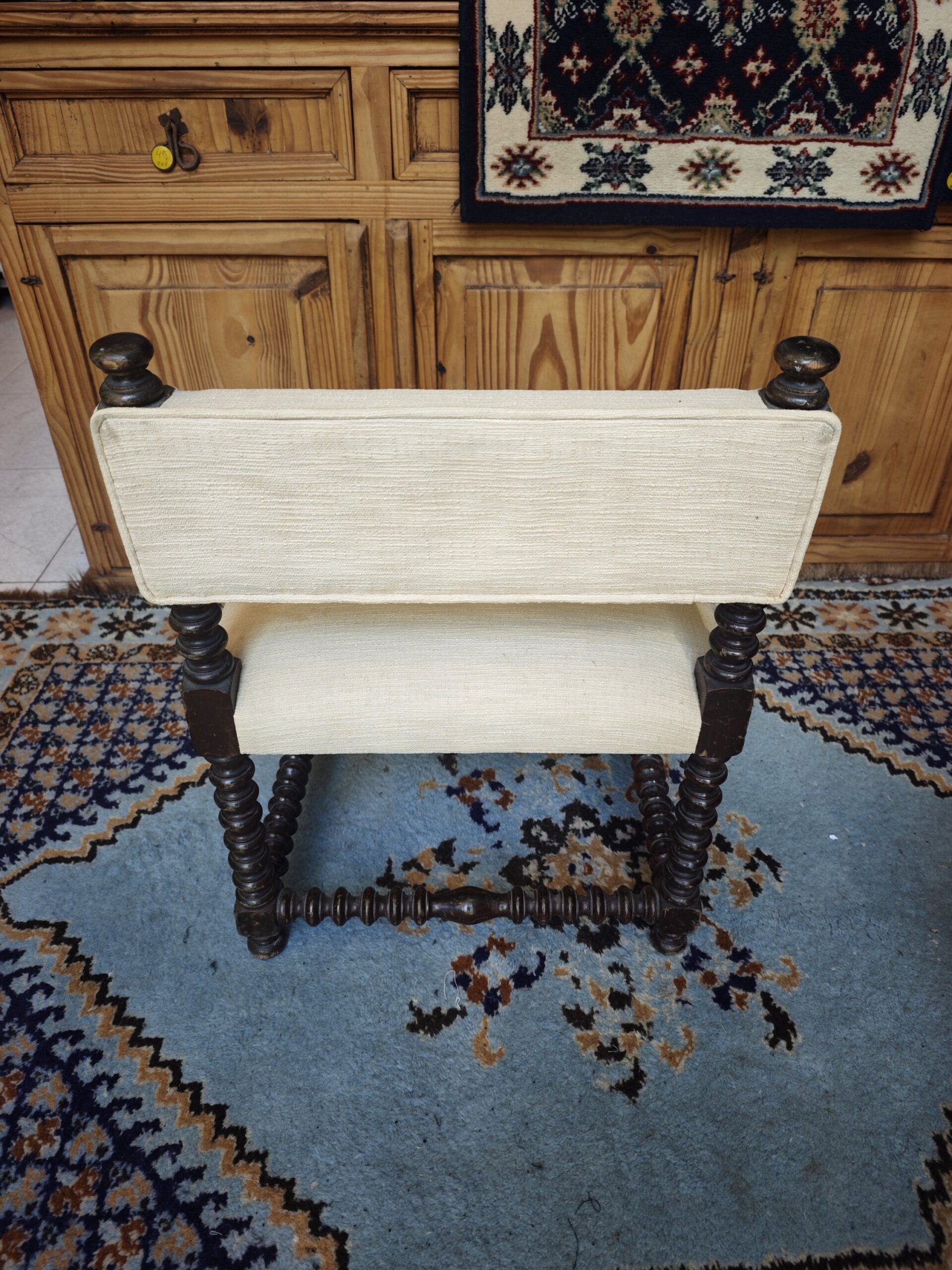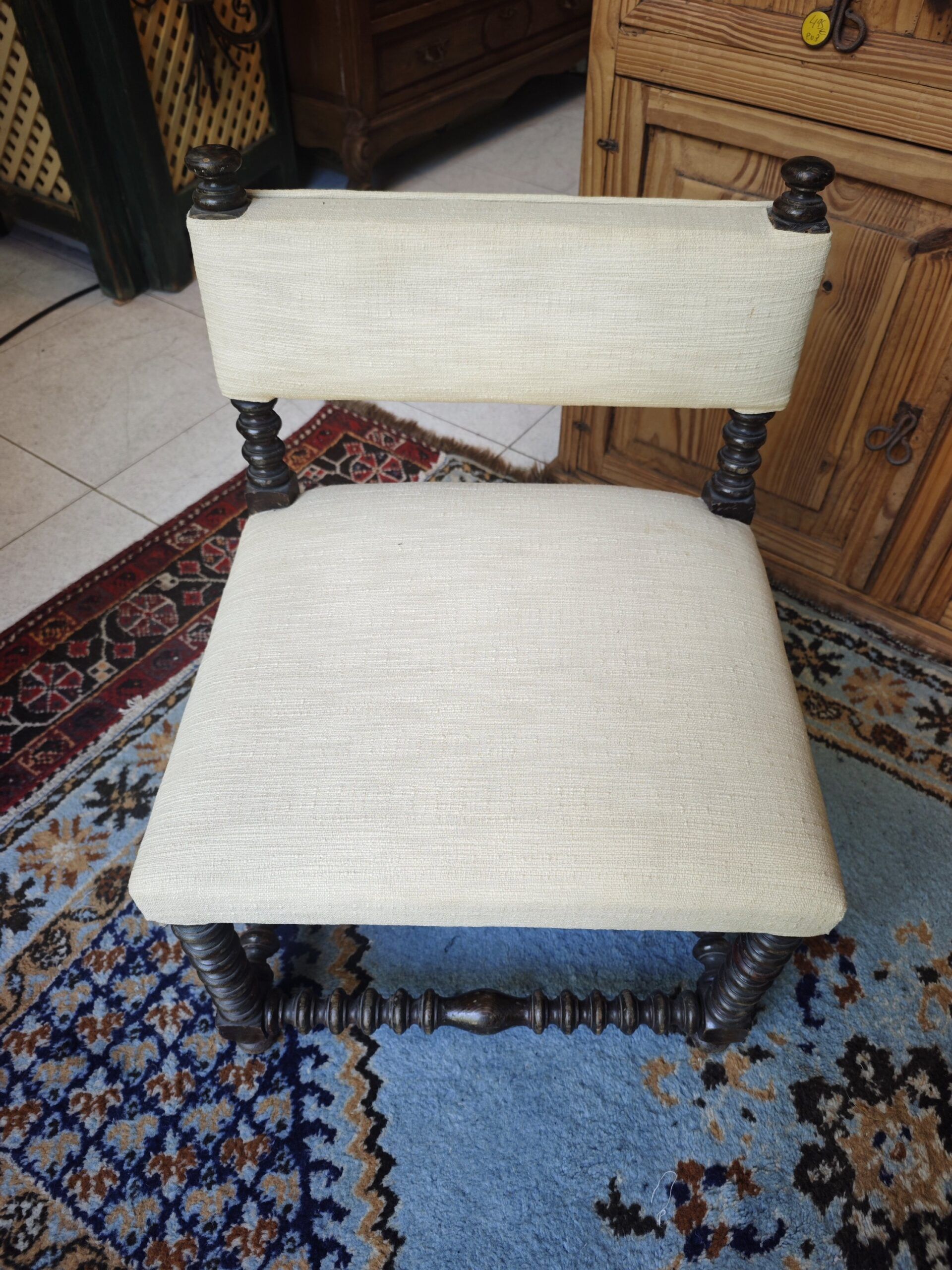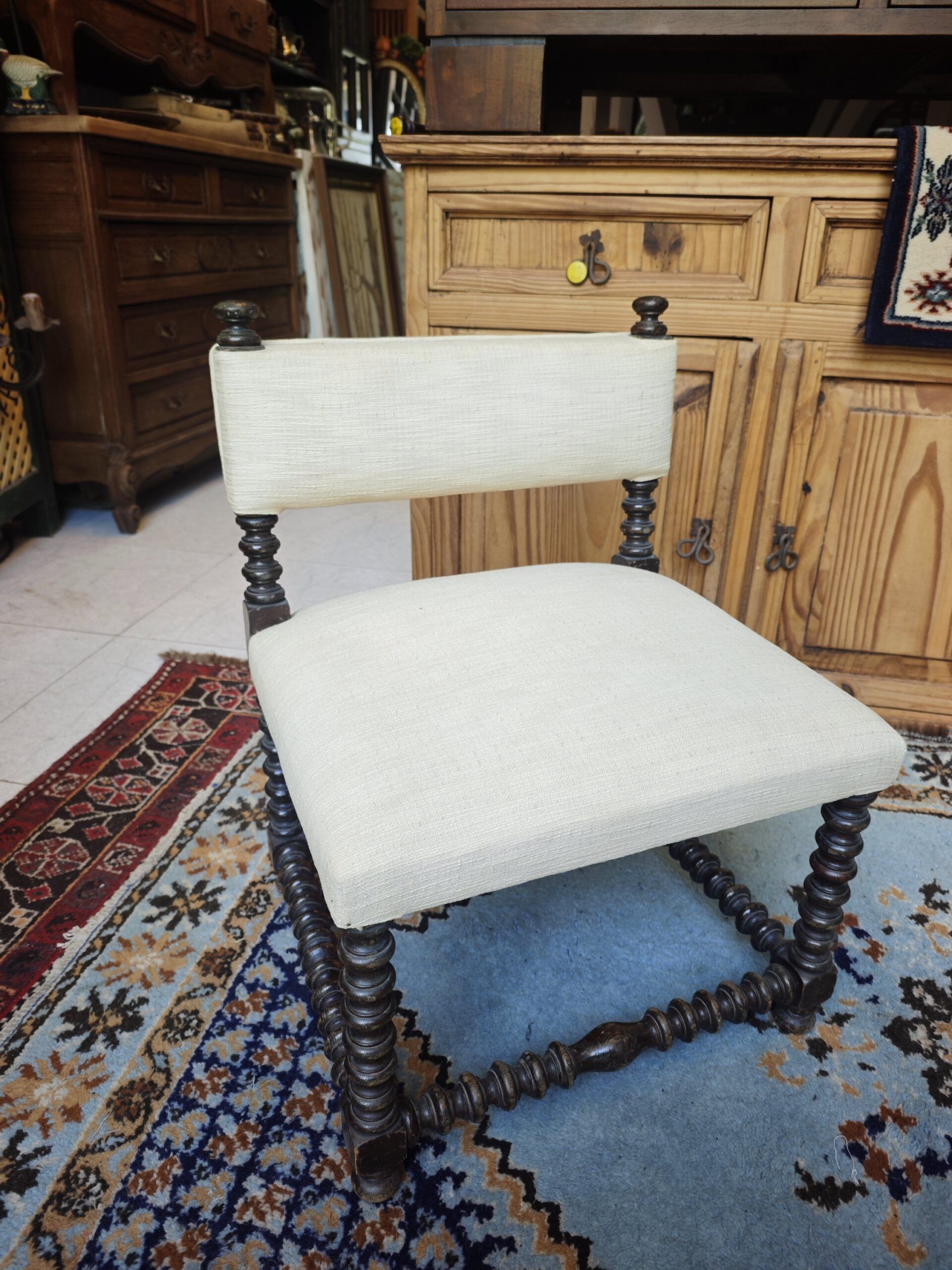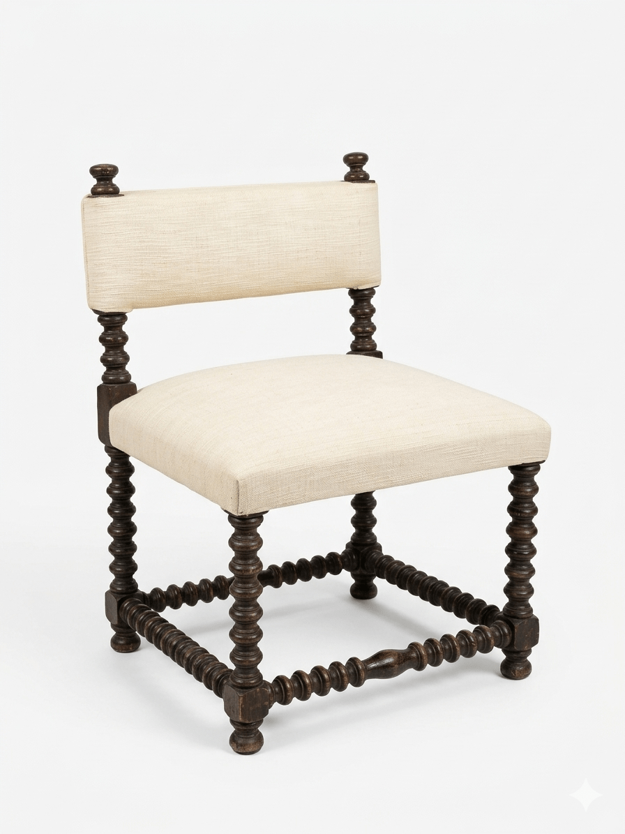 El acabado de la madera en tono oscuro nogal contrasta magistralmente con el tapizado en lino o tejido texturizado en color crema/marfil, que ha sido renovado para aportar una luminosidad contemporánea a una estructura con siglos de historia. Las terminaciones en forma de pomo en la parte superior del respaldo son el sello distintivo de las sillas de estilo «frailero», adaptadas aquí a un formato más bajo y acogedor.