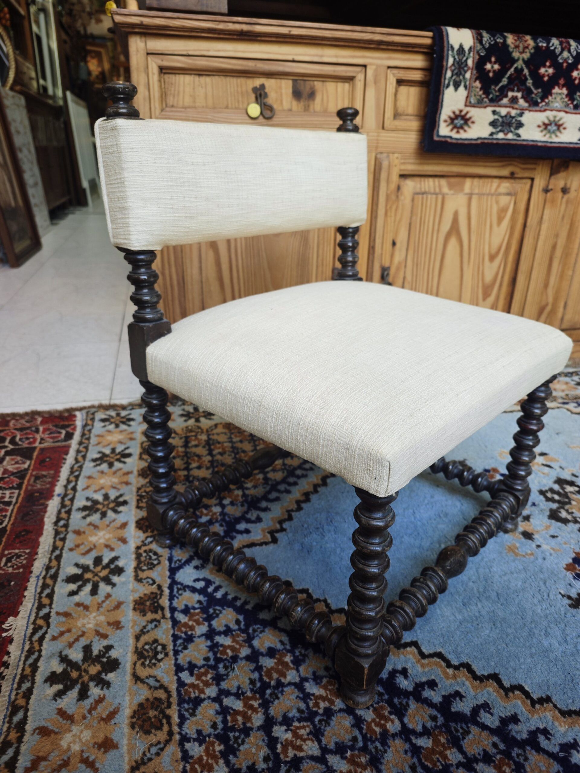 Esta excepcional silla descalzadora es una oda a la ebanistería tradicional española del siglo XIX y principios del XX, inspirada en los diseños austeros pero señoriales del Renacimiento español. El elemento protagonista es, sin duda, su estructura de madera maciza tallada íntegramente en «torneado de rosario» (o de bolas), una técnica laboriosa que otorga una textura rítmica y una presencia escultural única a las patas, los travesaños y los montantes del respaldo.
