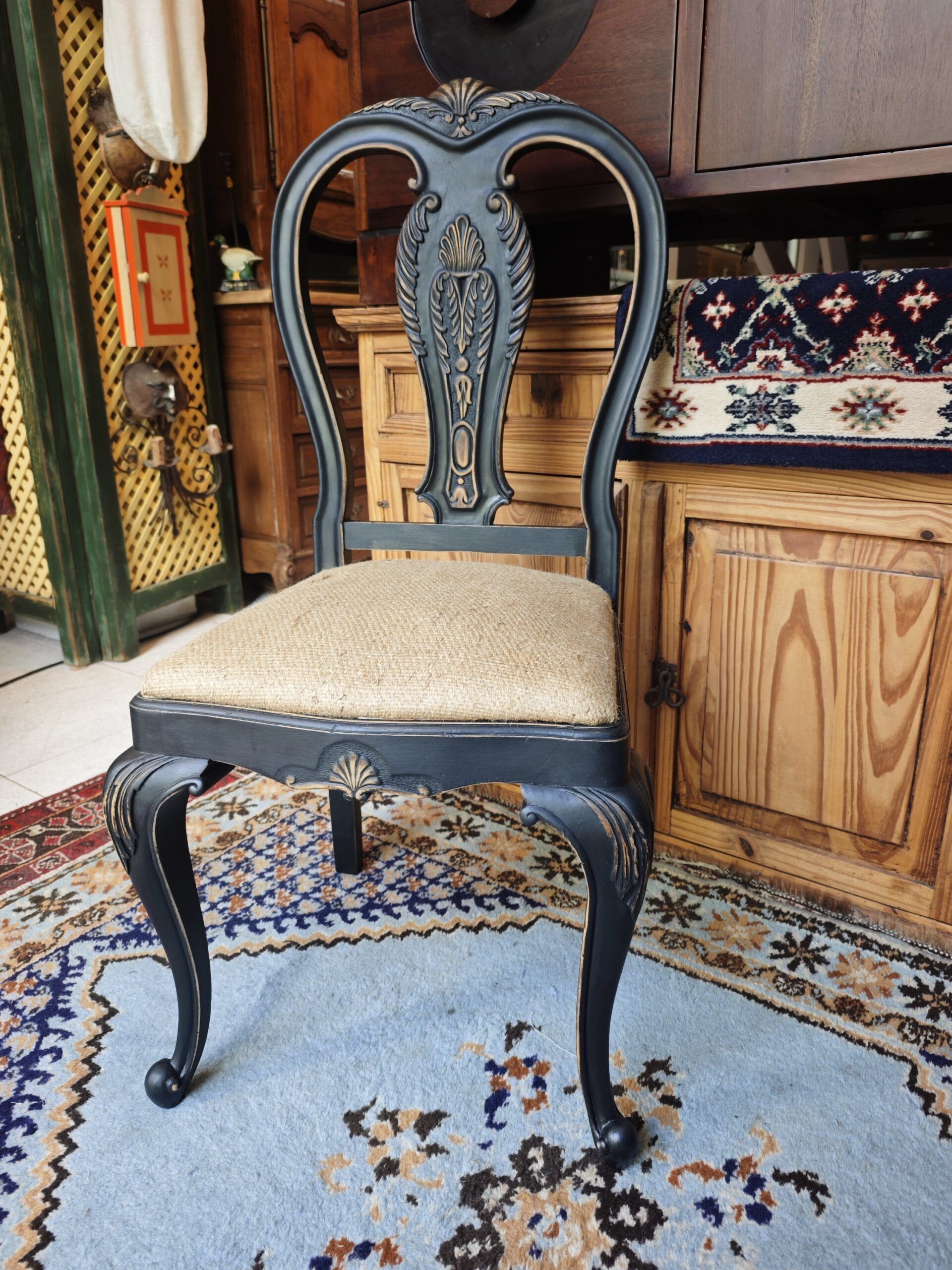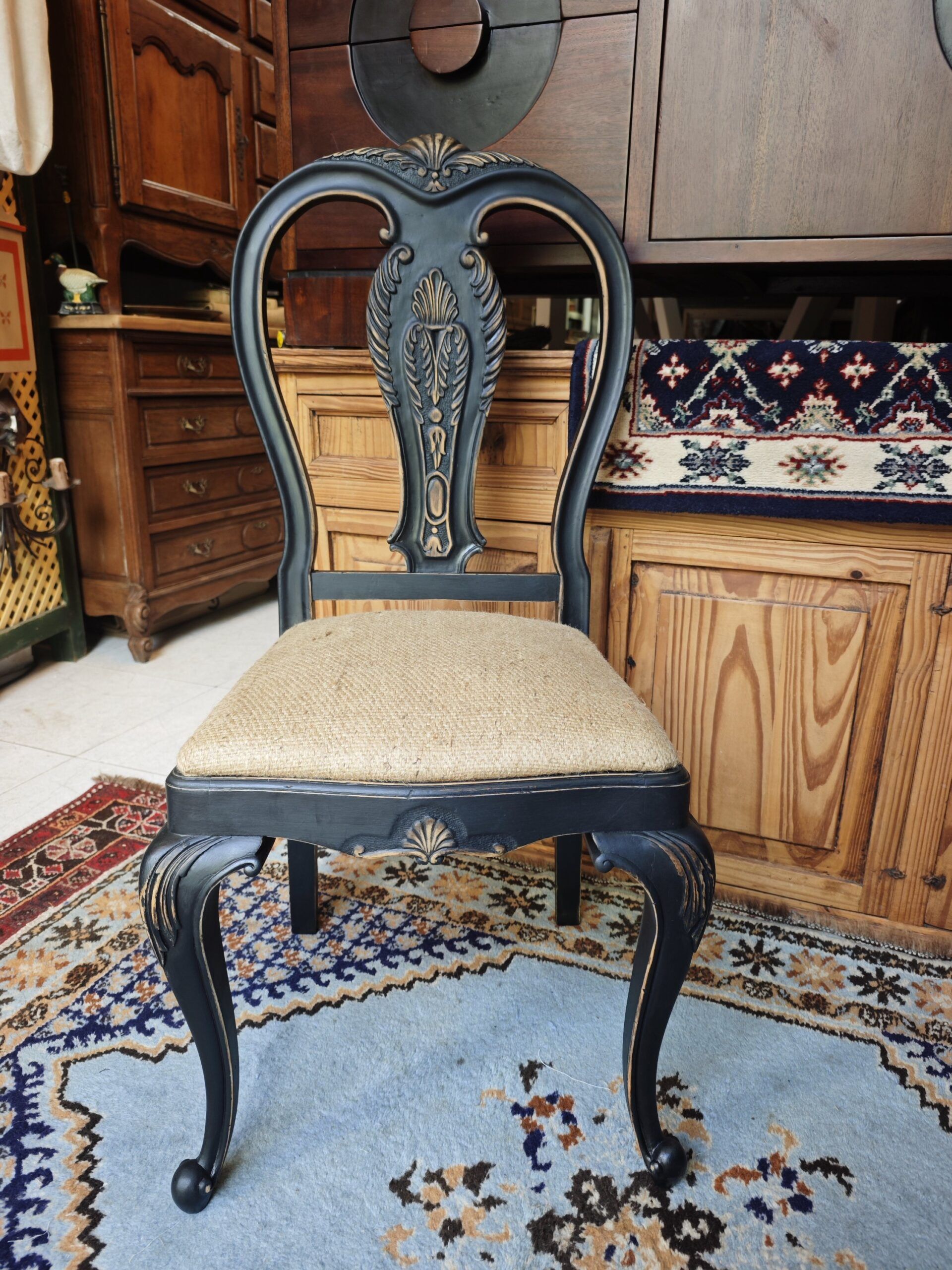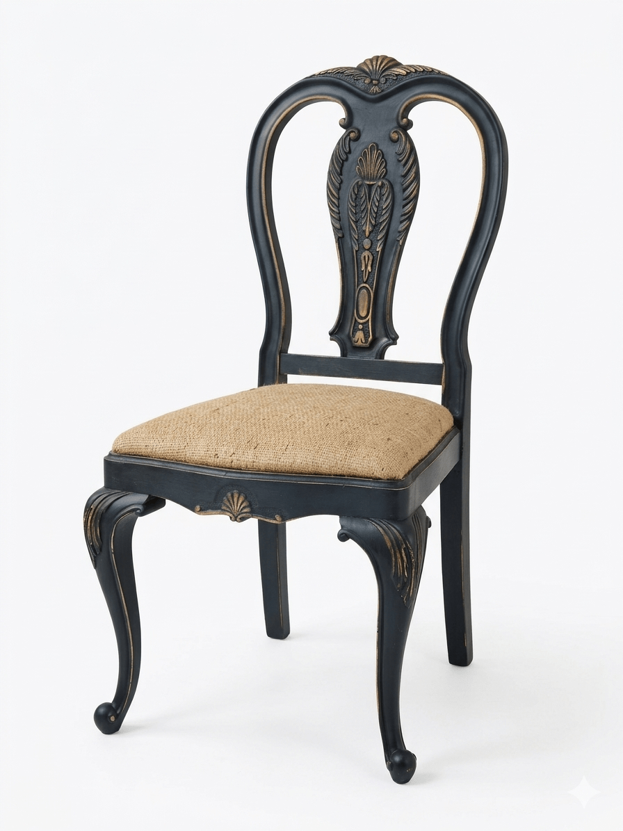 El respaldo es una verdadera obra de arte tallada. Luce un motivo central de venera (concha) y volutas acanto que fluyen hacia los hombros de la pieza, todo resaltado por un acabado en negro satinado con una técnica de decapado artesanal. Este acabado permite que los relieves dorados y la calidez de la madera original asomen tímidamente, creando un efecto de «antigüedad vivida». El contraste definitivo lo aporta el asiento, tapizado en arpillera de saco natural, que rompe la formalidad del negro con una textura rústica, orgánica y sumamente chic.