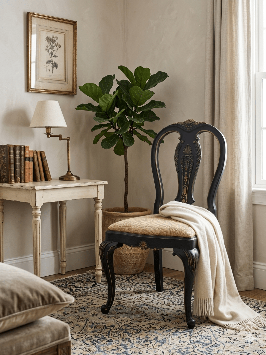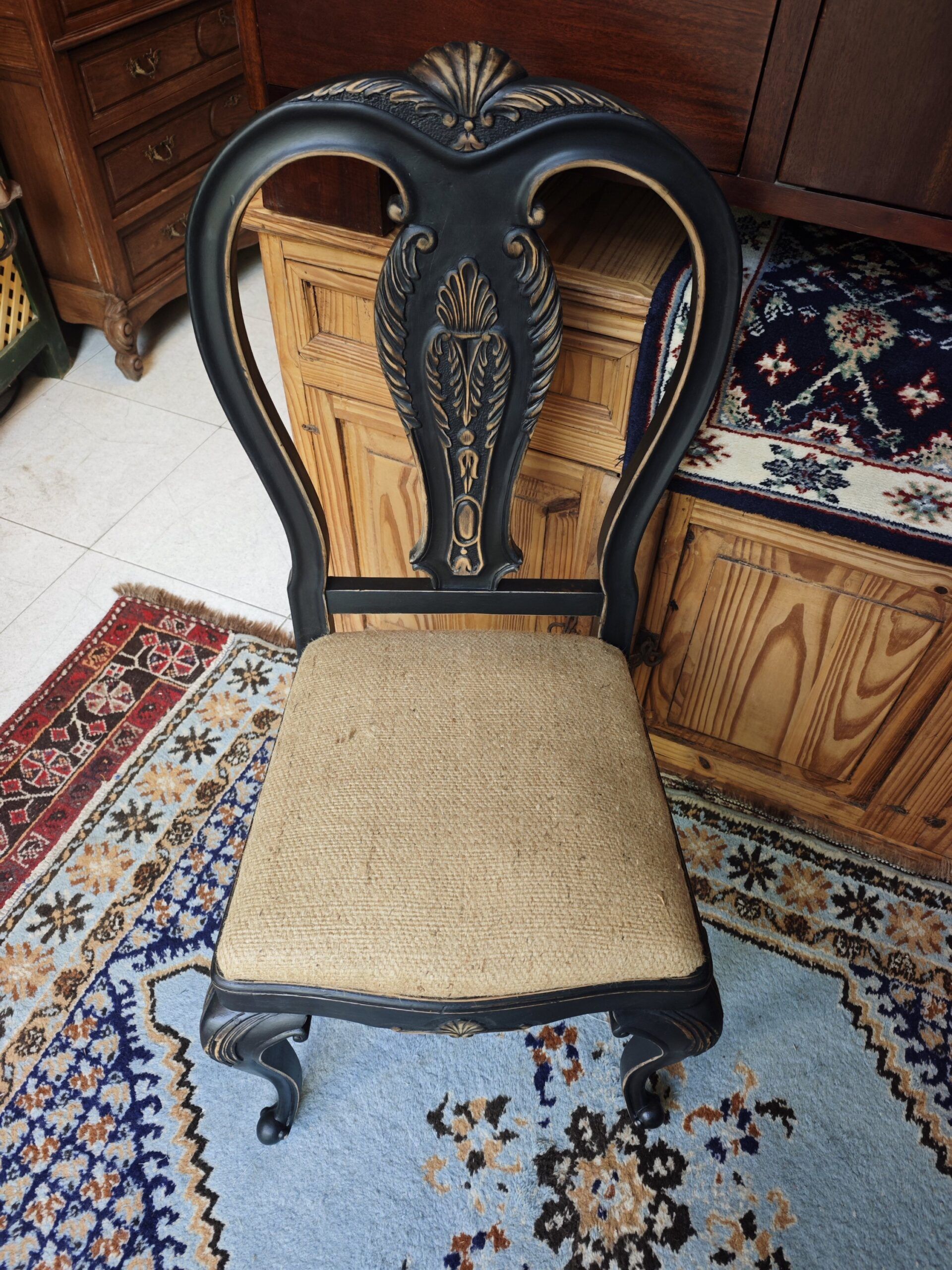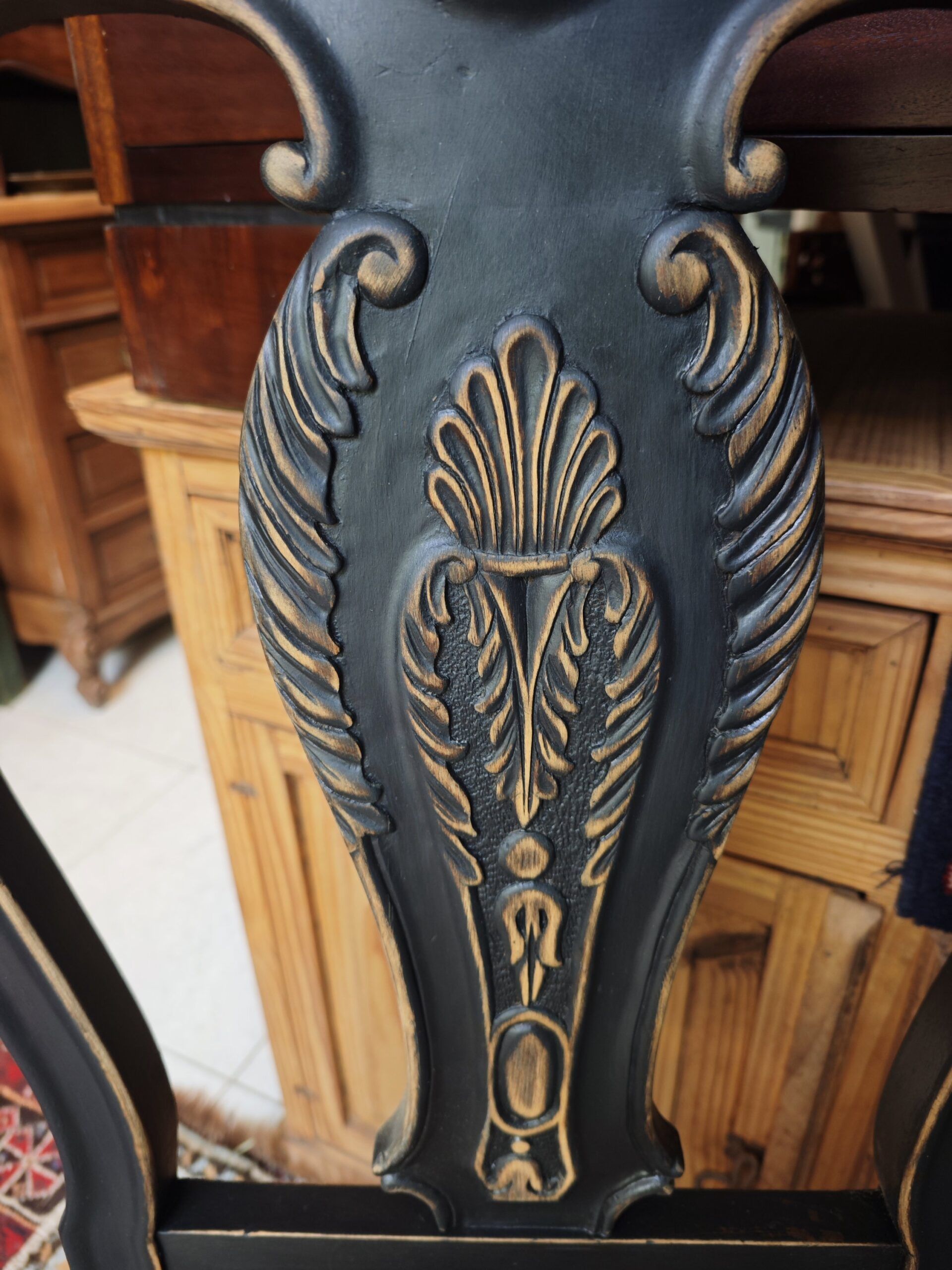 El respaldo es una verdadera obra de arte tallada. Luce un motivo central de venera (concha) y volutas acanto que fluyen hacia los hombros de la pieza, todo resaltado por un acabado en negro satinado con una técnica de decapado artesanal. Este acabado permite que los relieves dorados y la calidez de la madera original asomen tímidamente, creando un efecto de «antigüedad vivida». El contraste definitivo lo aporta el asiento, tapizado en arpillera de saco natural, que rompe la formalidad del negro con una textura rústica, orgánica y sumamente chic.