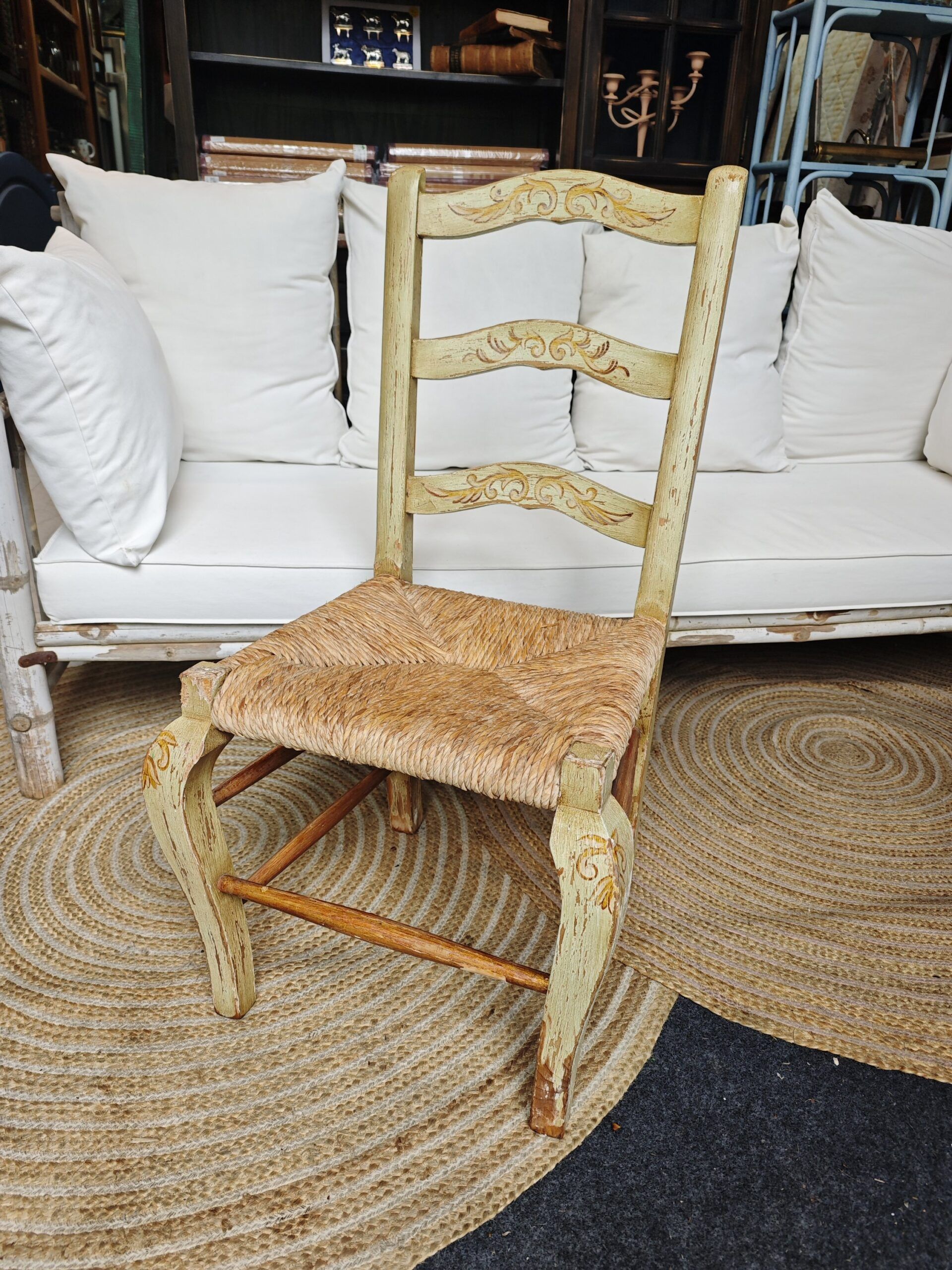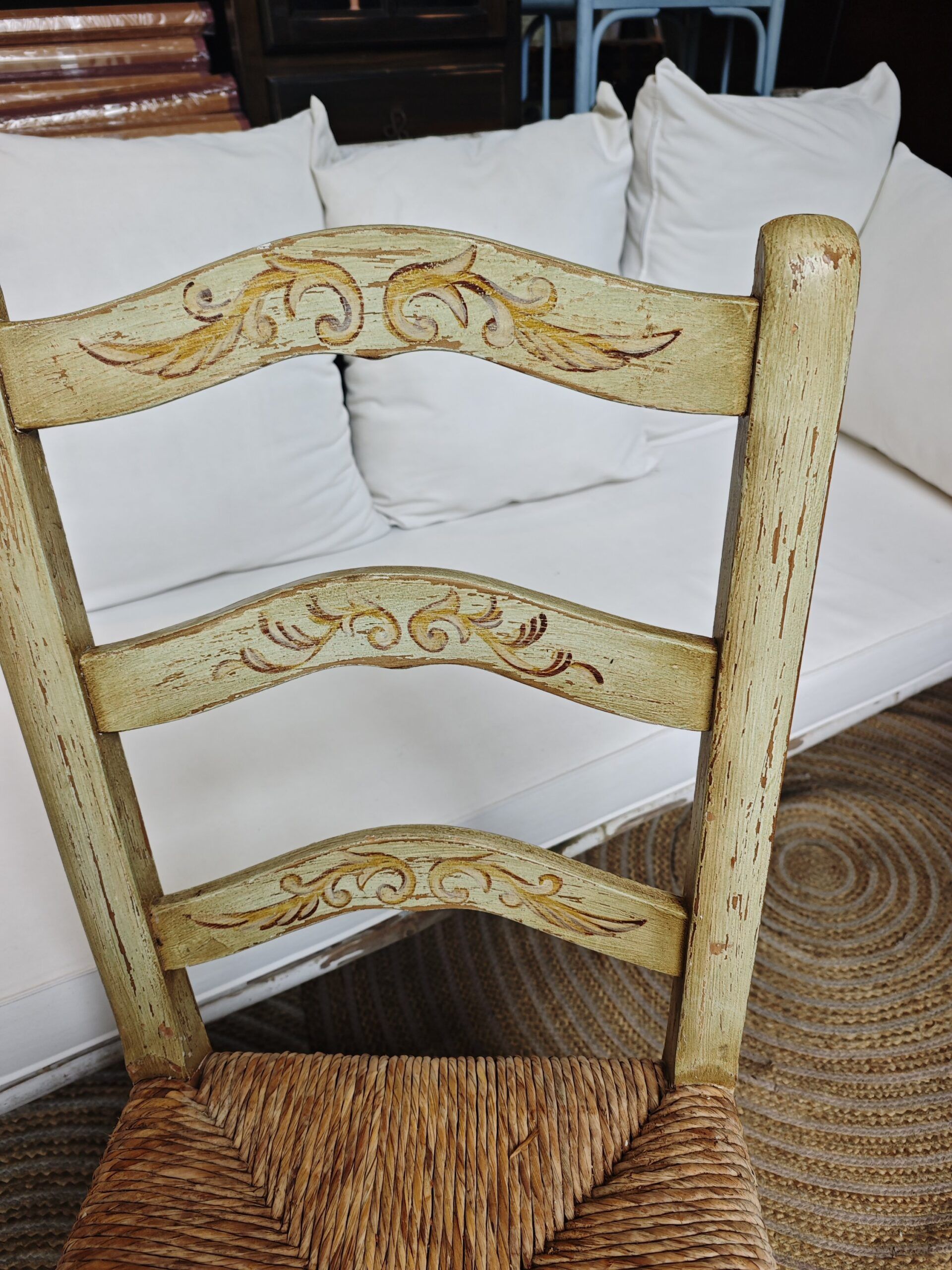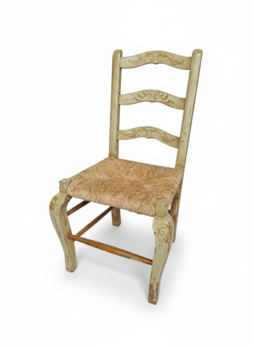 Esta silla de estilo provenzal se caracteriza por su acabado decapado artesanal y sus delicados motivos ornamentales pintados a mano en el respaldo y las patas. La pieza presenta una estructura de madera maciza en tono crema envejecido, decorada con detalles vegetales y florales que realzan su estética campestre. El asiento de enea natural está tejido de forma tradicional, aportando una textura orgánica y gran durabilidad al conjunto. Su diseño incluye patas delanteras curvadas y un respaldo de tres listones horizontales donde destaca la pintura decorativa. Es una pieza ideal para ambientes de estilo Shabby Chic, comedores rústicos o como mueble auxiliar en dormitorios de aire romántico.