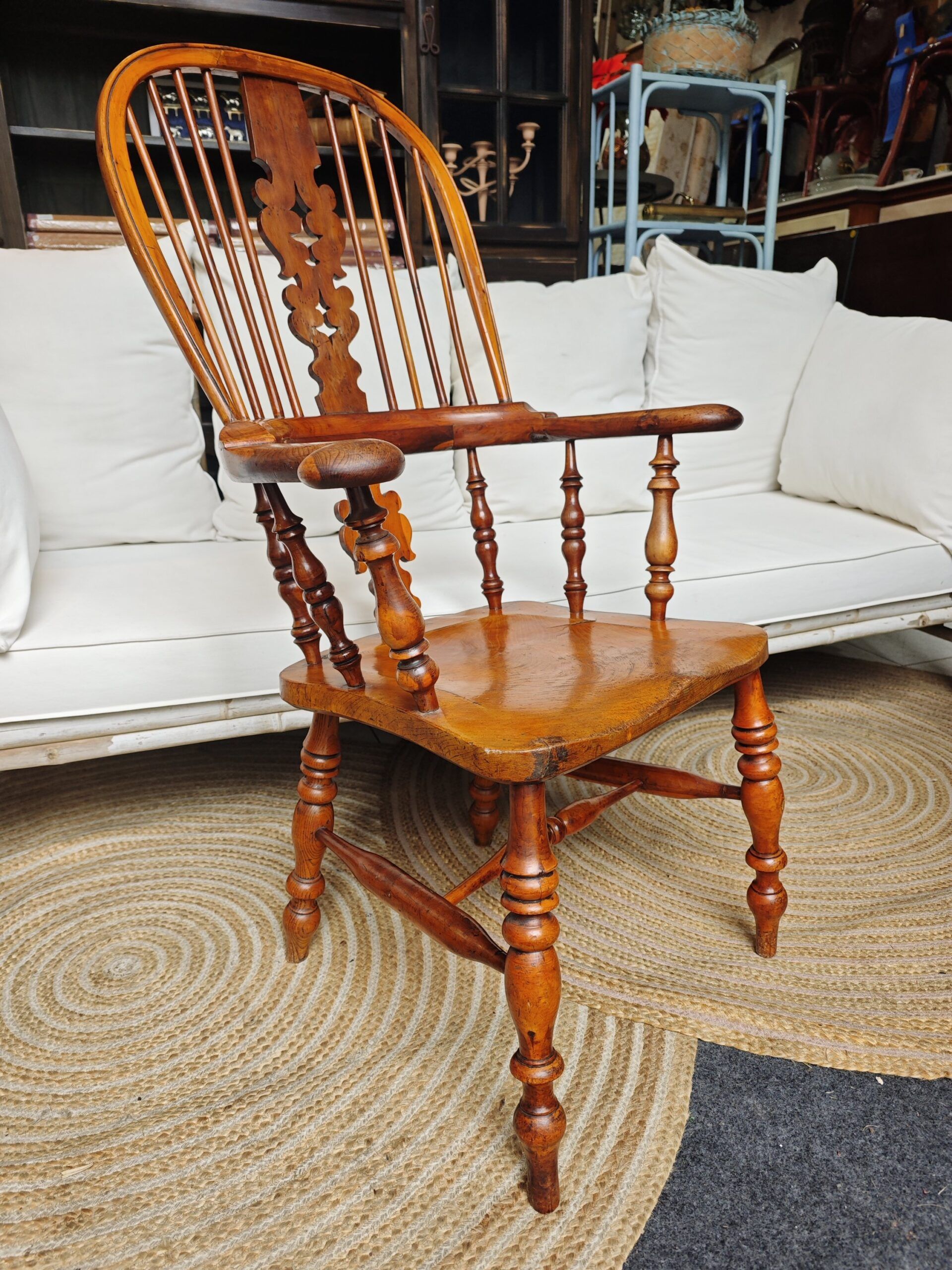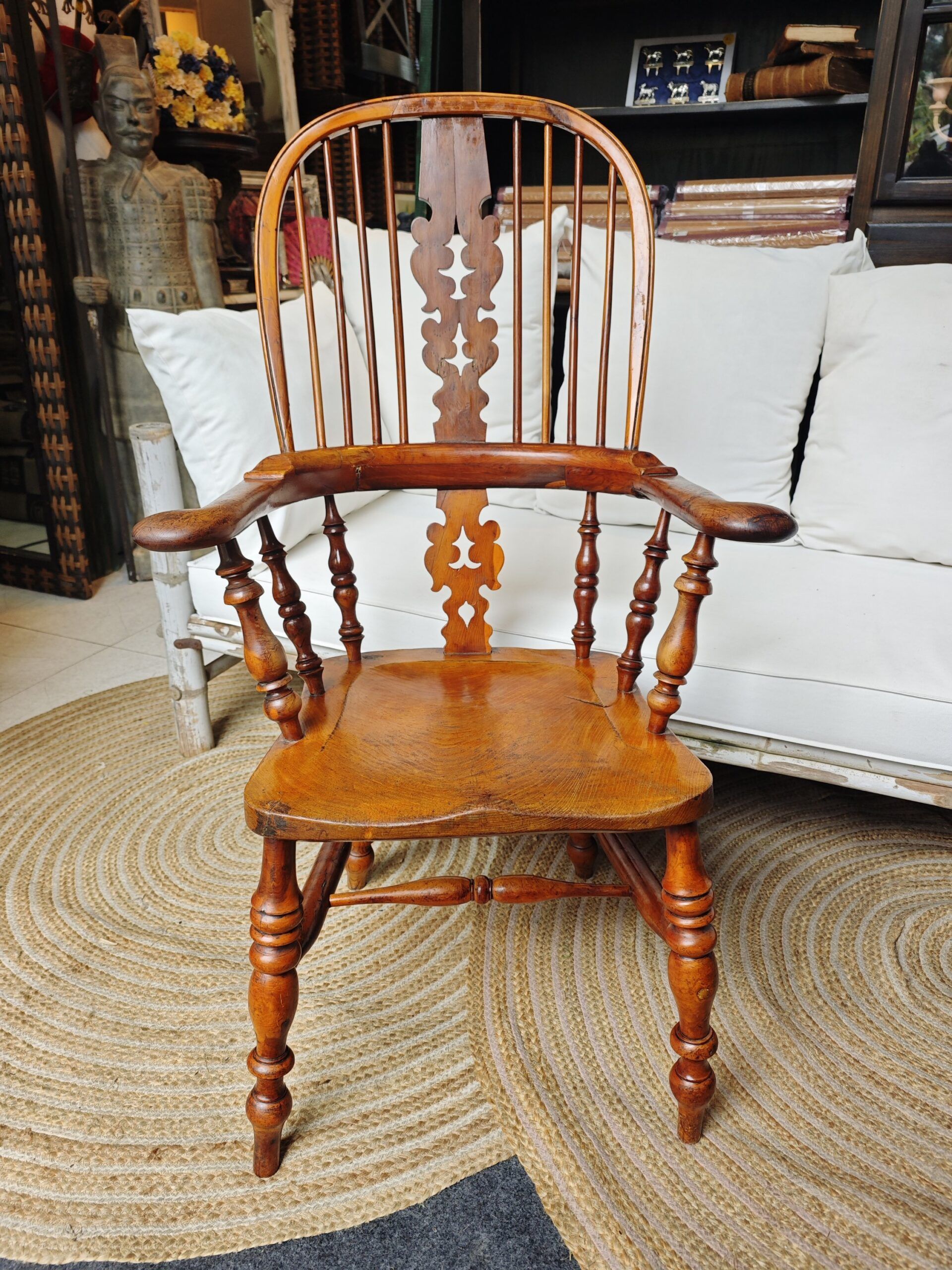Silla estilo Windsor de roble macizo con respaldo alto y pala tallada. Pieza robusta de alta calidad. Medidas: 65 cm de ancho, 114 cm de altura y 46 cm de altura de asiento.