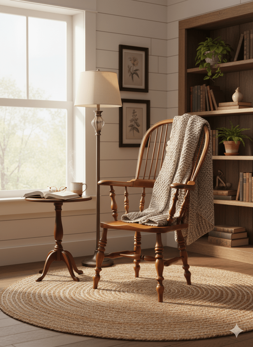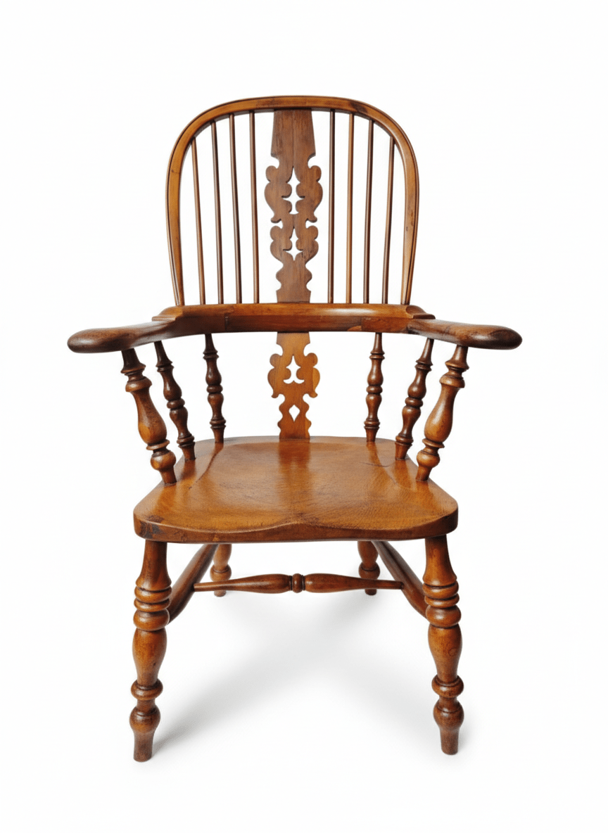 Esta magnífica silla Windsor de gran formato es una pieza de colección fabricada íntegramente en madera de roble macizo, conocida por su excepcional dureza y la belleza de su veta natural. El diseño destaca por su impresionante respaldo de 114 cm de altura, que presenta un arco superior curvado al vapor y una elegante pala central tallada con motivos de lira, un detalle artesanal que eleva la pieza por encima de los modelos estándar. Sus reposabrazos ergonómicos y el asiento anatómico, también tallado en roble, ofrecen una sentada cómoda y firme. Las patas torneadas están reforzadas con un travesaño en «H», garantizando una estructura robusta y duradera. Su acabado en tono roble medio aporta una calidez atemporal, ideal tanto para ambientes de estilo rústico refinado como para despachos clásicos o salones de inspiración colonial.