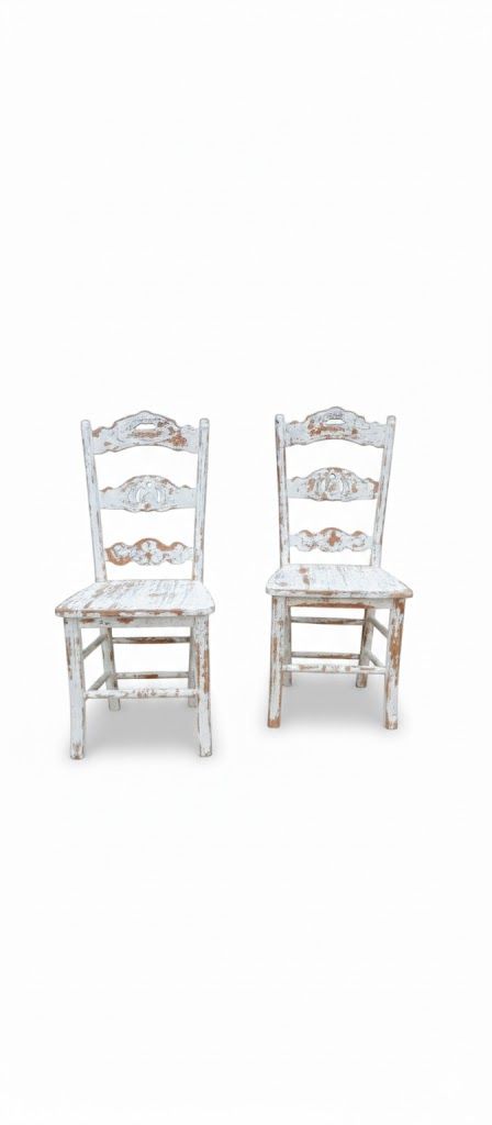 Par de sillas vintage en madera blanca decapada, con respaldo tallado y patas torneadas. Restauradas y listas para decorar cualquier espacio con estilo rústico o romántico.