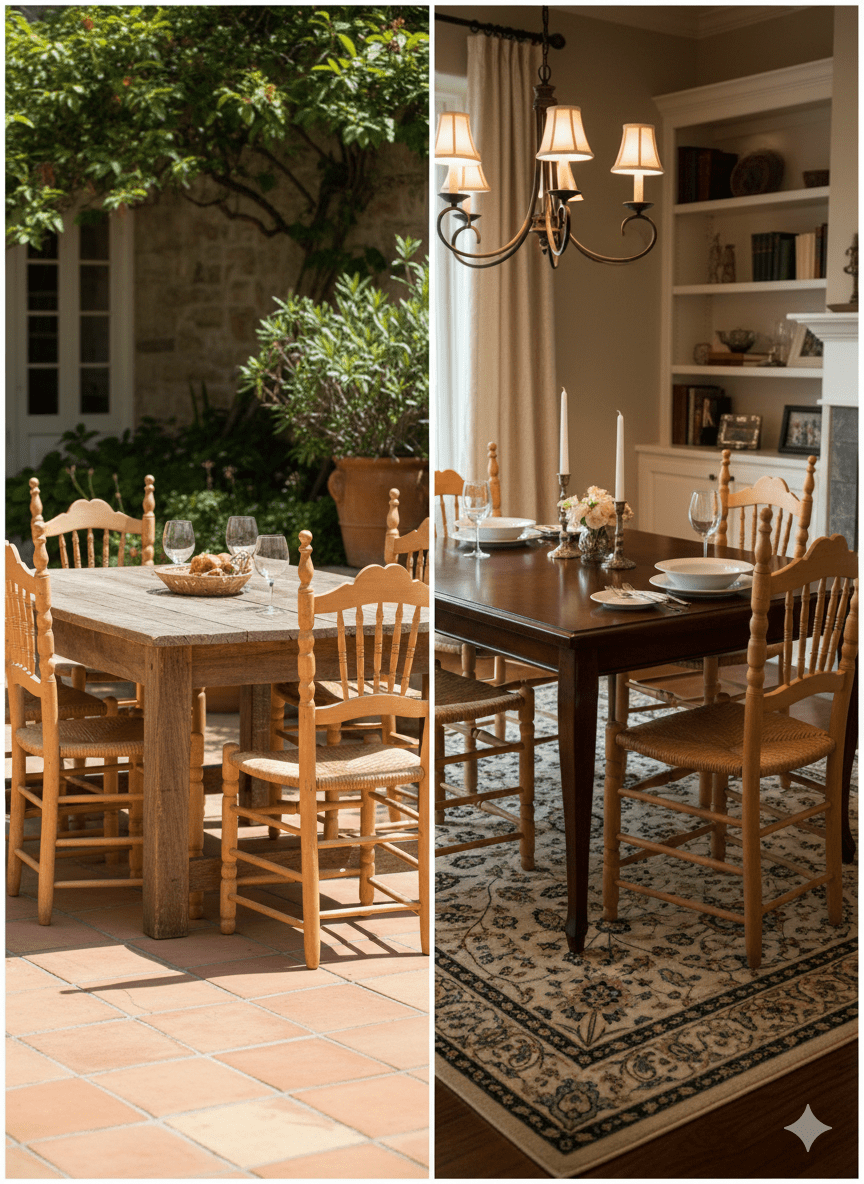 Este conjunto de 4 sillas de estilo castellano destaca por su fabricación robusta en madera maciza de pino con un acabado natural que resalta la veta original. El diseño presenta el clásico respaldo de barrotes torneados y remates decorativos en las esquinas, elementos característicos del mobiliario rústico español. El asiento está confeccionado en enea tejida a mano, proporcionando una base resistente, cómoda y transpirable. Gracias a su estructura reforzada con travesaños torneados, estas sillas ofrecen una gran durabilidad para uso diario en comedores, cocinas de estilo rústico o casas de campo. Su estética vintage encaja perfectamente en proyectos de decoración que buscan autenticidad y calidez mediante materiales nobles.