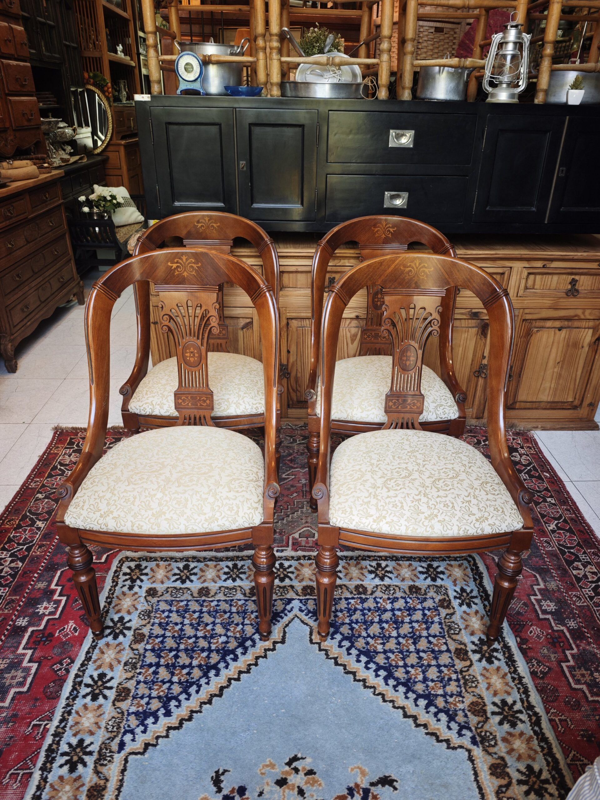 - Material: Estructura en madera noble maciza de tonos cálidos, con incrustaciones de marquetería fina y tapicería en tejido damasco.