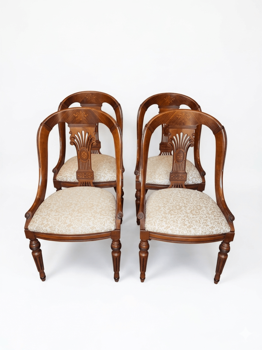 - Sello de autenticidad: Piezas de alta factura artesanal, con un diseño de respaldo tipo «lyre-back» que evoca el refinamiento de los salones europeos del siglo XIX.
