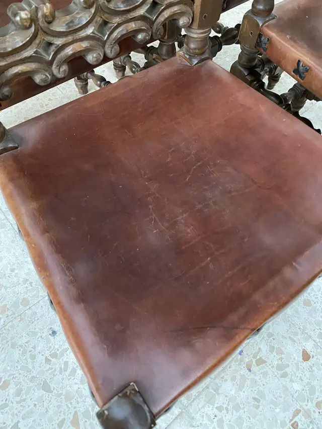 La estructura cuenta con patas y travesaños torneados en forma de carrete (bobbin-turned), lo que garantiza una robustez superior y una estética clásica atemporal. El asiento está tapizado en cuero marrón oscuro, fijado mediante tachuelas decorativas de metal envejecido (clavos), que refuerzan su autenticidad artesanal. Los remates superiores en forma de pináculo aportan una silueta arquitectónica única. Estas sillas son perfectas para comedores rústicos, salones señoriales o proyectos de interiorismo que busquen una pieza de acento con gran fuerza visual.