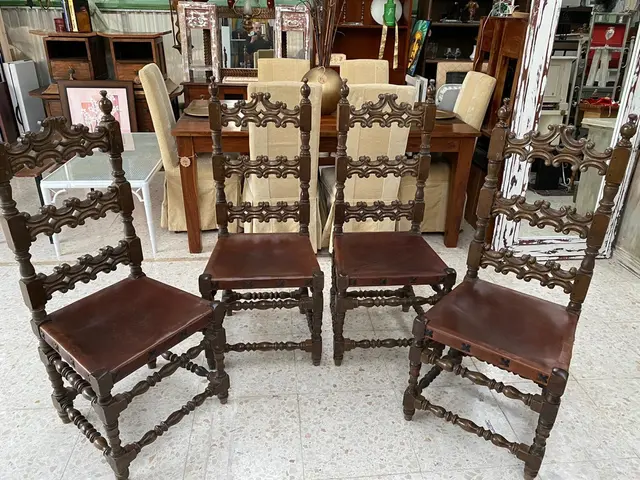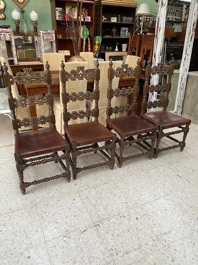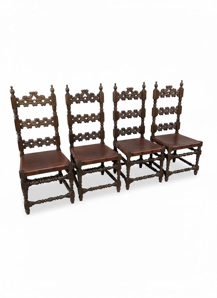 Este exclusivo set de 4 sillas de comedor es una pieza excepcional de mobiliario vintage, ideal para quienes buscan un diseño con carácter y elegancia histórica. Fabricadas en madera maciza de alta calidad, estas sillas siguen fielmente el estilo Renacimiento Español (Spanish Revival), destacando por su imponente respaldo de listones horizontales profusamente tallados a mano con motivos de volutas y calados artísticos.