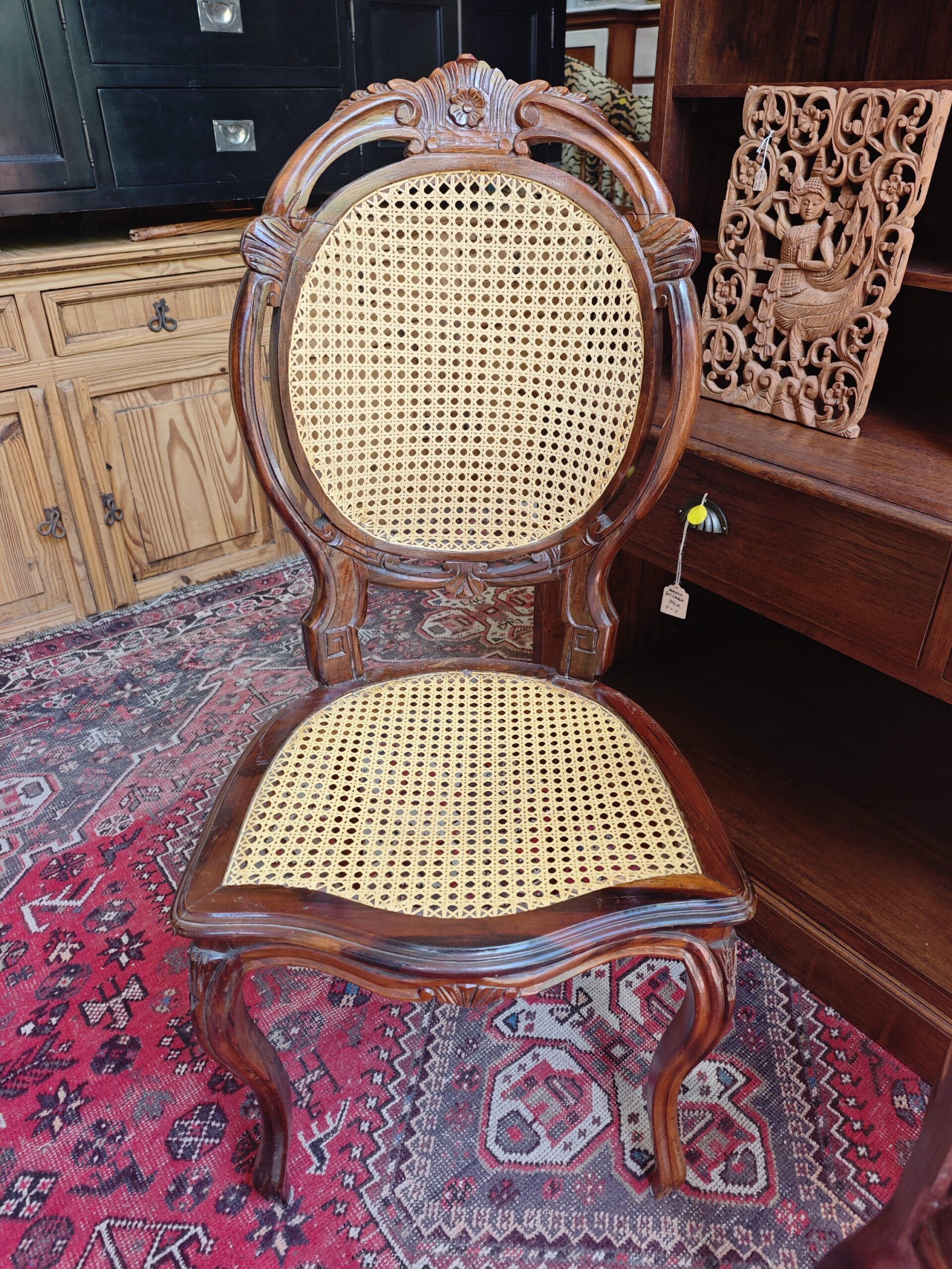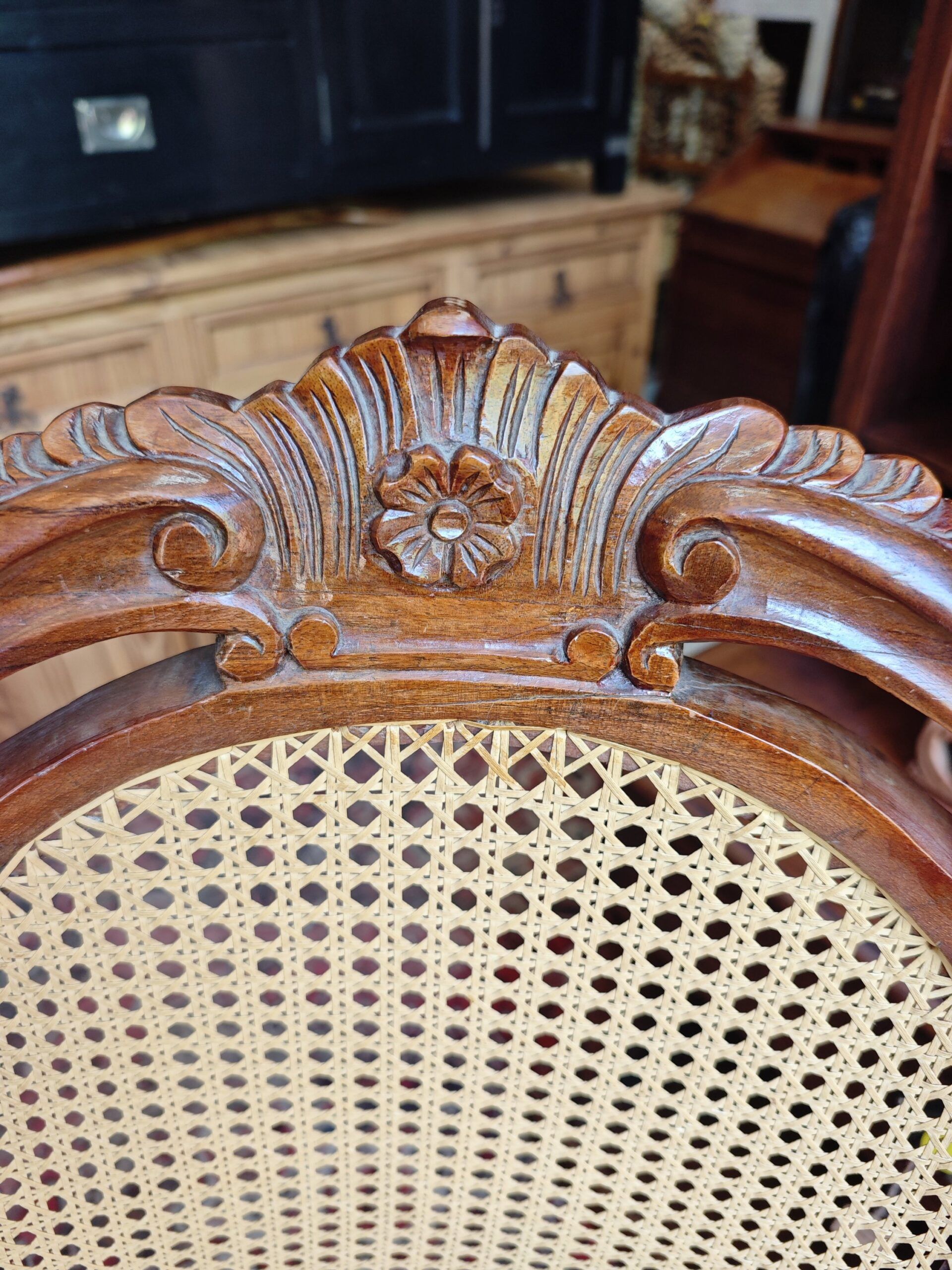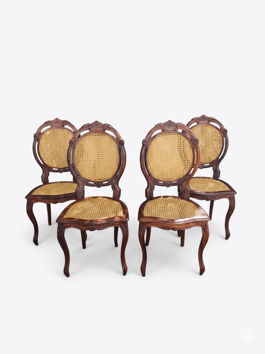Invertir en este set es apostar por la autenticidad. A diferencia de las imitaciones modernas, el nogal es una madera dura que mantiene su valor y belleza generación tras generación. El trabajo de rejilla francesa permite que el aire circule, ofreciendo un confort térmico inigualable, mientras que las patas tipo cabriole con tallas florales en el copete reafirman su estatus como piezas de colección.