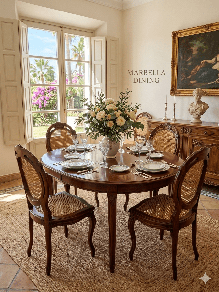 Comedores de Lujo: Rodeando una mesa de comedor de madera noble o incluso bajo una lámpara de araña de cristal para un look de mansión europea.