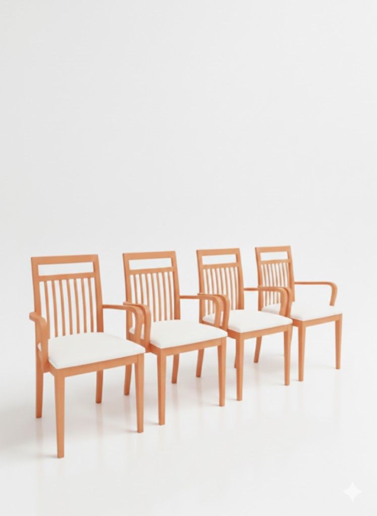 Este conjunto de cuatro sillas de madera de haya combina diseño clásico y comodidad, con respaldo de listones verticales, reposabrazos curvos y cojines beige que aportan frescura y contraste. La estructura robusta y el acabado natural de la madera las convierten en piezas versátiles, ideales tanto para interiores como para espacios exteriores cubiertos.