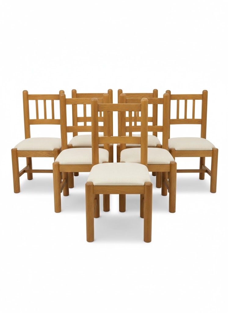 Estas sillas rústicas están fabricadas en madera sólida, ofreciendo una estructura robusta y duradera ideal para el uso diario. El diseño del respaldo, formado por barrotes verticales y horizontales, añade un toque artesanal y clásico, evocando la calidez de los muebles tradicionales. El asiento tapizado en tela beige proporciona comodidad y armoniza fácilmente con cualquier decoración.