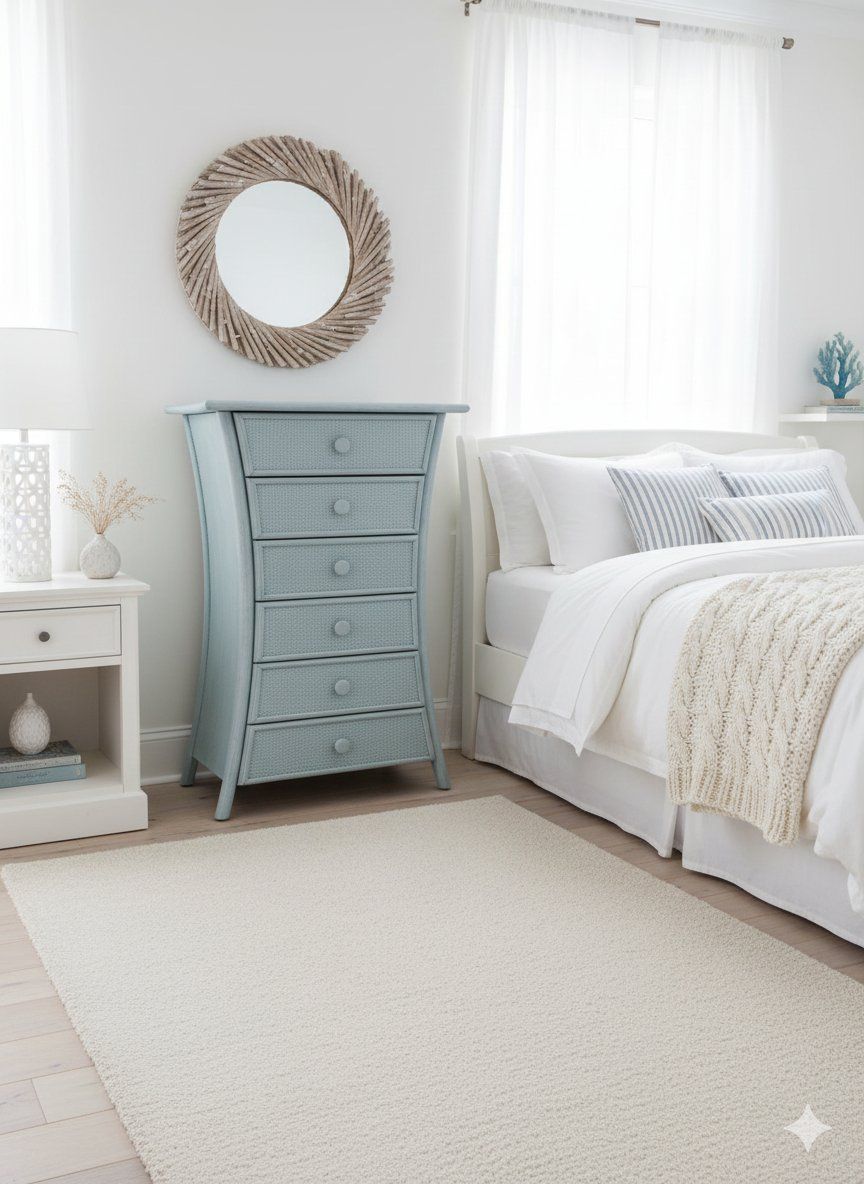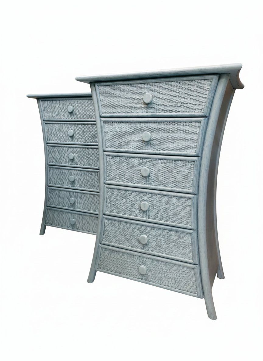 Sinfonier de madera y ratán con 6 cajones. Acabado azul claro con textura trenzada. Medidas: 120 cm alto × 60 cm ancho × 40 cm fondo. Ideal para dormitorios y espacios naturales.