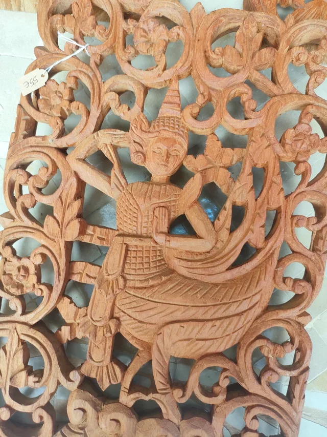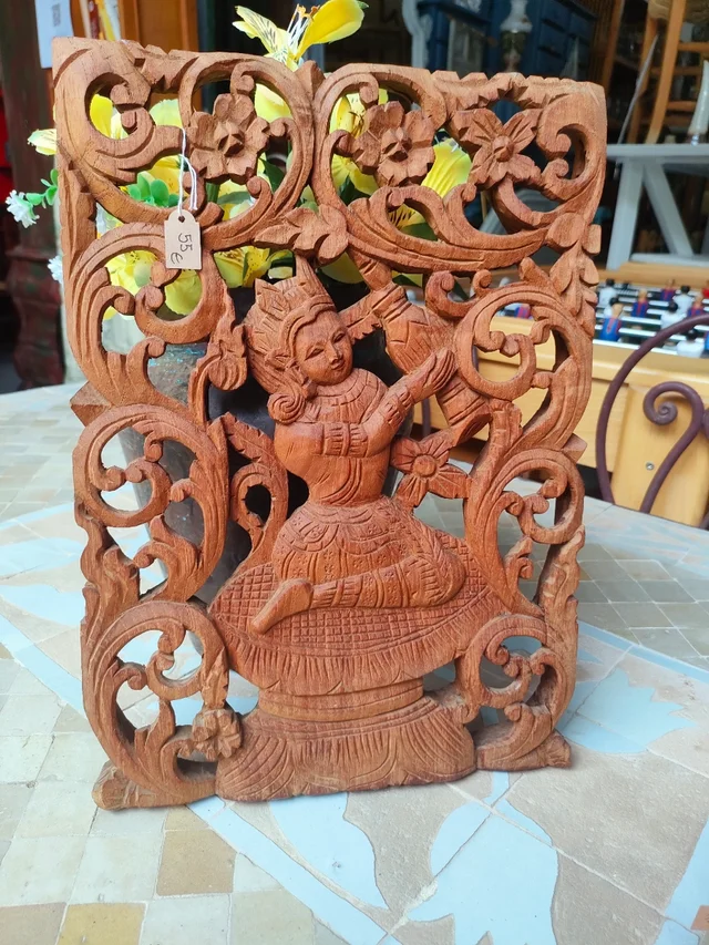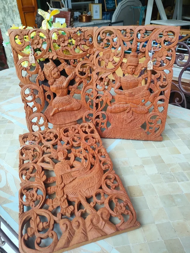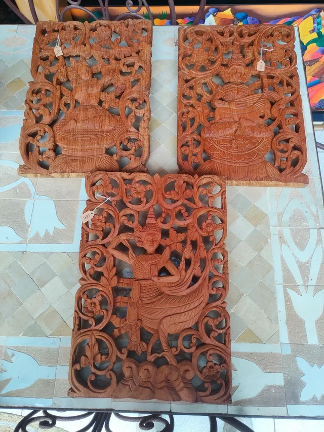 Exclusivo conjunto de tres tallas de madera procedentes de Bali, Indonesia, que representan escenas tradicionales de la cultura local. Cada pieza ha sido elaborada de forma totalmente artesanal y tallada a mano, lo que garantiza que no existan dos figuras idénticas. El acabado resalta la belleza natural de la madera, mostrando detalles minuciosos en las vestimentas y posturas de los personajes. Estas piezas son un exponente del arte étnico oriental, conservando las técnicas de tallado transmitidas por generaciones de artesanos balineses. Su diseño vertical y la calidez de la madera las convierten en elementos decorativos de gran valor visual para ambientes de estilo colonial, étnico o ecléctico.