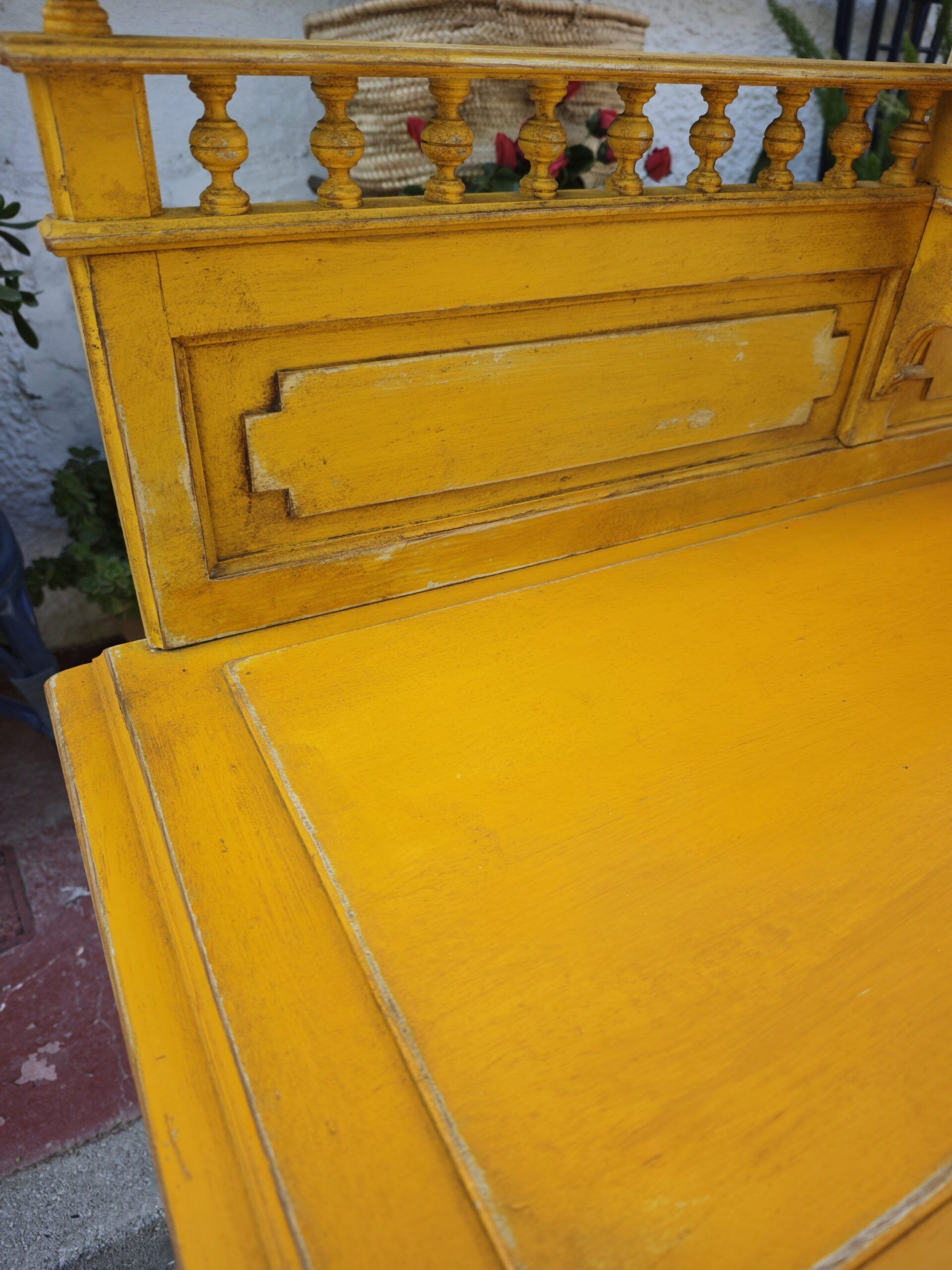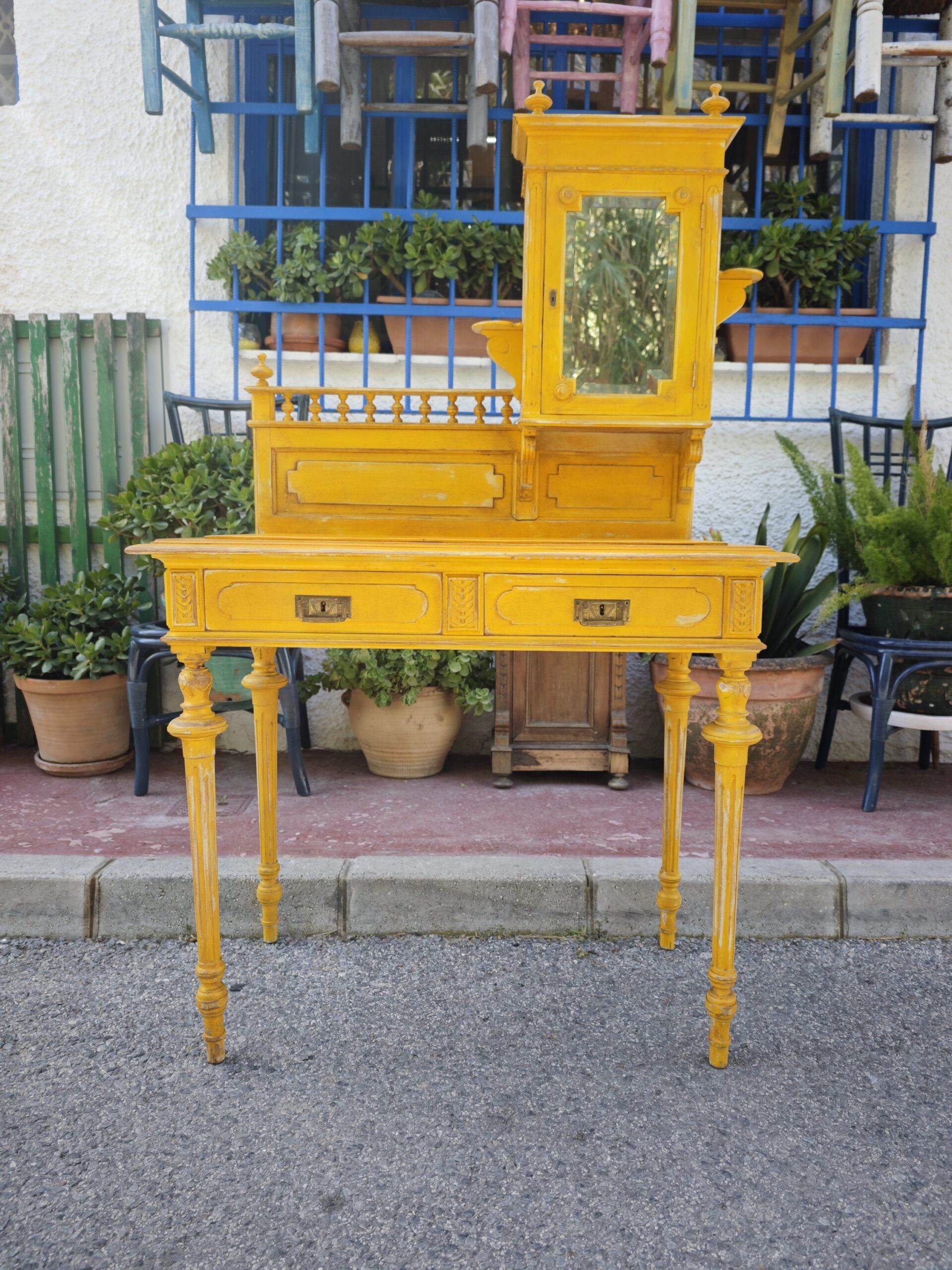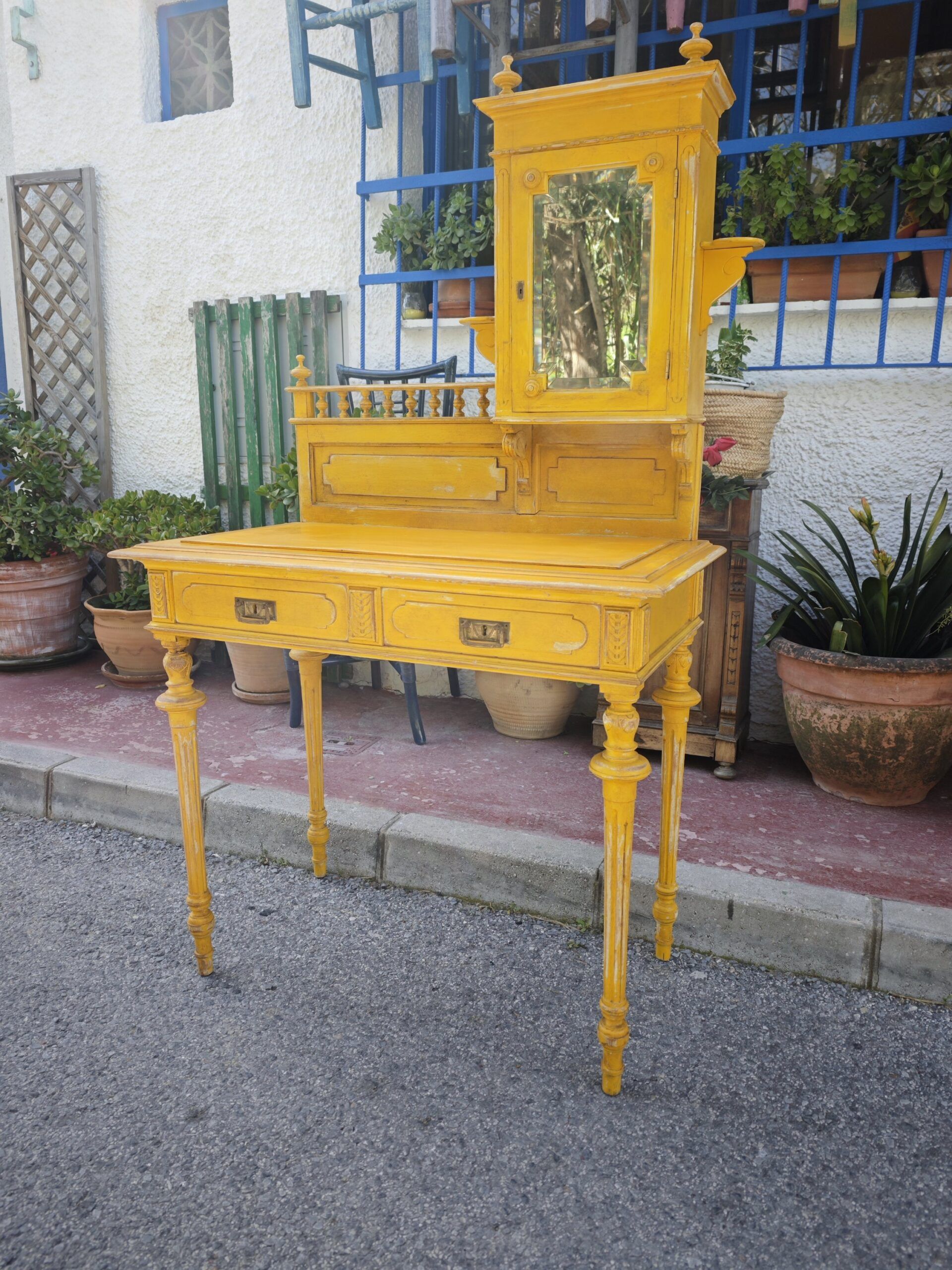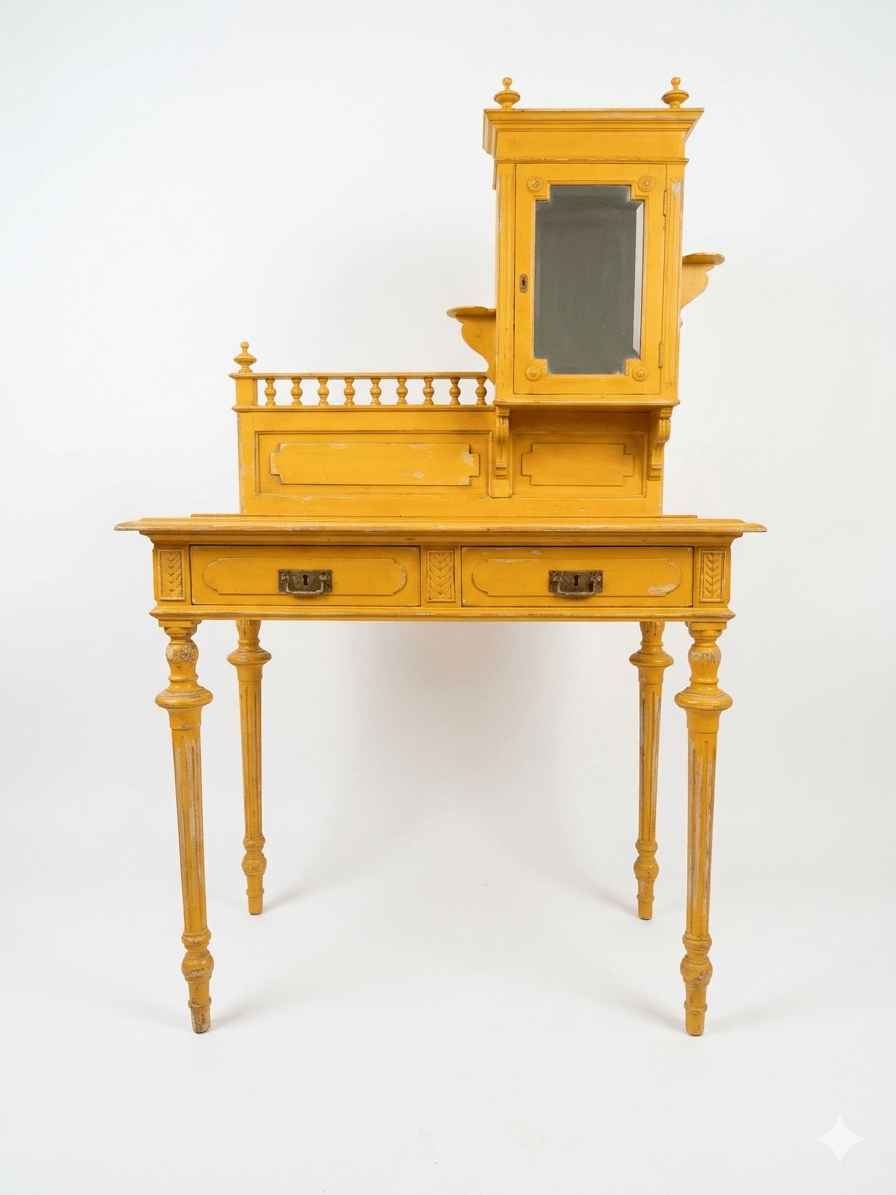 Este excepcional tocador eduardiano es una pieza auténtica de finales del siglo XIX o principios del XX, conocida tradicionalmente como Bonheur du Jour. Su diseño asimétrico es una rareza en el mercado de antigüedades, presentando una alzada que combina una delicada vitrina con espejo y una galería superior de balaustres torneados. Fabricado en madera maciza, el mueble ha sido actualizado con un acabado en amarillo mostaza decapado, que resalta sus formas clásicas dándole una nueva vida perfecta para el interiorismo contemporáneo.