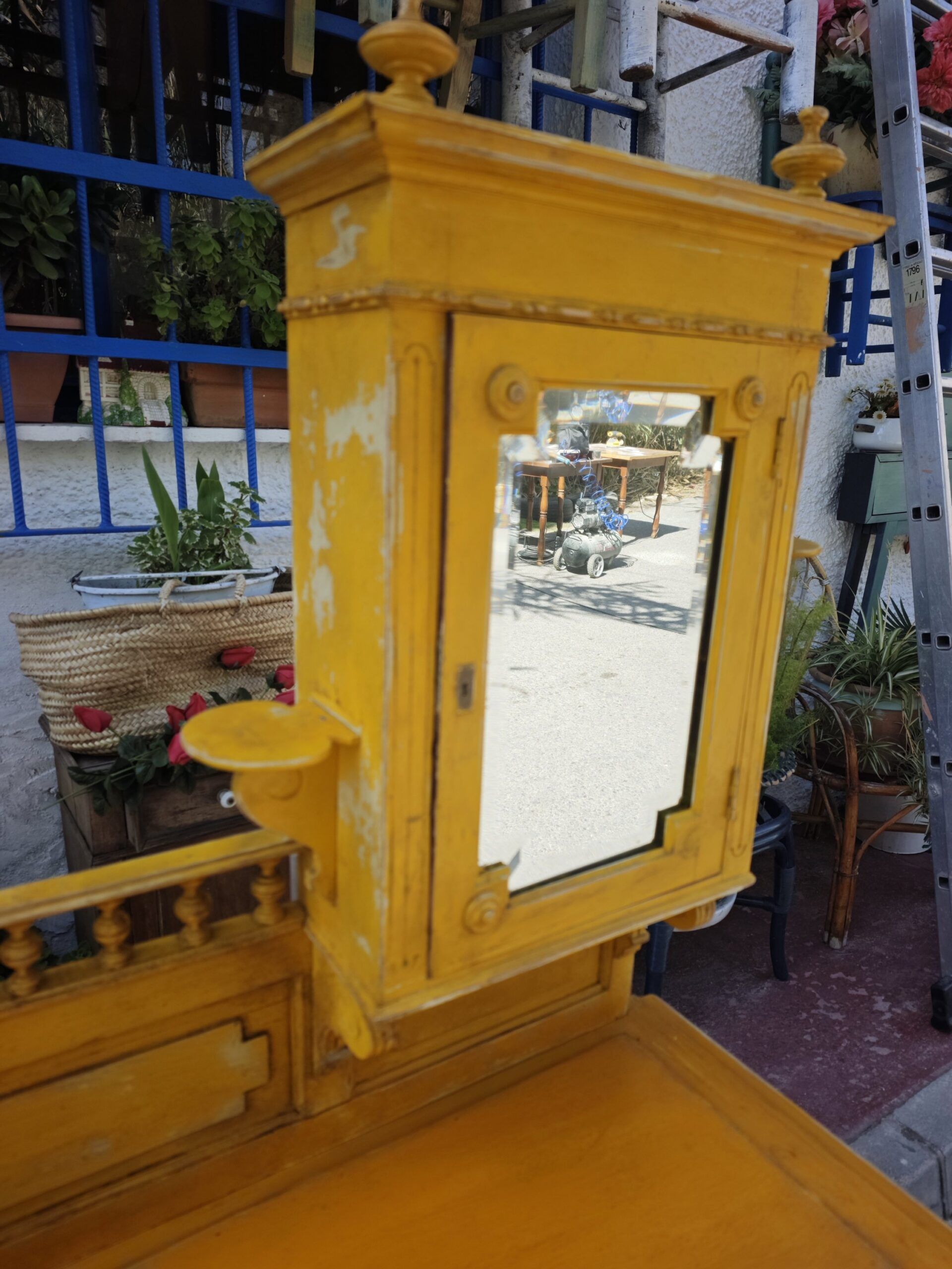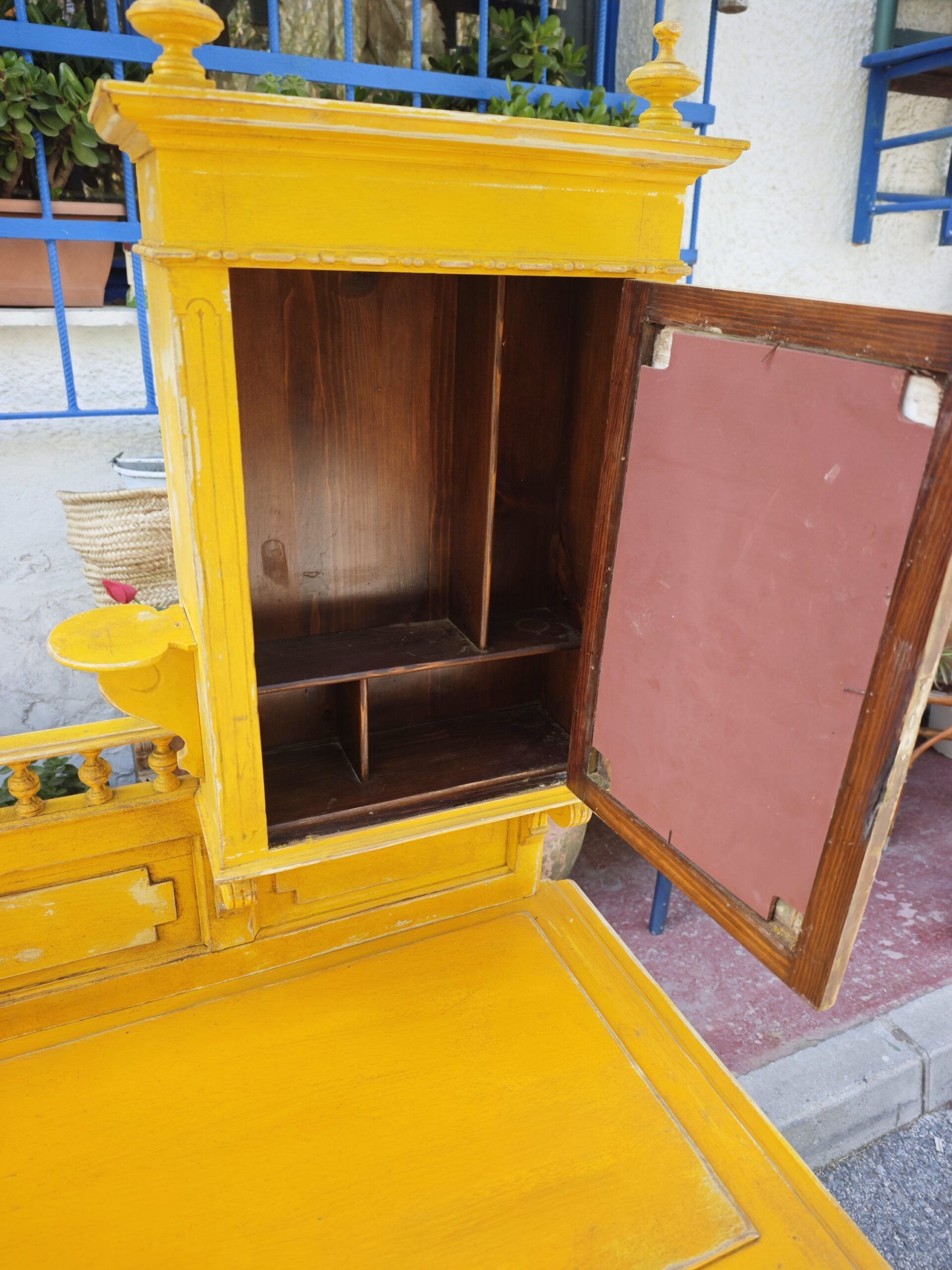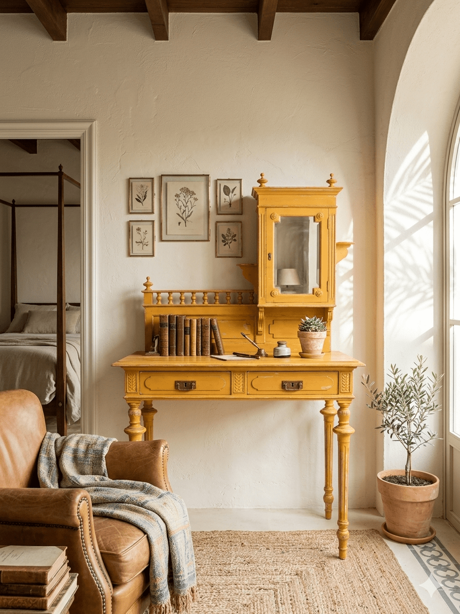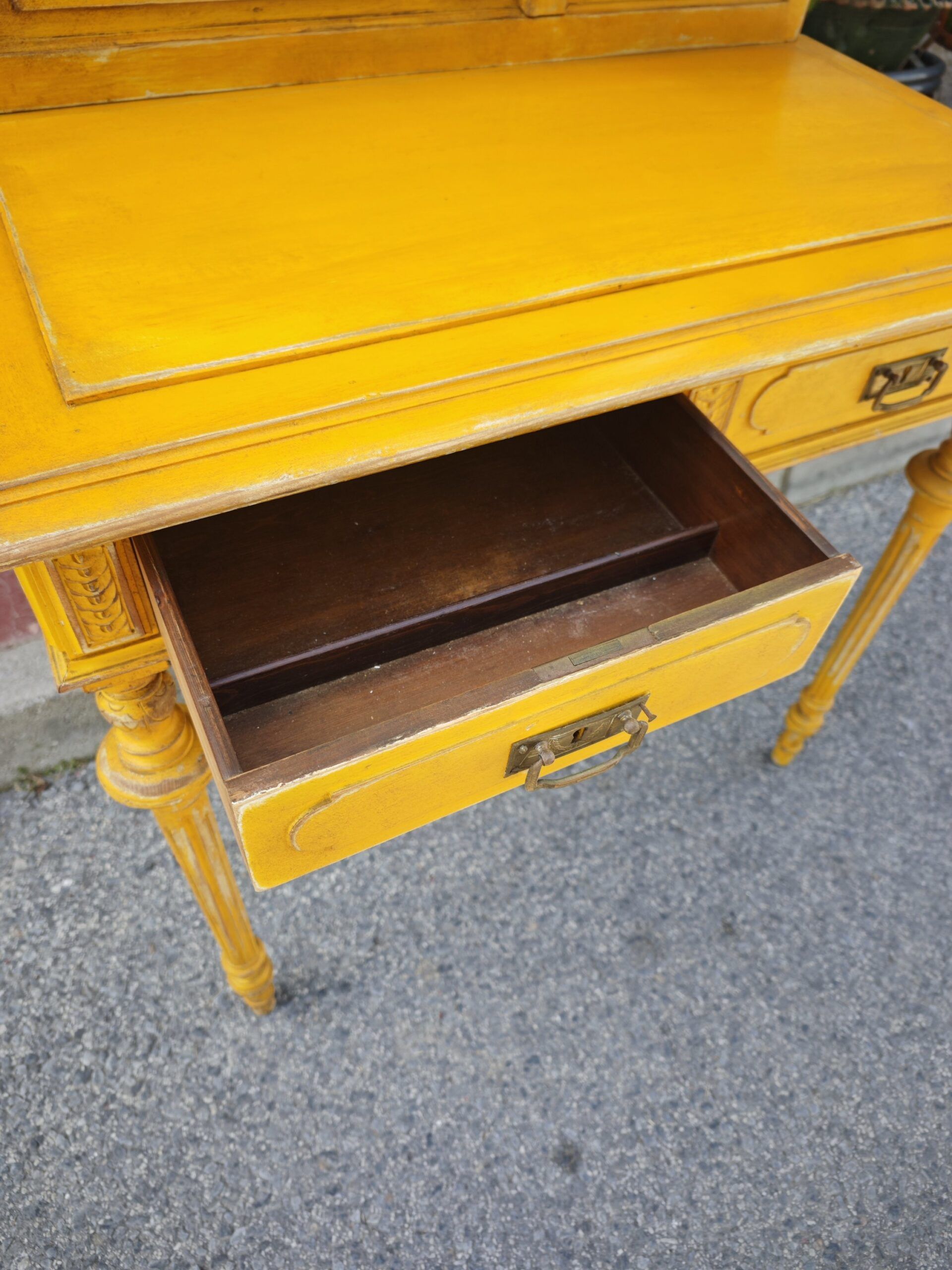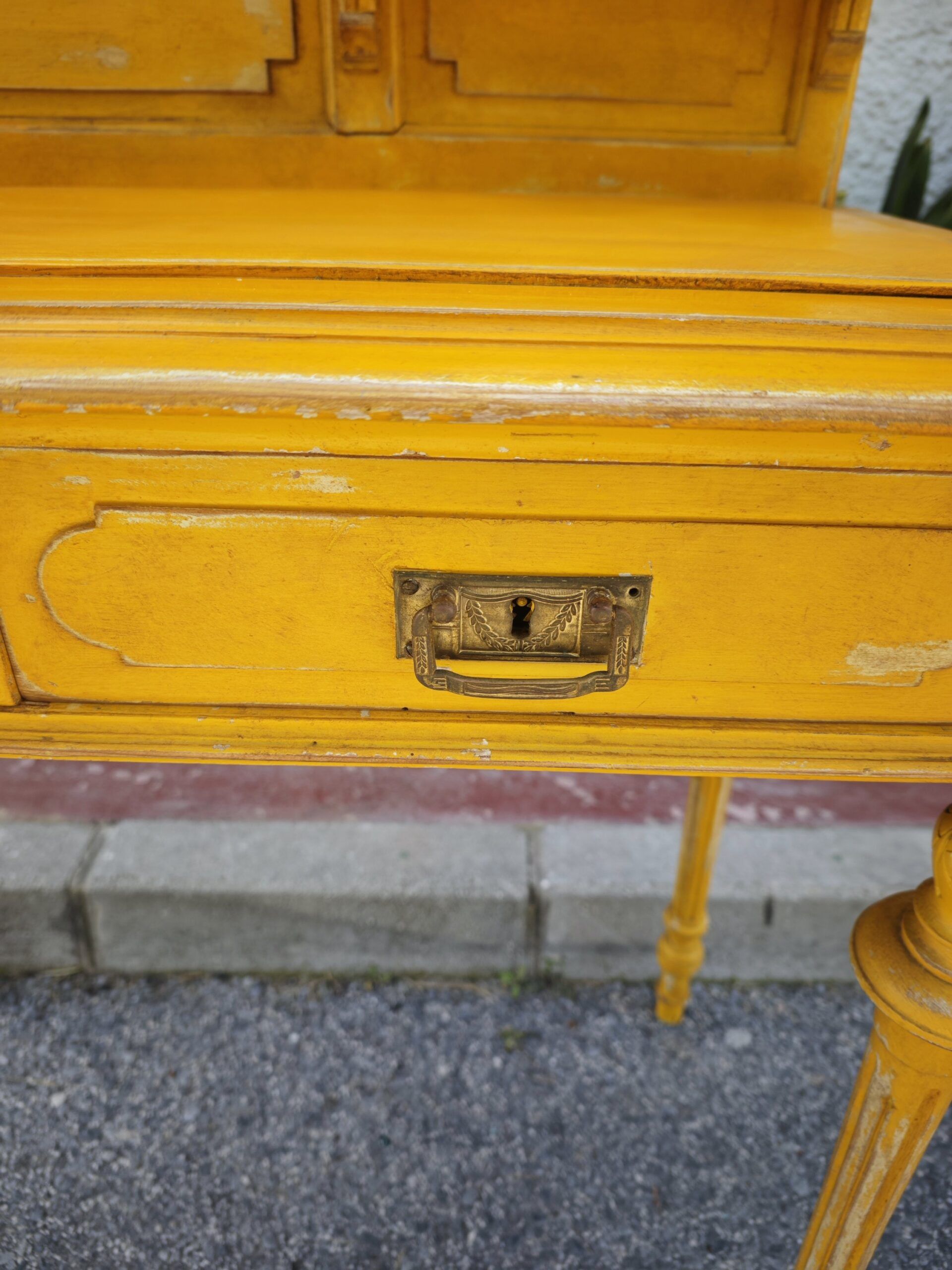 Este excepcional tocador eduardiano es una pieza auténtica de finales del siglo XIX o principios del XX, conocida tradicionalmente como Bonheur du Jour. Su diseño asimétrico es una rareza en el mercado de antigüedades, presentando una alzada que combina una delicada vitrina con espejo y una galería superior de balaustres torneados. Fabricado en madera maciza, el mueble ha sido actualizado con un acabado en amarillo mostaza decapado, que resalta sus formas clásicas dándole una nueva vida perfecta para el interiorismo contemporáneo.